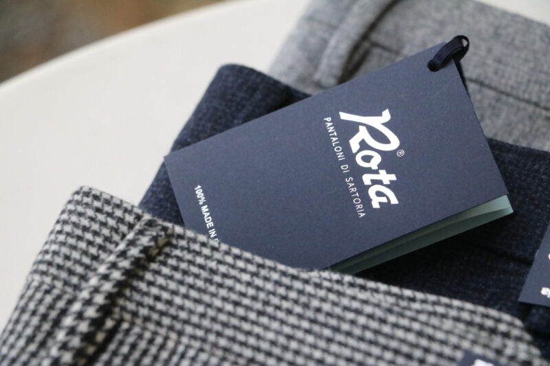 創業以来一貫して「着心地、シルエット、素材の良さ」とそして、 「100%メイドインイタリー」を追求した物作りを行っています。クラシコ・イタリア協会に加盟しているパンツファクトリーであり、屈指の技術を持ち、そしてパンツ作りの真面目な姿勢から数々の有名ブランドのパンツ製造を請け負っているイタリアを代表するパンツブランド【Rota/ロータ】。