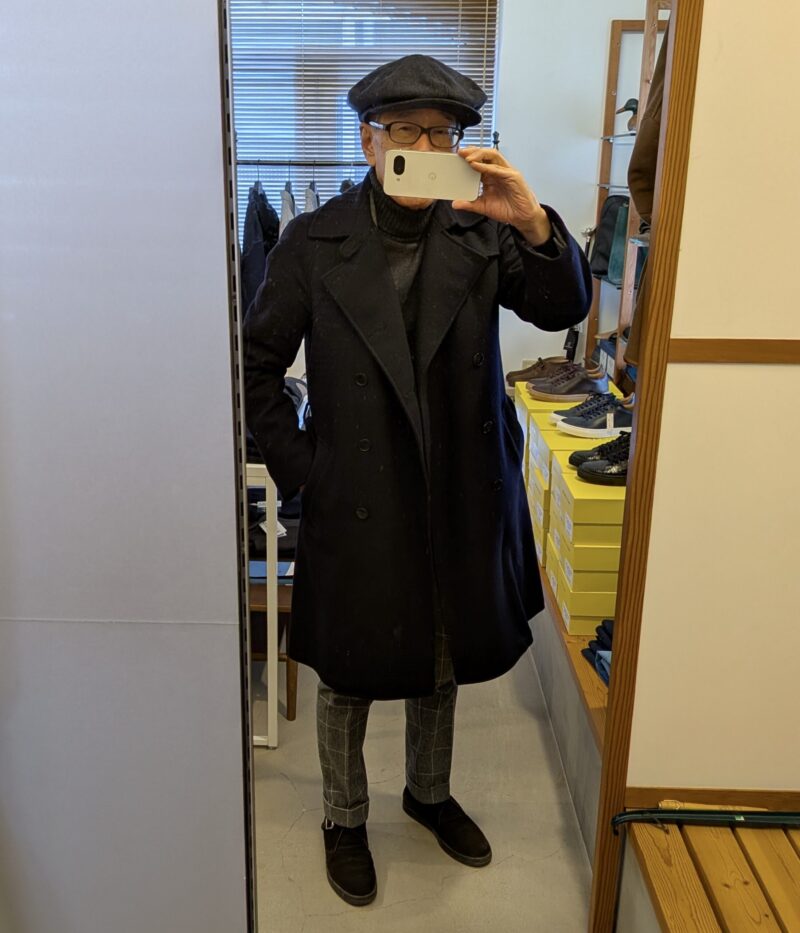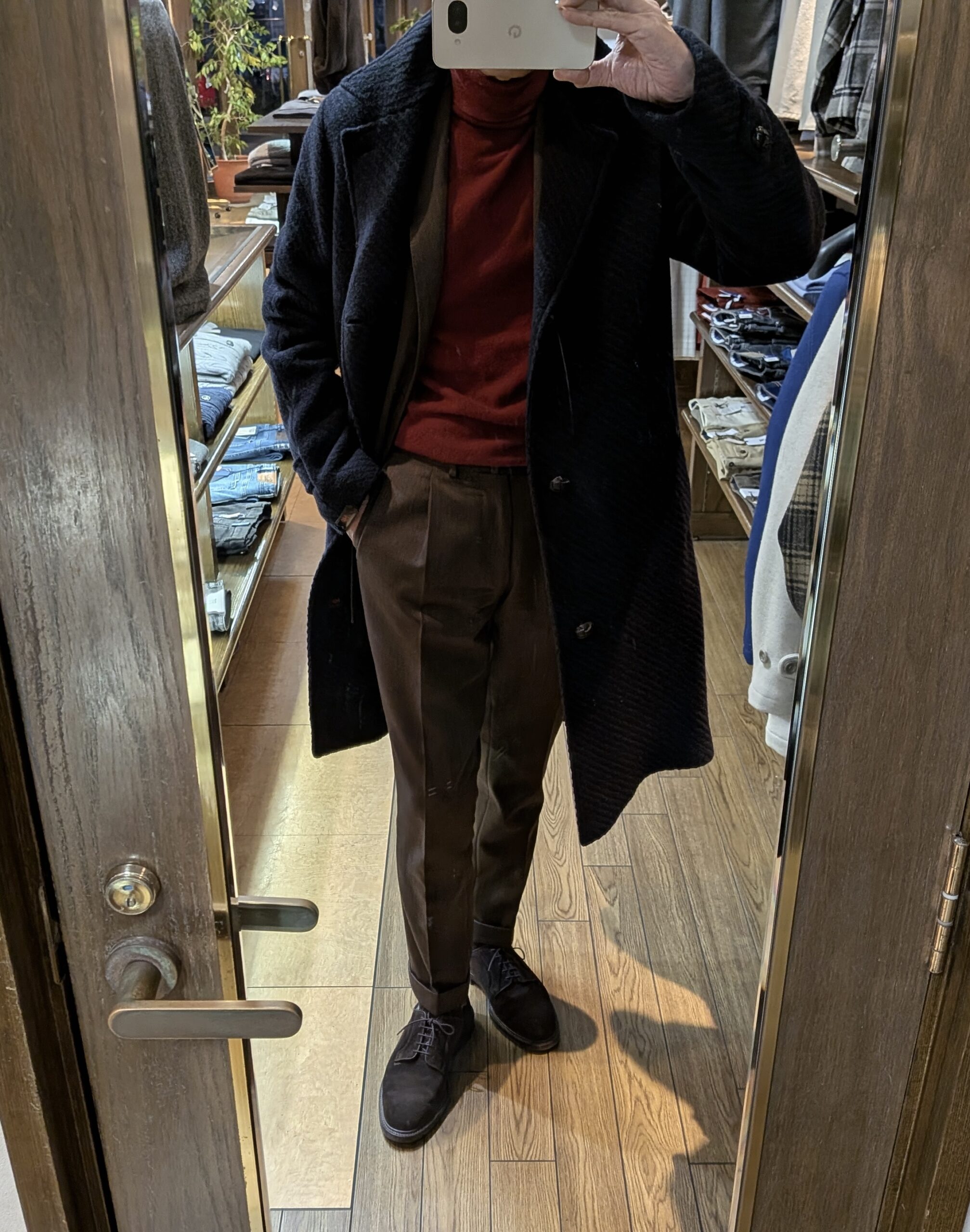 お客様が途切れた夕方、はいポーズです。羽織ったのは、MASSIMO PIOMBO/マッシモ・ピオンボのダイヤゴナル柄ウールオーバーコート。今回のPITTI だけではなく、イタリア人が好んで着ているコートです。前回、改めてご提案させていただいたところ、サイズ50はS様の元へ。マイサイズの46は健在です。ただ、ネイビー系のコートが多いだけに、迷うところです。