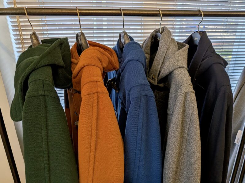 左のグリーンはGLENMORE/グレンモア、オレンジとロイヤルブルーはINVERTERE/インバーティア(未公開)、グレイとネイビーのダッフルコートはWhiteley&Green/ホワイトリーアンドグリーンのものになります。