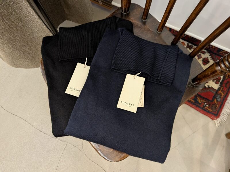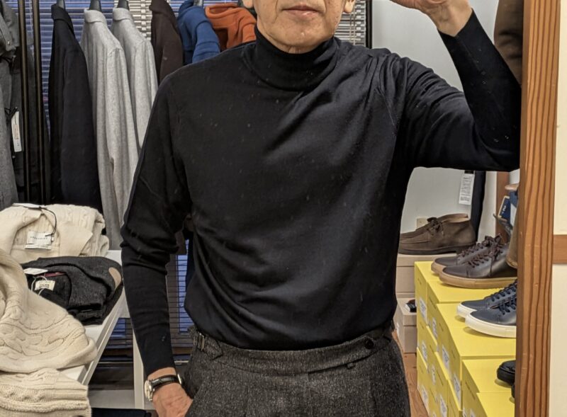 何か白いものが…鏡が汚れている?明日は店番兼ねて掃除しなければです。話を戻しましょう。着用したのは、【SUNSPEL/サンスペル】のタートルネックです。見るからに柔らかく、着て納得の肌触りです。1860年の創業以来、高品質の天然素材を使用しワンランク上のワードローブの基本となる美しい日常着を作り続けている【SUNSPEL/サンスペル】。肌に触れるやわらかさと軽さが魅力です。重ね着をするインナーとしての役割を十分果たしているのは、素材の良さはもちろん着丈の長さ。暖かさはもちろん、タックインした場合、イタリアのニットにはない安定感があります。さらに嬉しいのは、ウォッシャブルウール。日常使いするには外せない条件ですね。