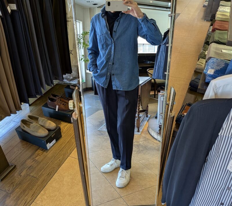 Salvatore Piccolo/サルヴァトーレ・ピッコロのシャツに穿いていました。フランスデニムとの相性は抜群です。このデニムはカシェートで展開。ブルーデニムはサイズ欠けしておりましたが、ホワイトデニムはサイズが揃っていたはずです。