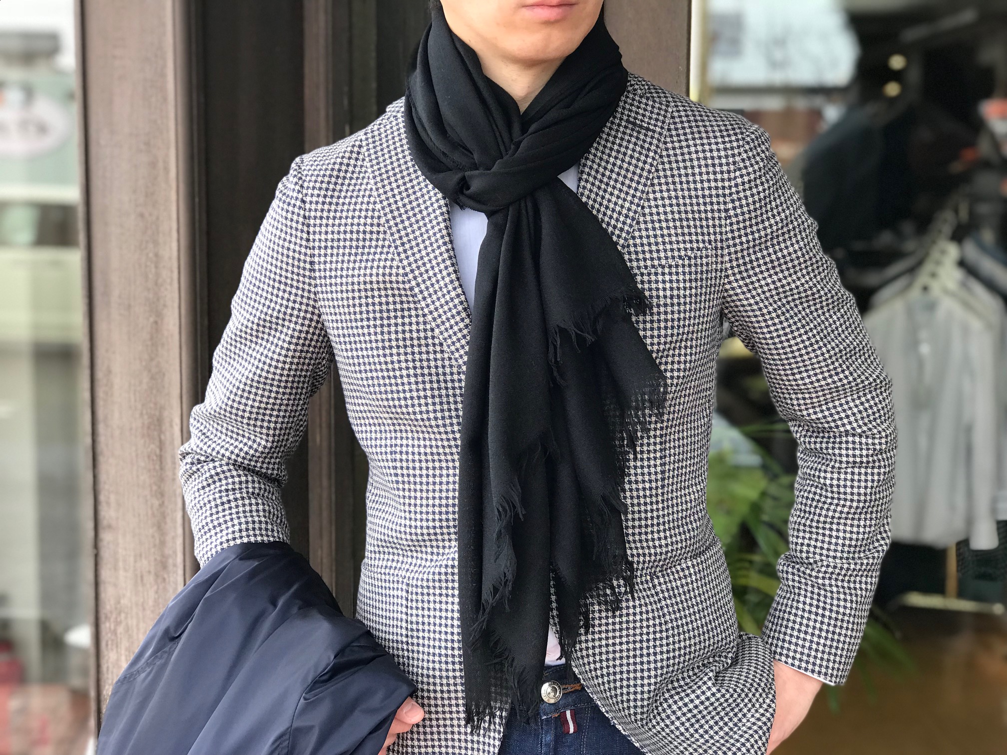 MODEL:「Tonal Block Check Scarf」ペールトーンブロックチェックストール