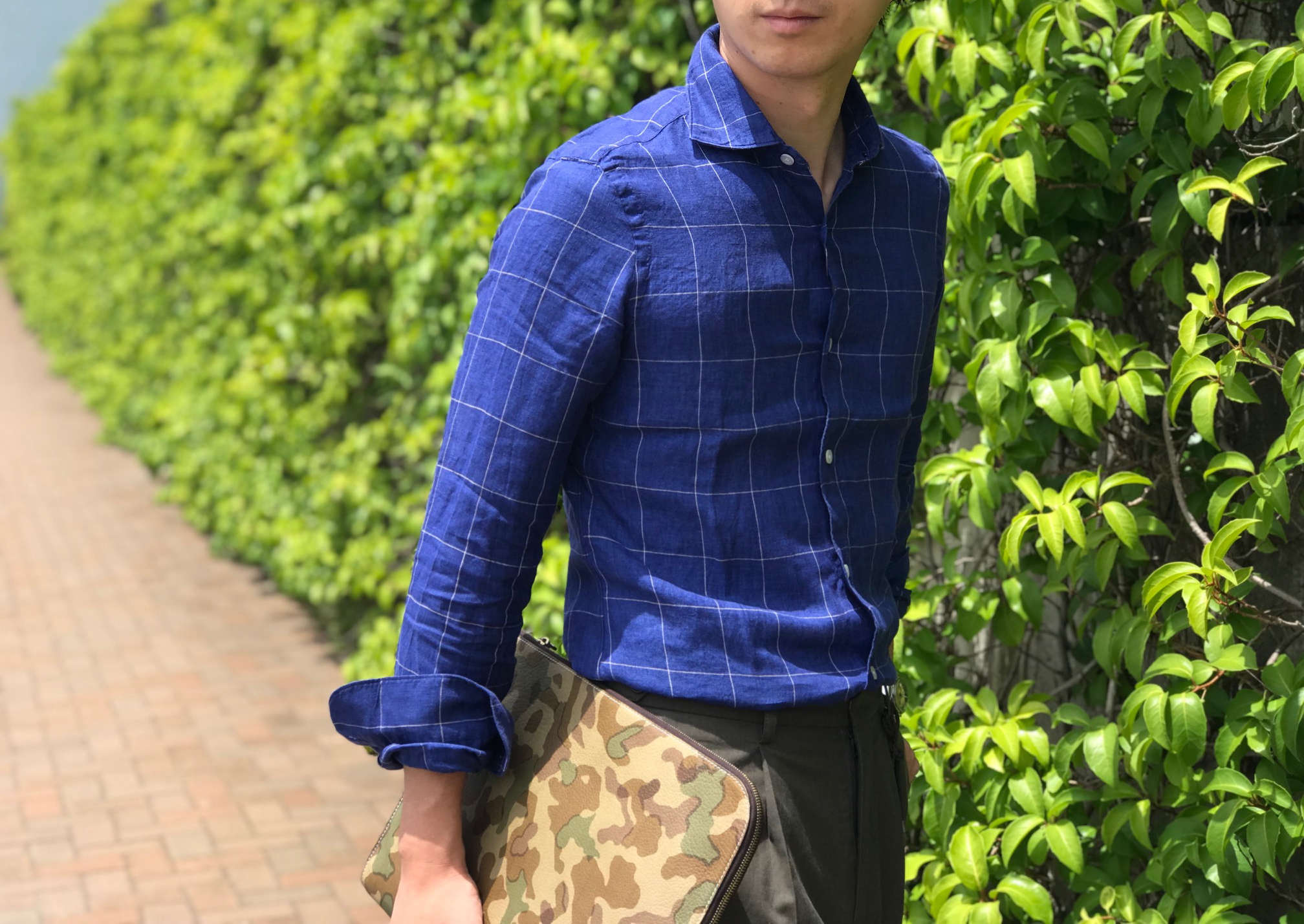 MODEL:「LUIGI」リネン ウィンドウペン柄ブルーシャツ