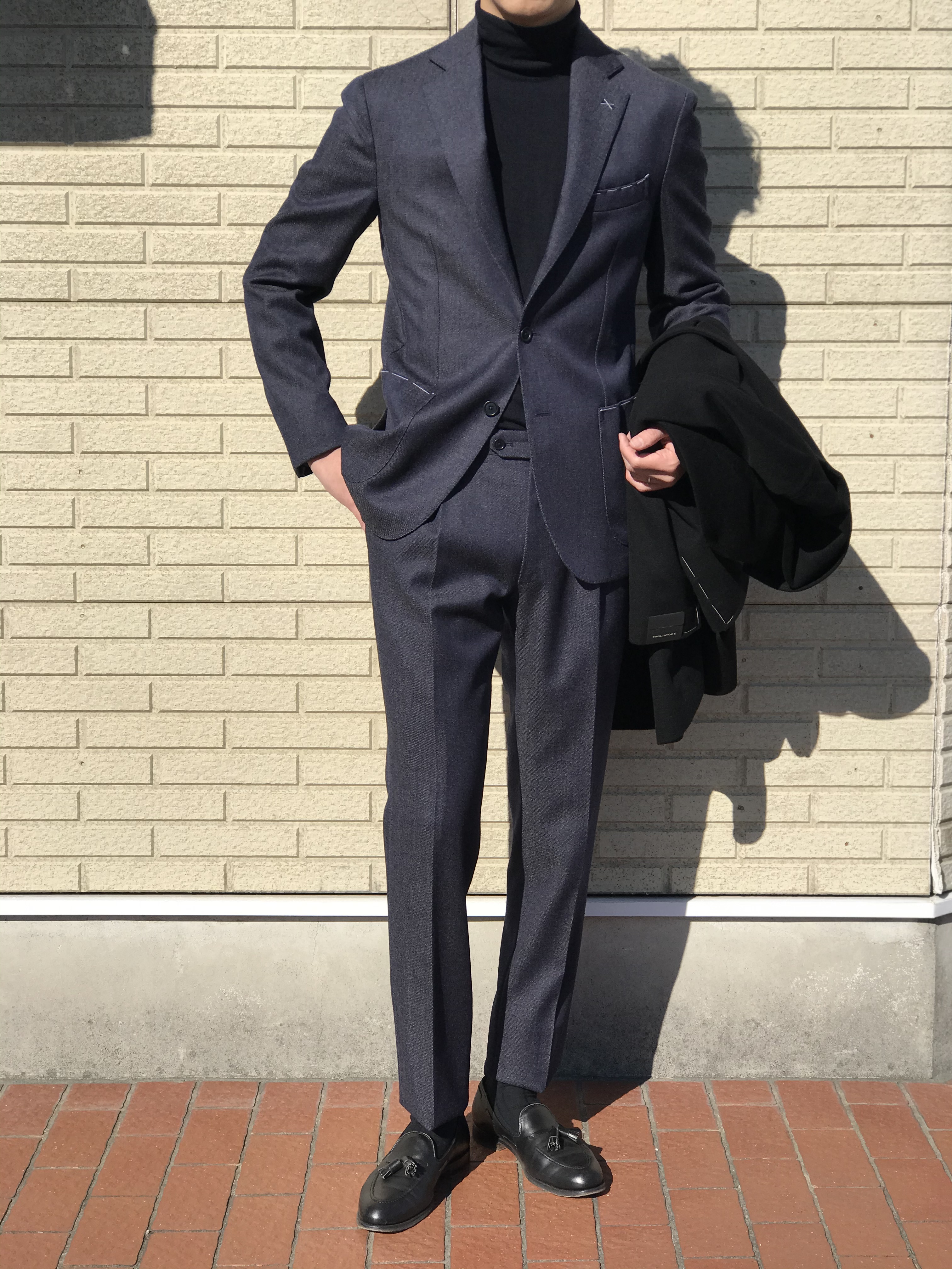 お持ちの方も多いだろう、ネイビーのタートルネックです。