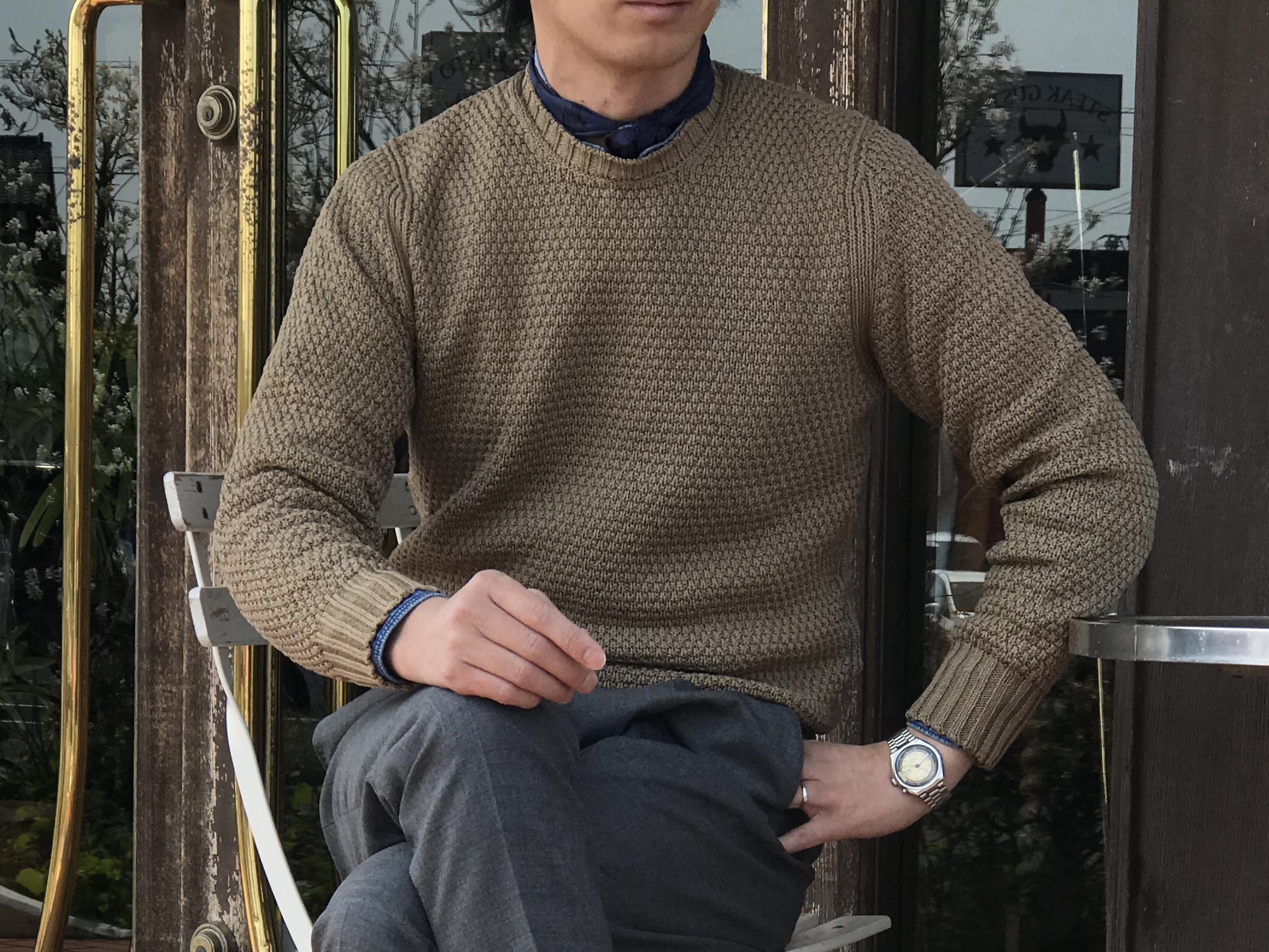 N:でしょ。クルーネックでシンプルだけど、編み方に存在感があって