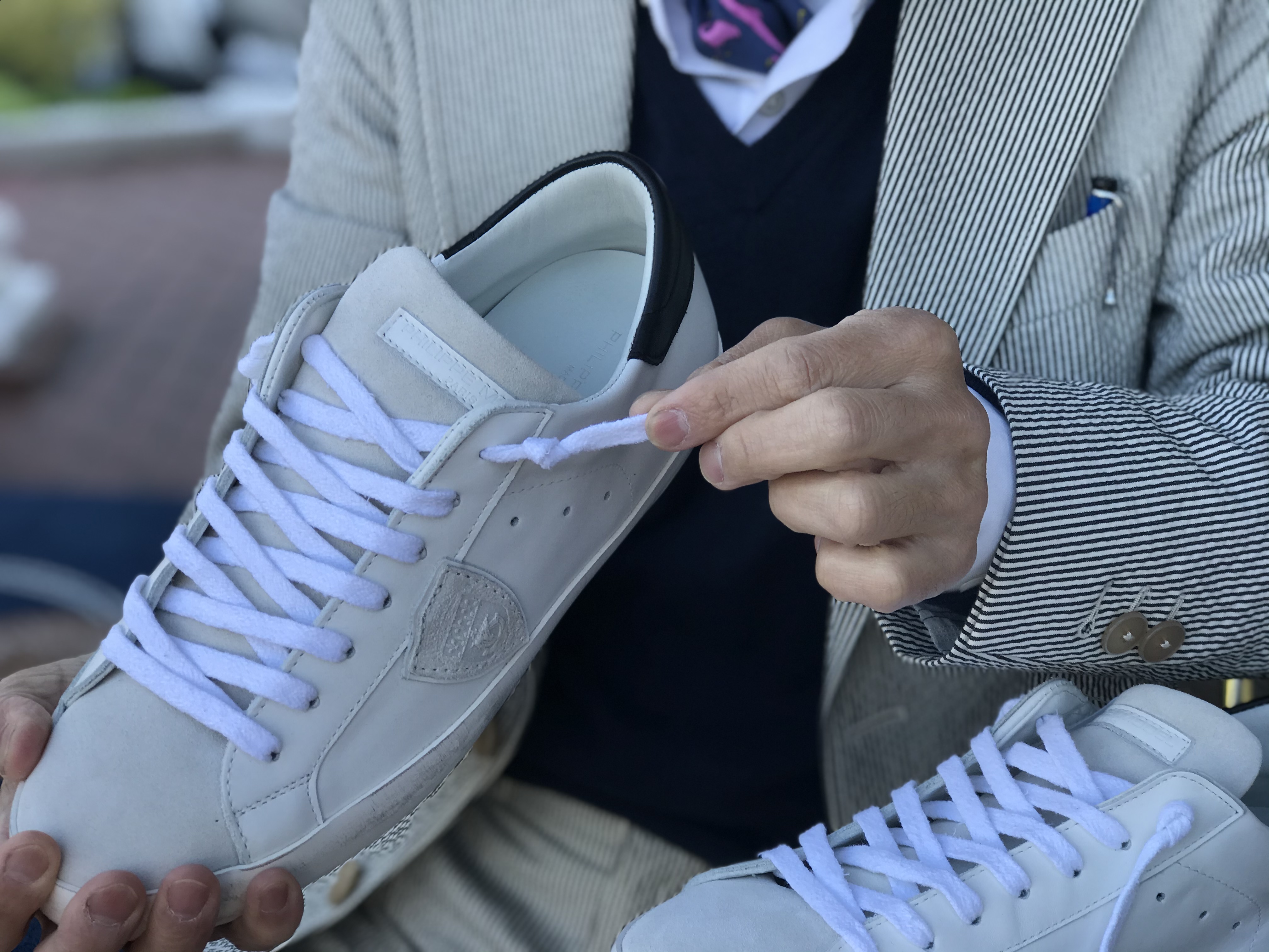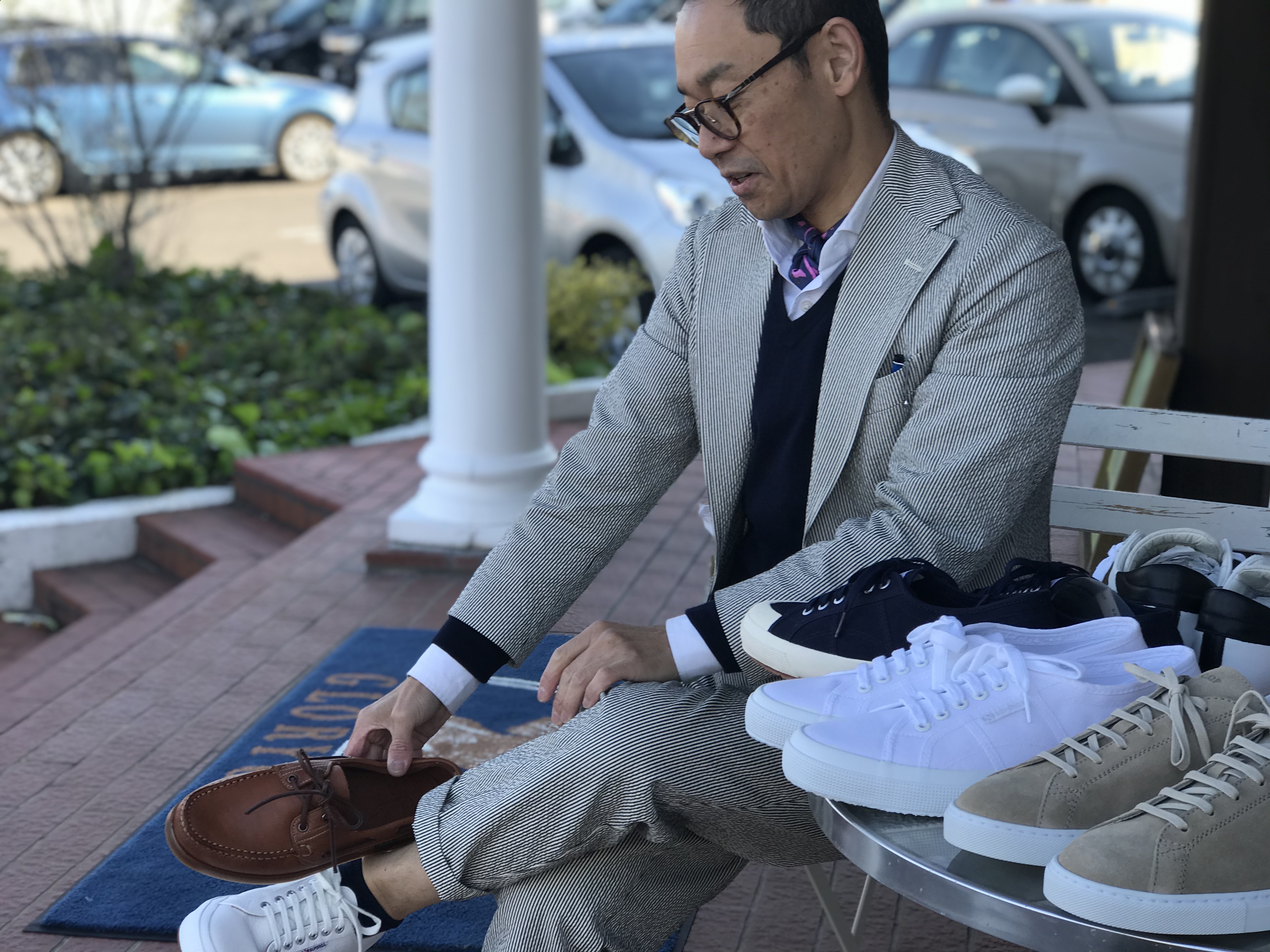 スーツにスニーカーって、意外と難易度高めですよね。