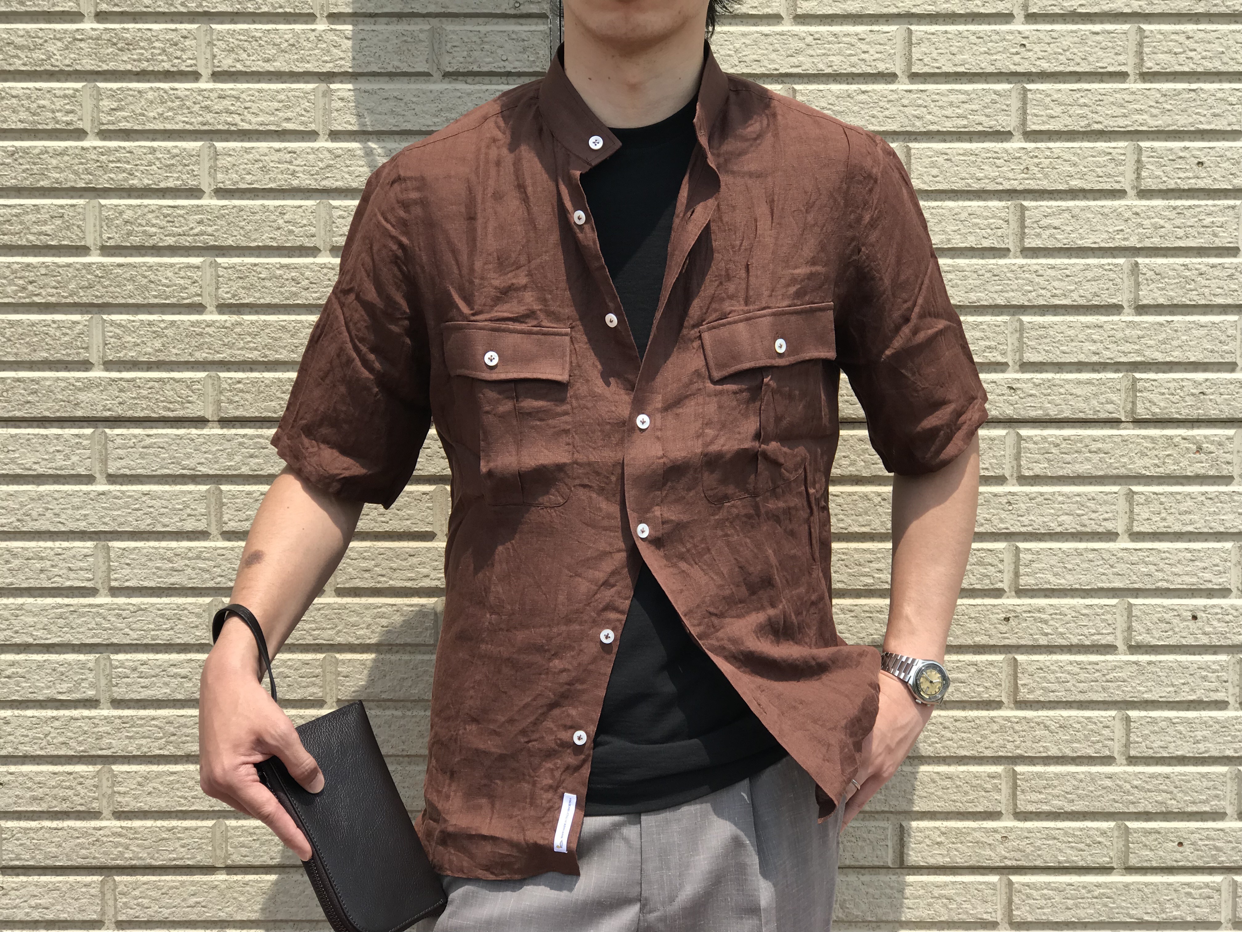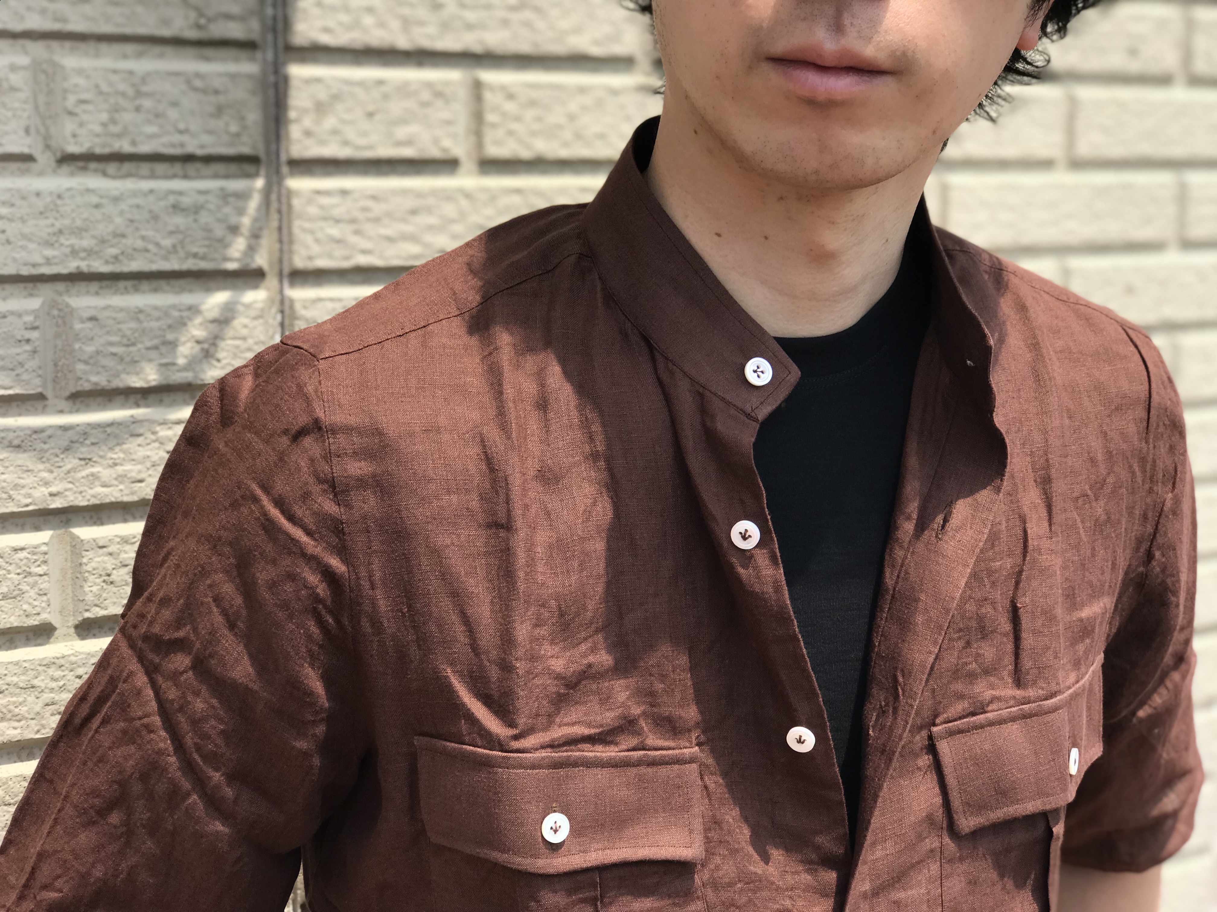 【Mario Muscariello】スタンドカラー胸ポケット付きリネンシャツ