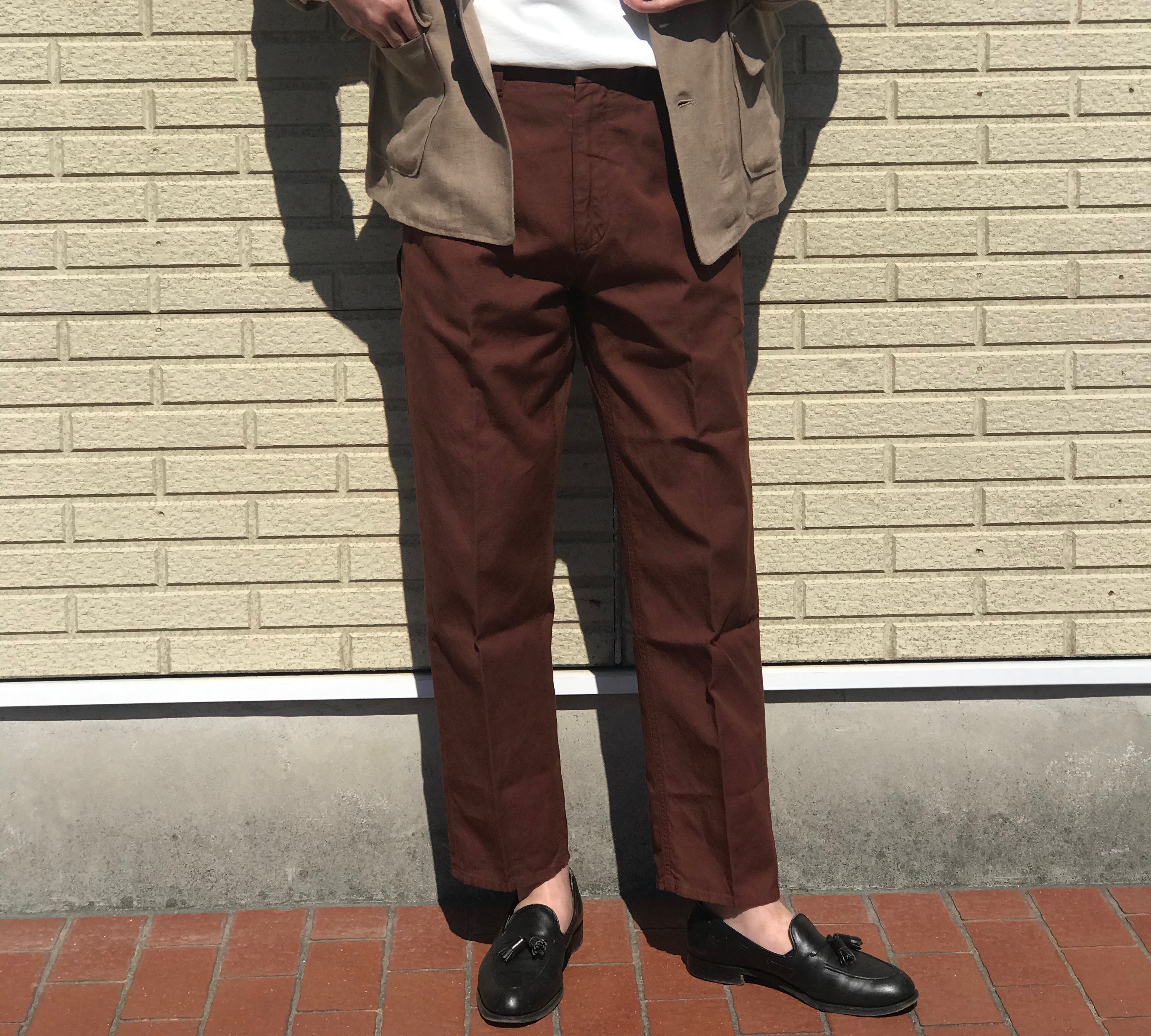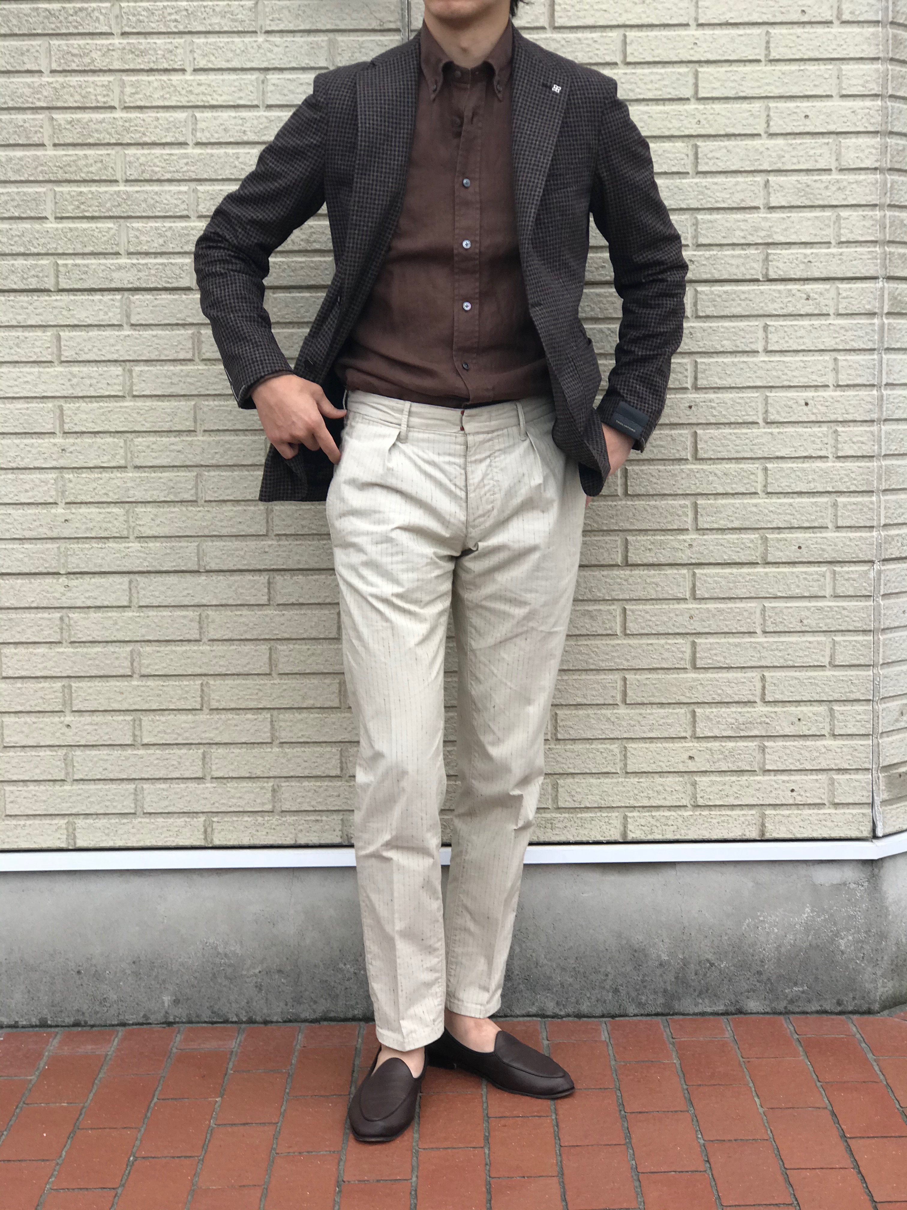 ブラウンのジャケットは、カプリシャツの"海感"を抑えてくれるので、