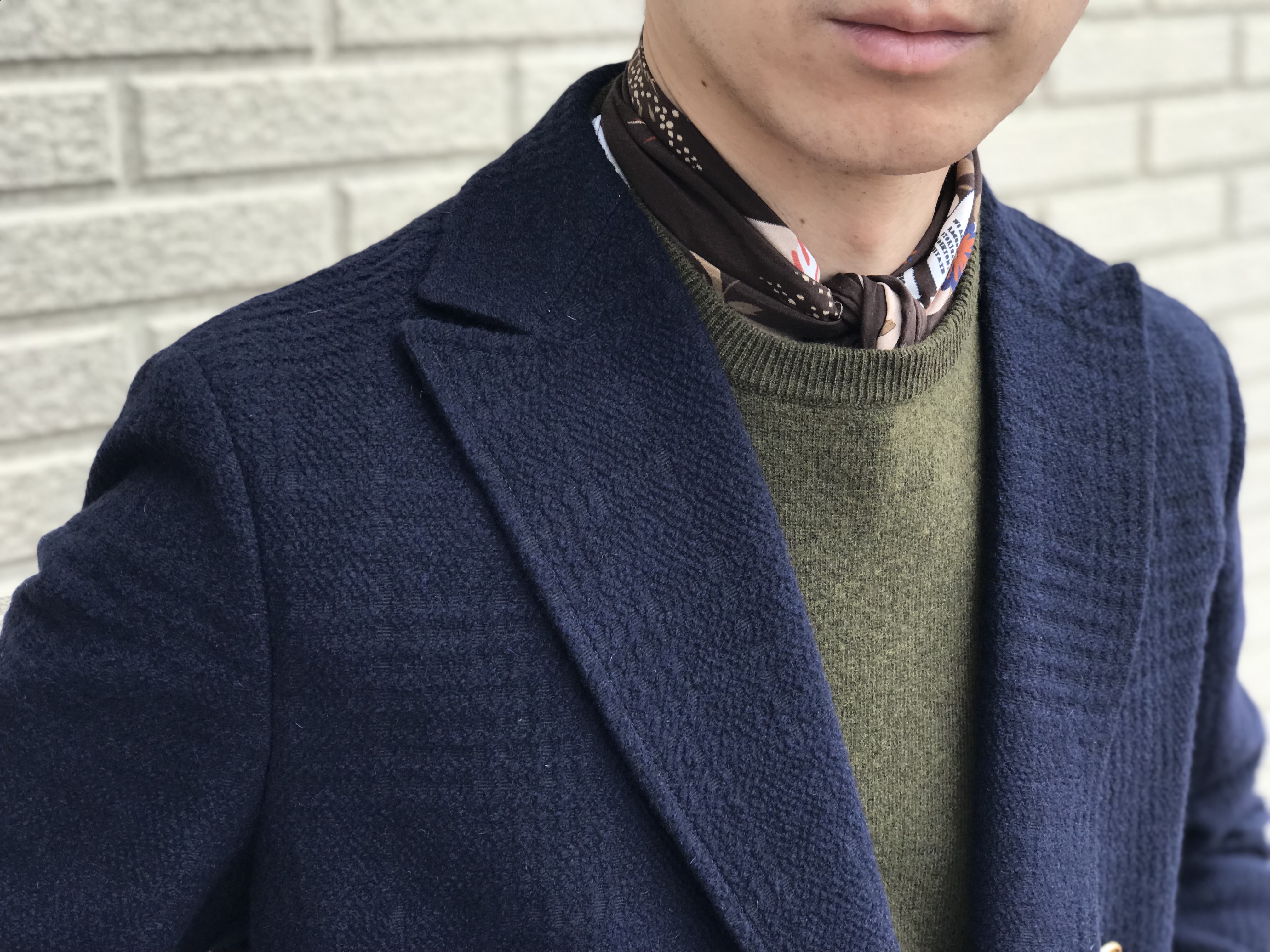 Vゾーンはシャツではなく、クルーネックのニットとネッカチーフ。