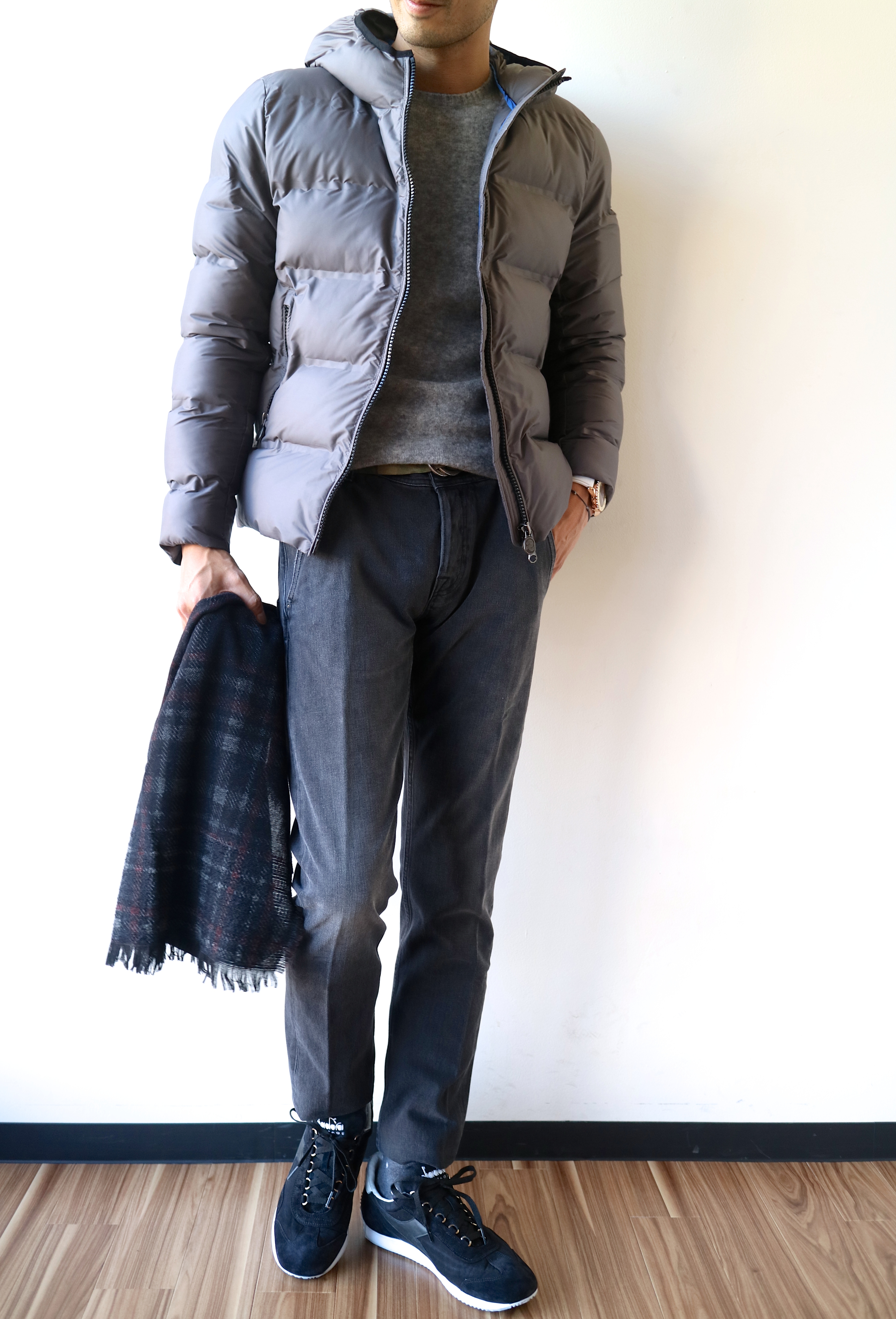 ベーシックなフーデットジャケット。艶感のないマットグレイは、ちょっぴり都会的な雰囲気も兼ね備えた表情が魅力。色味を抑え、グレイとブラックの濃淡でコーディネートを試みました。インにはPANICALEのクルーネック。気温が下がり、アウターに次いでニットが活発な動きを見せています。パンツはCare labelのブラックデニムに、スニーカーはdiadora。どちらも程良い色落ち感に惹かれます。その他の合わせは、ベルトがD'AMICO、ストールがALTEAです。