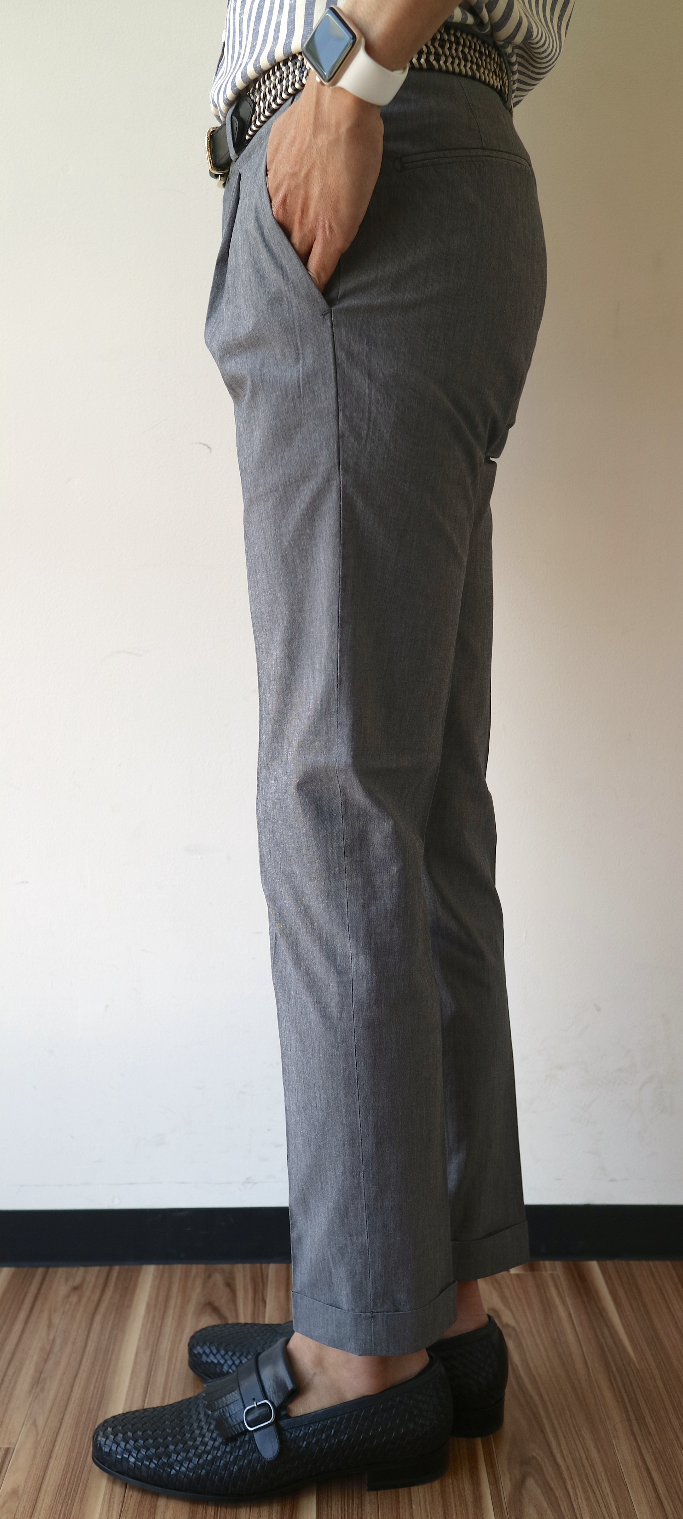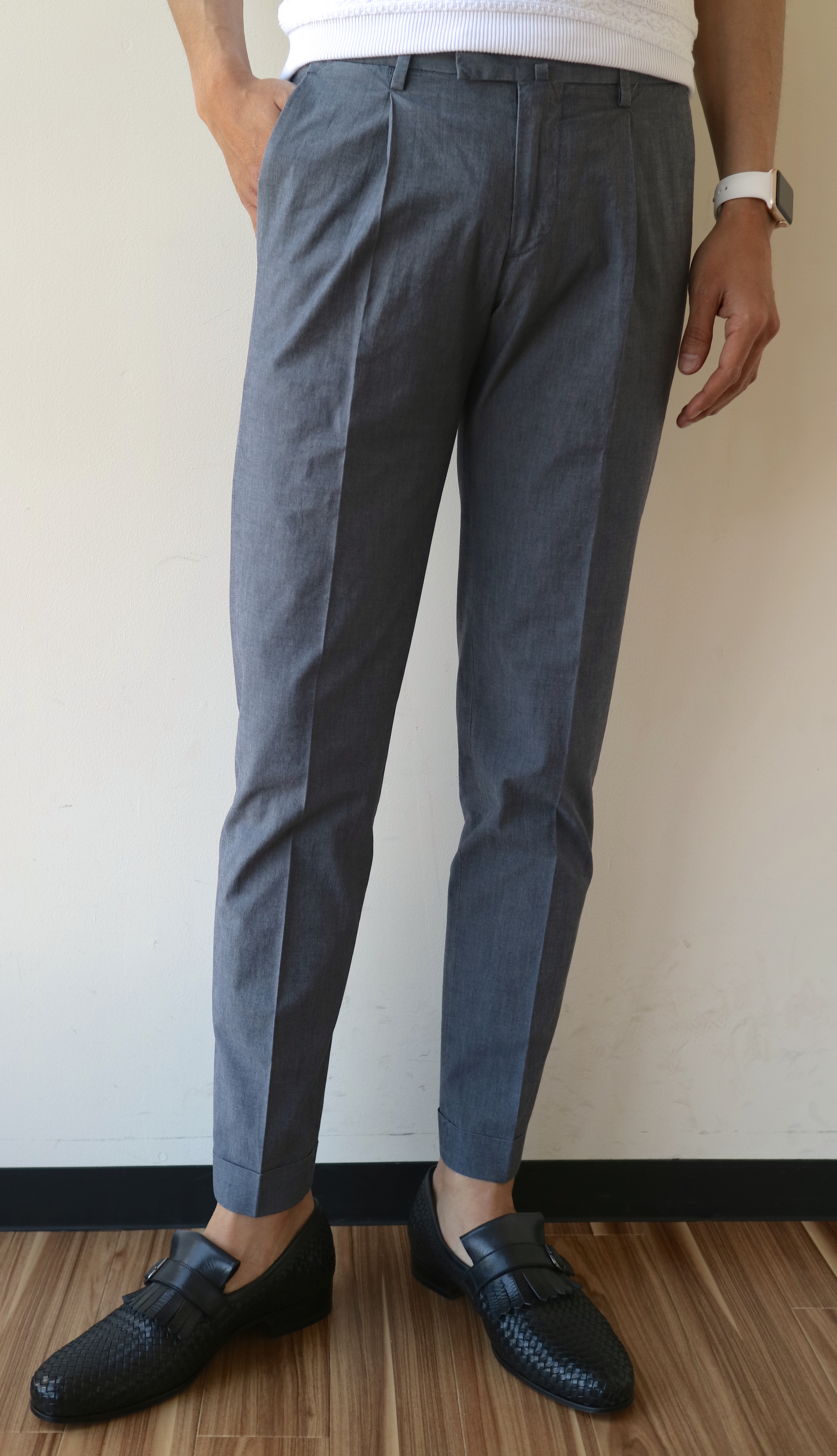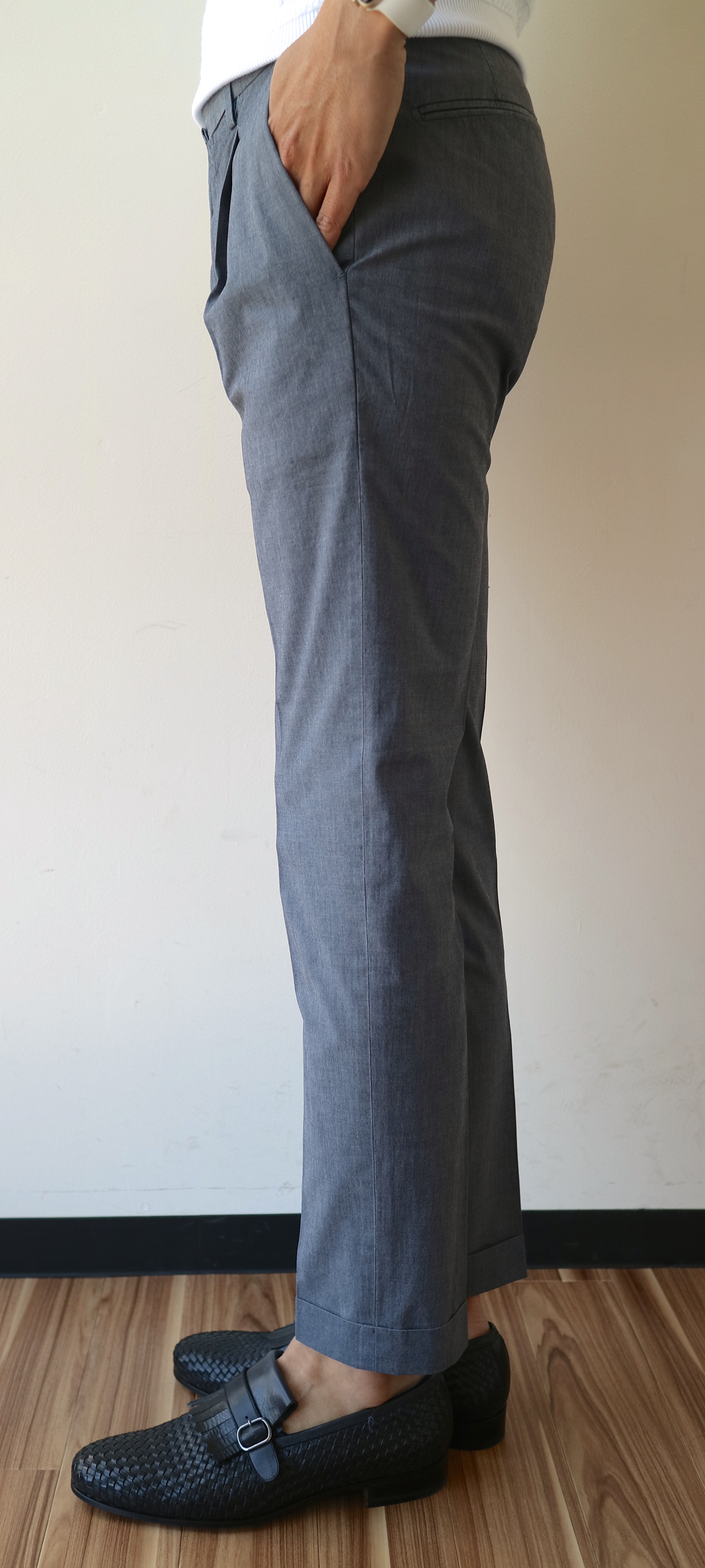 ちょいクラシック風に見せられるワンプリーツに、シルエットは細身ベース。イタリアの細いパンツに慣れた方にもきっと満足いただけるであろうシルエットでしょう。モデルは身長183cm・体重66kgで、サイズ44(30インチ)を着用しています。