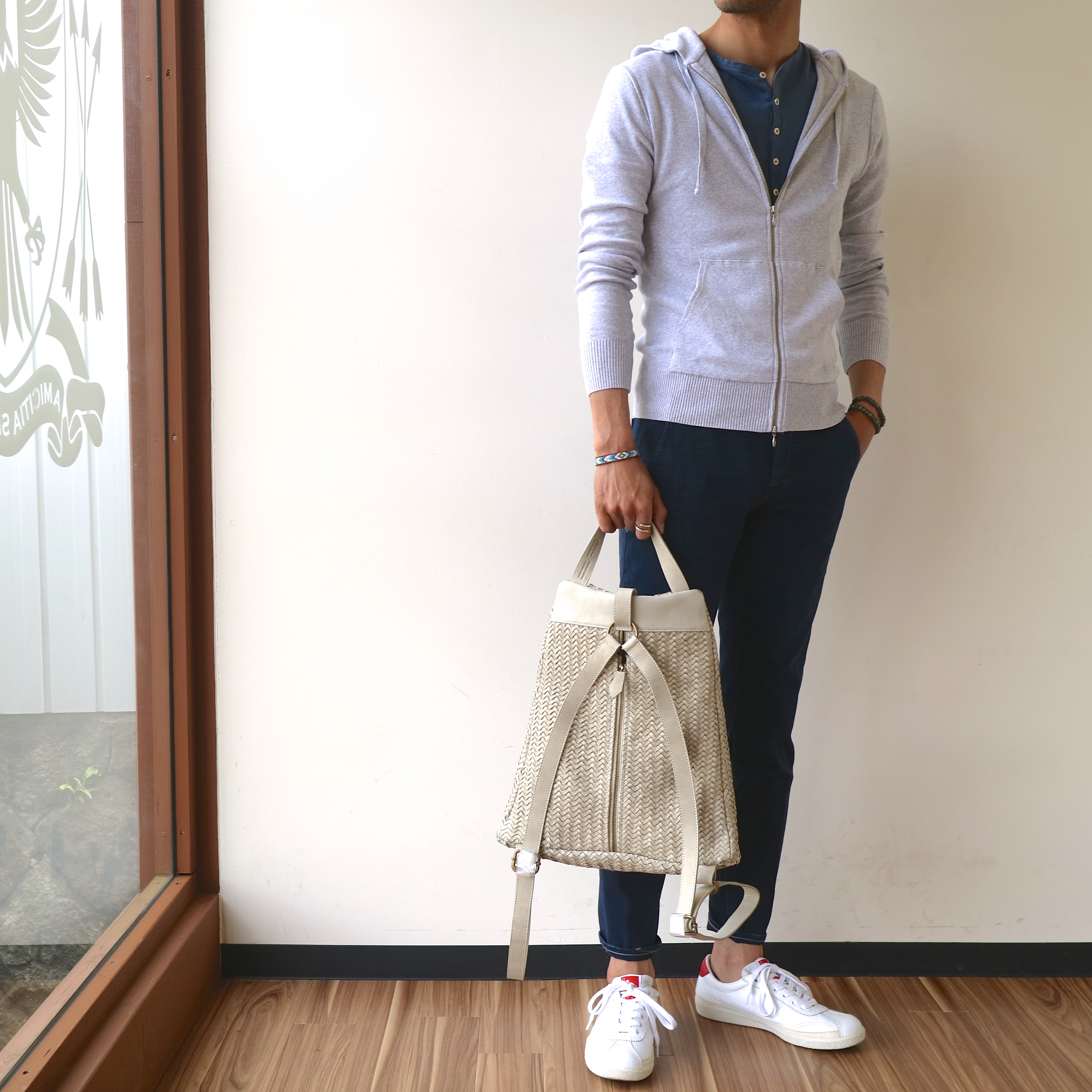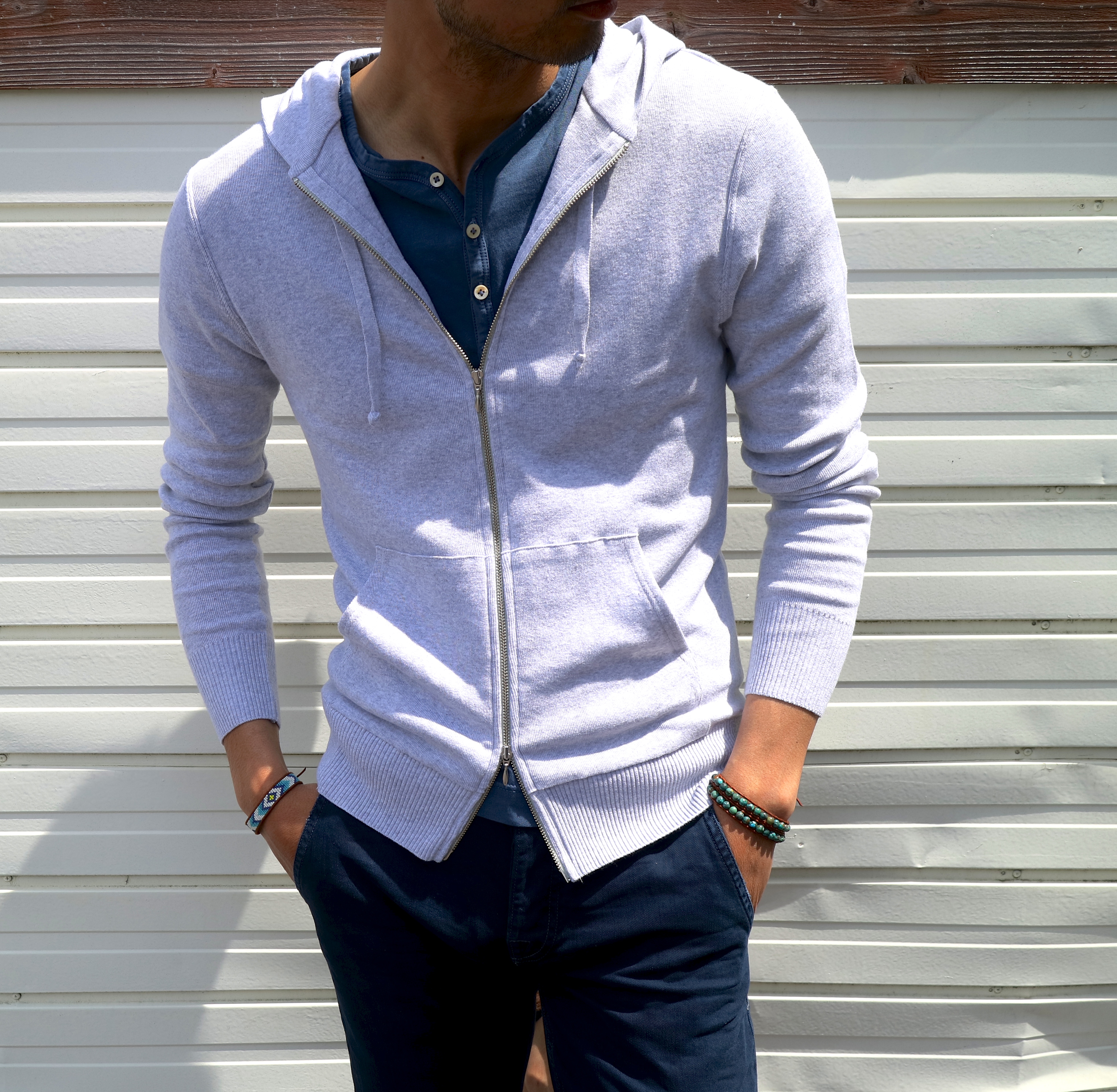 選んだのは、Letroyesのニットパーカー。オーソドックスなカットソーのパーカーに比べ、落ち着いた雰囲気。半袖のTシャツの上に羽織れば、気持ちの良い質感も味わえます。カットソーはCIRCOLO 1901、パンツはCare labelのslack 364、スニーカーはPantofola d'Oro、バッグはTIBERIO FERRETTIのZAINETTO。ブレスはCHAN LUUです。