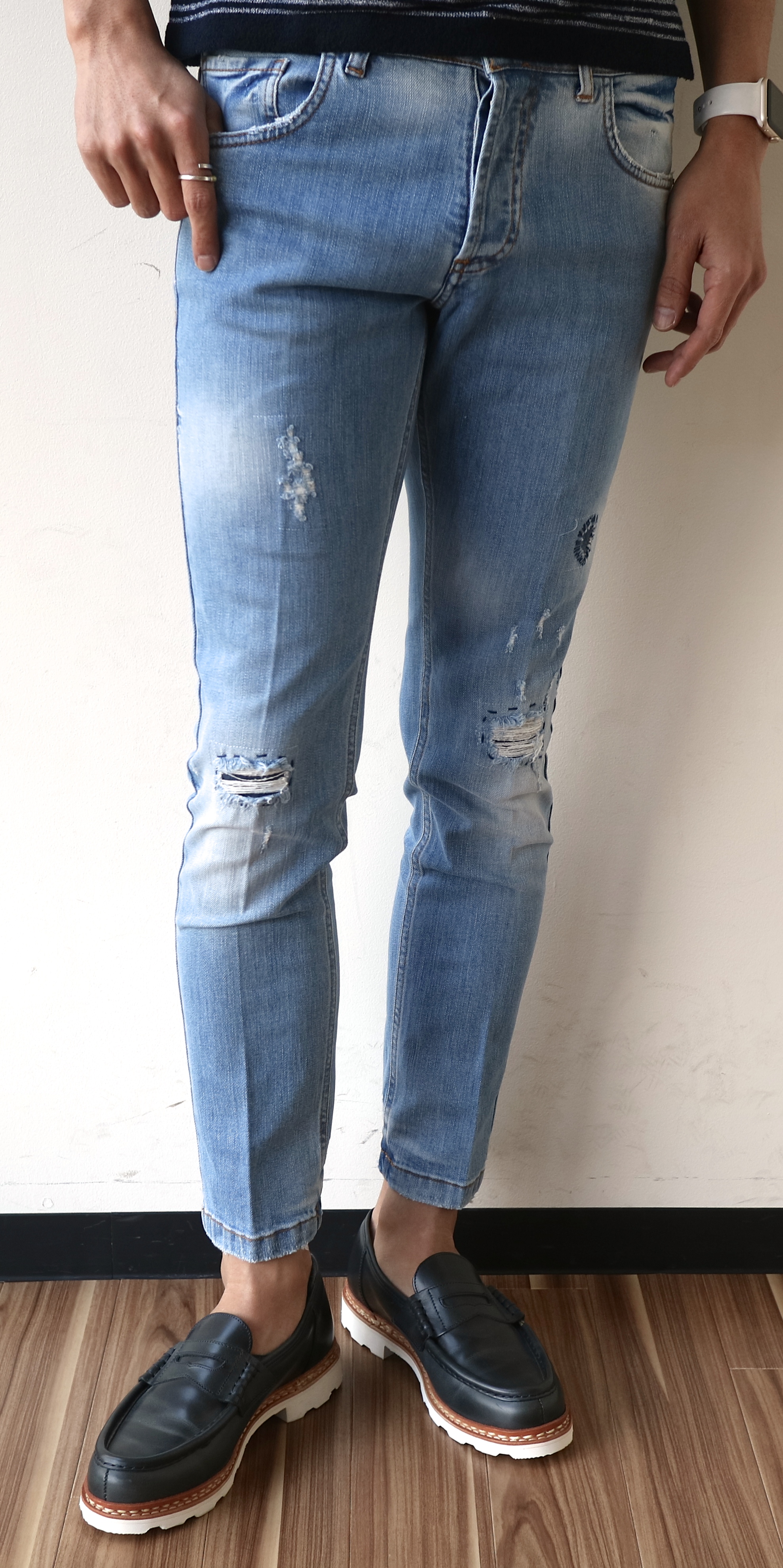 MODEL:ウォッシュドライトブルー ダメージ加工クロップドデニム