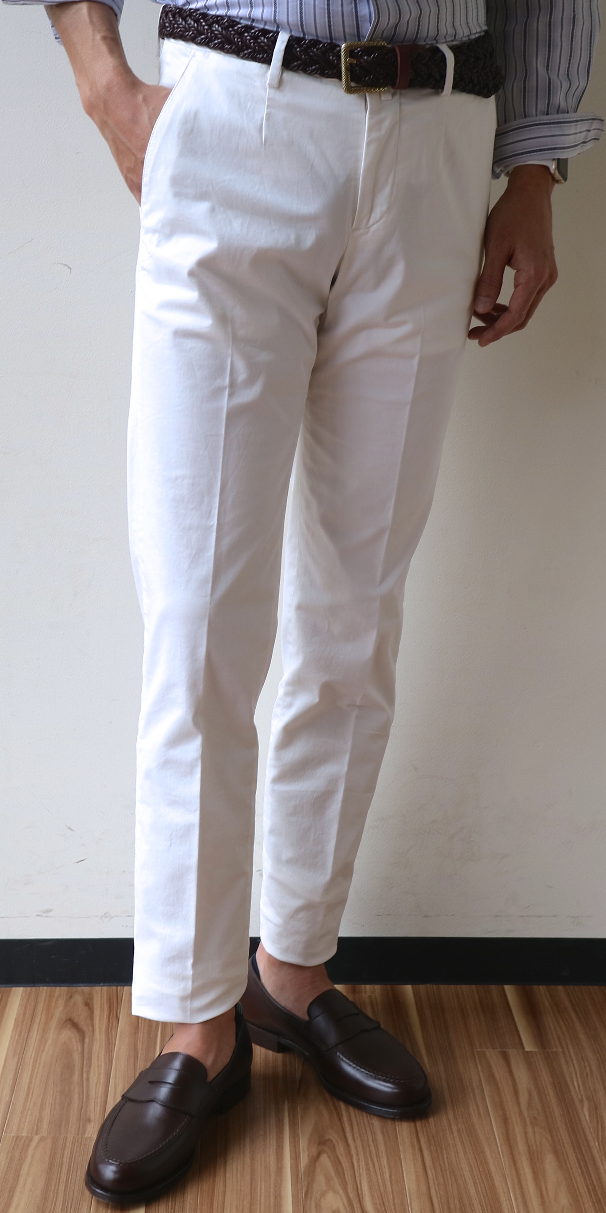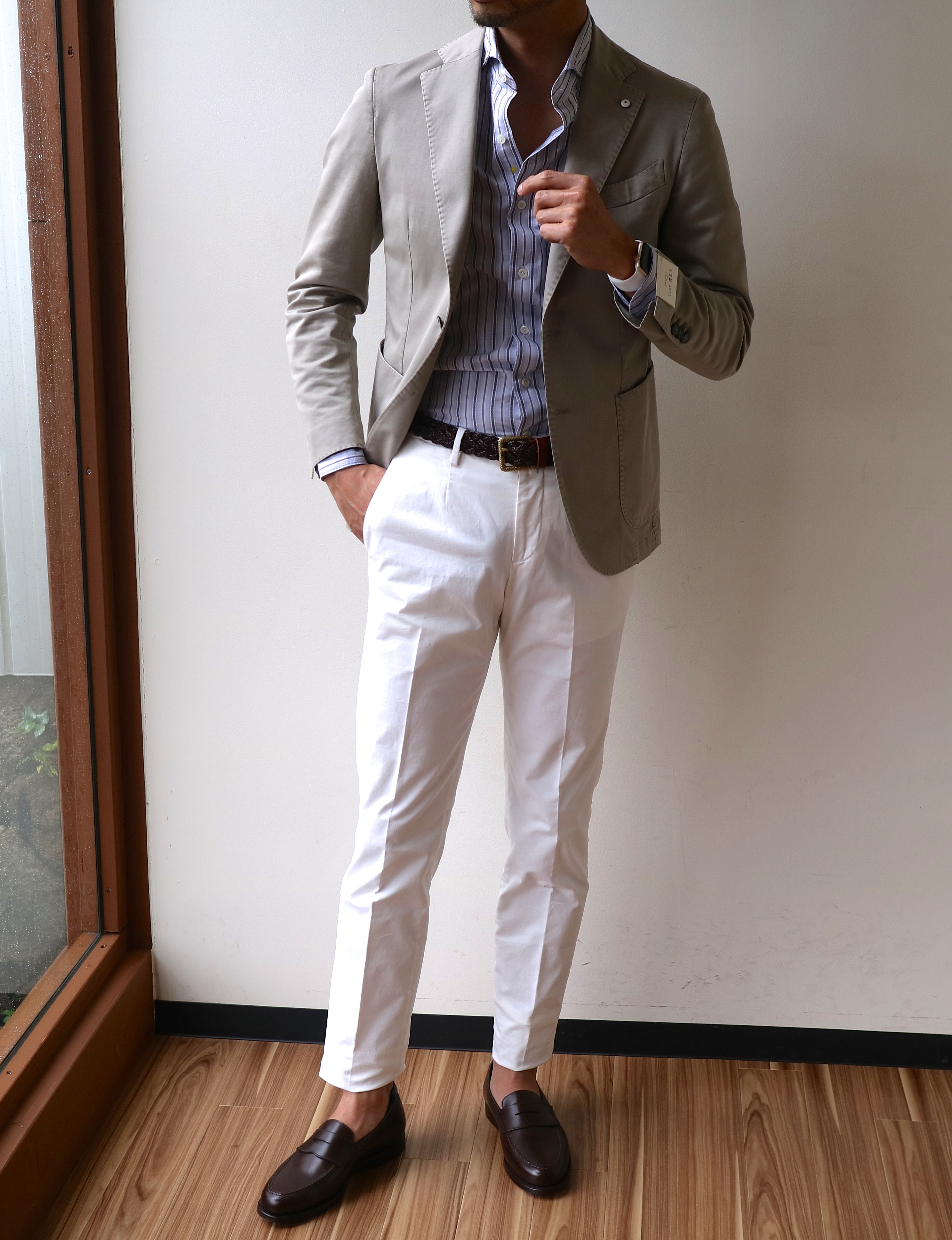 ホワイトパンツは、ファイブポケットではなく、スラックスタイプが気分でしょうか。いずれにせよ、ワードローブに欠かせない1本でしょう。L.B.M. 1911のジャケット、Giannettoのシャツ(後日ご紹介予定)を合わせています。CROCKETT&JONESのローファー、TIBERIO FERRETTI(未公開)のベルトは、前コーディネートと同じです。