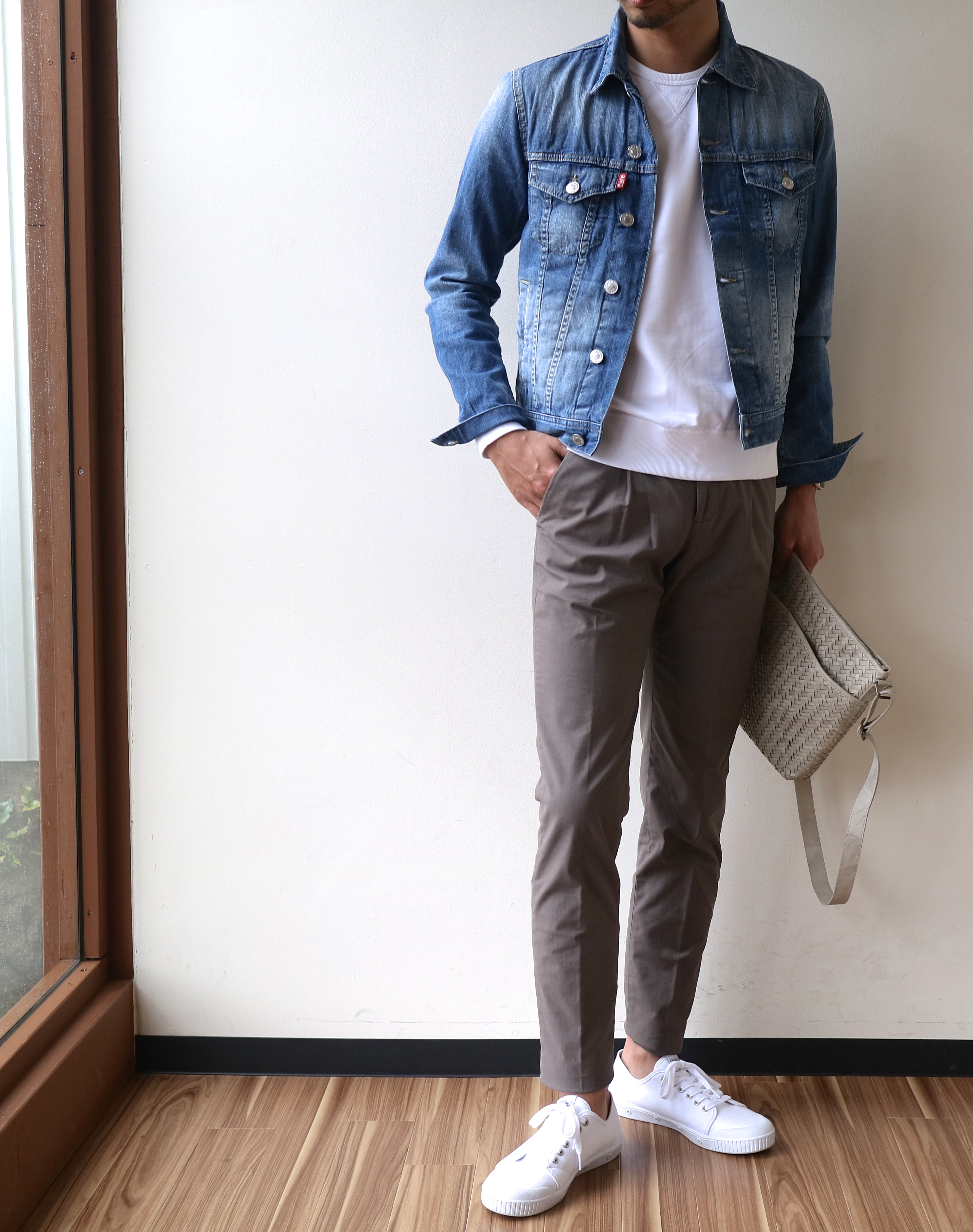 カジュアルな着こなしにおいても、程よく上品さをもたらしてくれるのが、コットンスラックスの良いところ。Gジャン(Care label)スタイルや、カットソー(mey story)スタイル、スニーカー(Spring Court)スタイルなど、上手にミックスして使いたいものです。