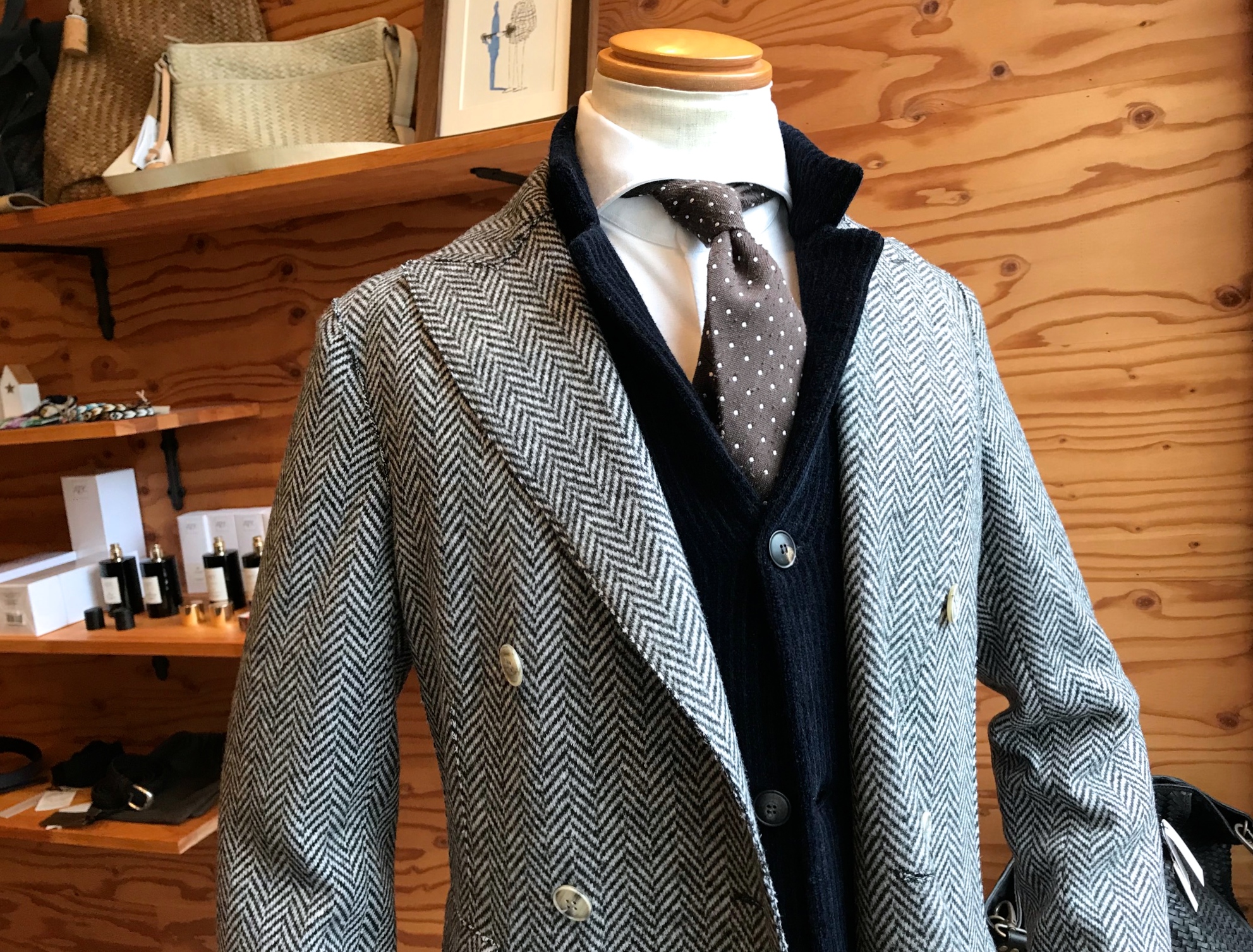 ちょうどマガジーノのトルソーが着ていたので、パシャリ。DREW&CO.のコーデュロイ編みニットジャケットに、Holliday&Brownのタイをしています。こんな合わせも良いですね。