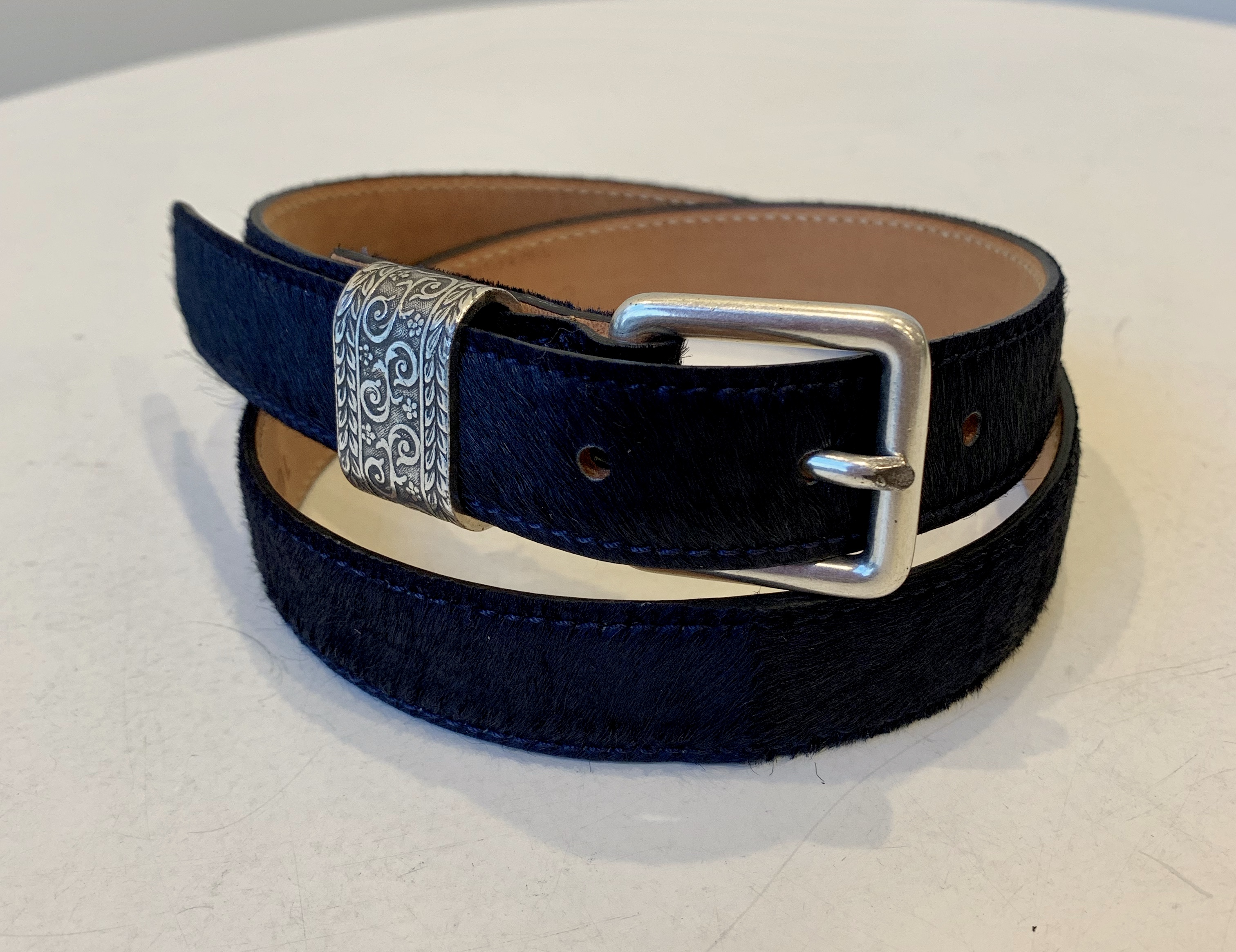 80サイズのブルーが残り1本なのは、クロコ型押しポニーベルト。ネイビー系のベルトは、ワードローブに1本あると重宝しそうです。