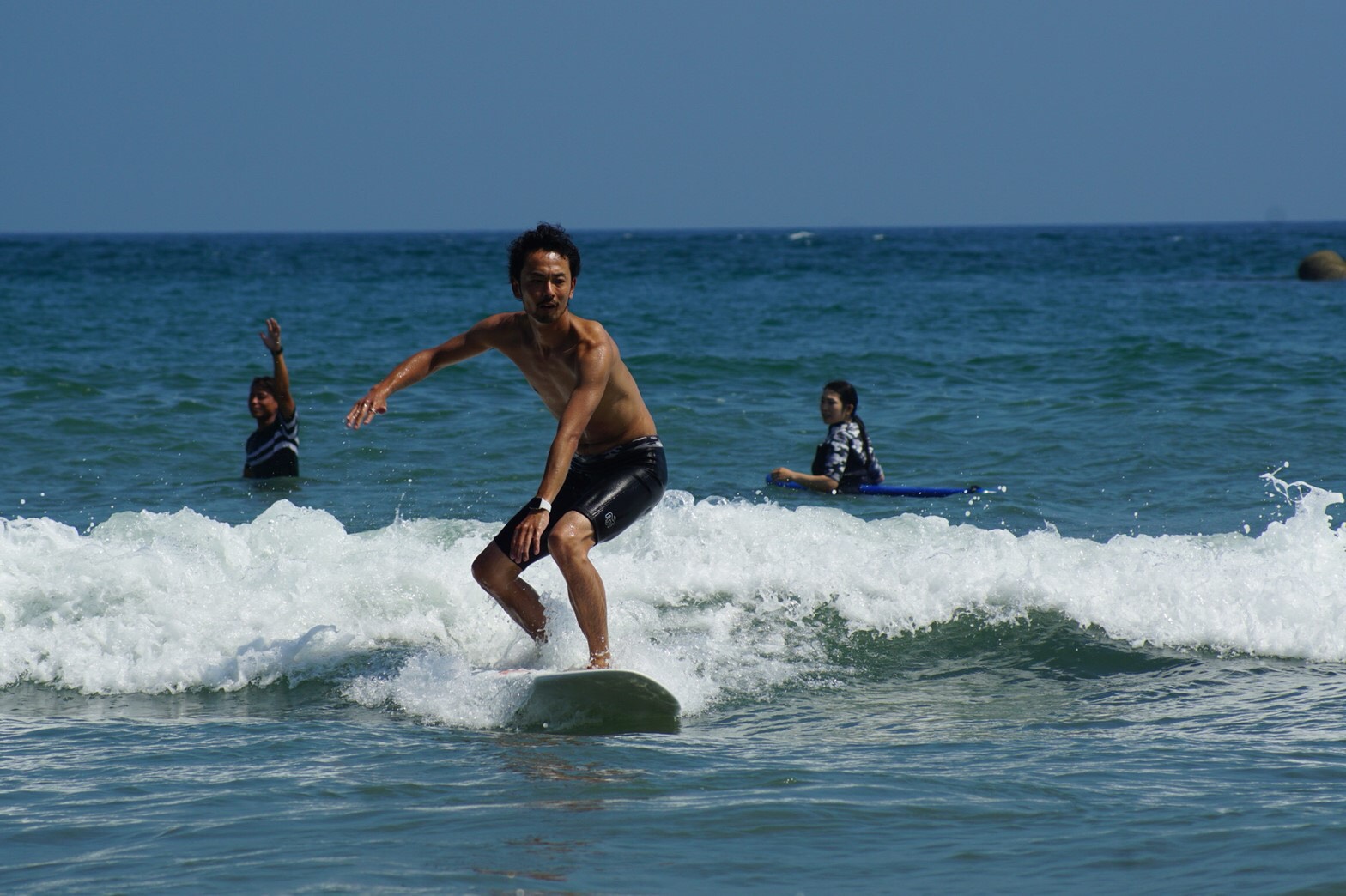 ちょっと恥ずかしいですが、プライベート写真を載せることにしました。乗っているのはなんてことない小波ですが、少しは絵になる1枚でしょうか。夏の海の気持ち良さを感じたくて、上半身裸で入っています。が、写真にするとやっぱり華奢。この日一緒になった男の子が惚れ惚れするくらい良い身体をしていましたので、ちょっと恥ずかしくなり、この後はウェアを着て入るようになりました 笑。やはり、自分は洋服を着ている方が性に合いそうです。