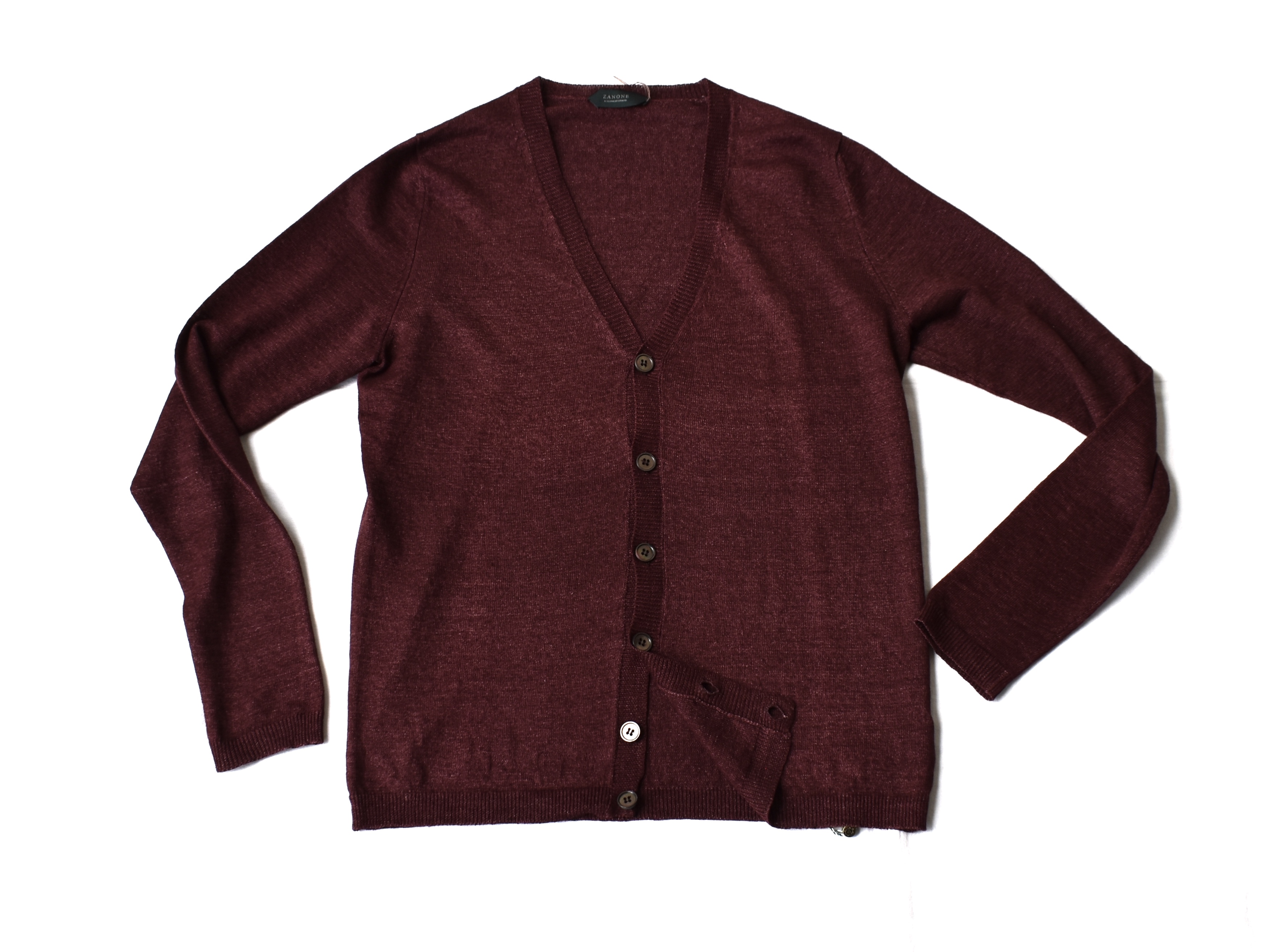 ZANONEのカーディガンは、リネン素材のカーディガン。リネン特有のシャリ感と色合いは、大いに魅力的。色気のあるボルドーです。