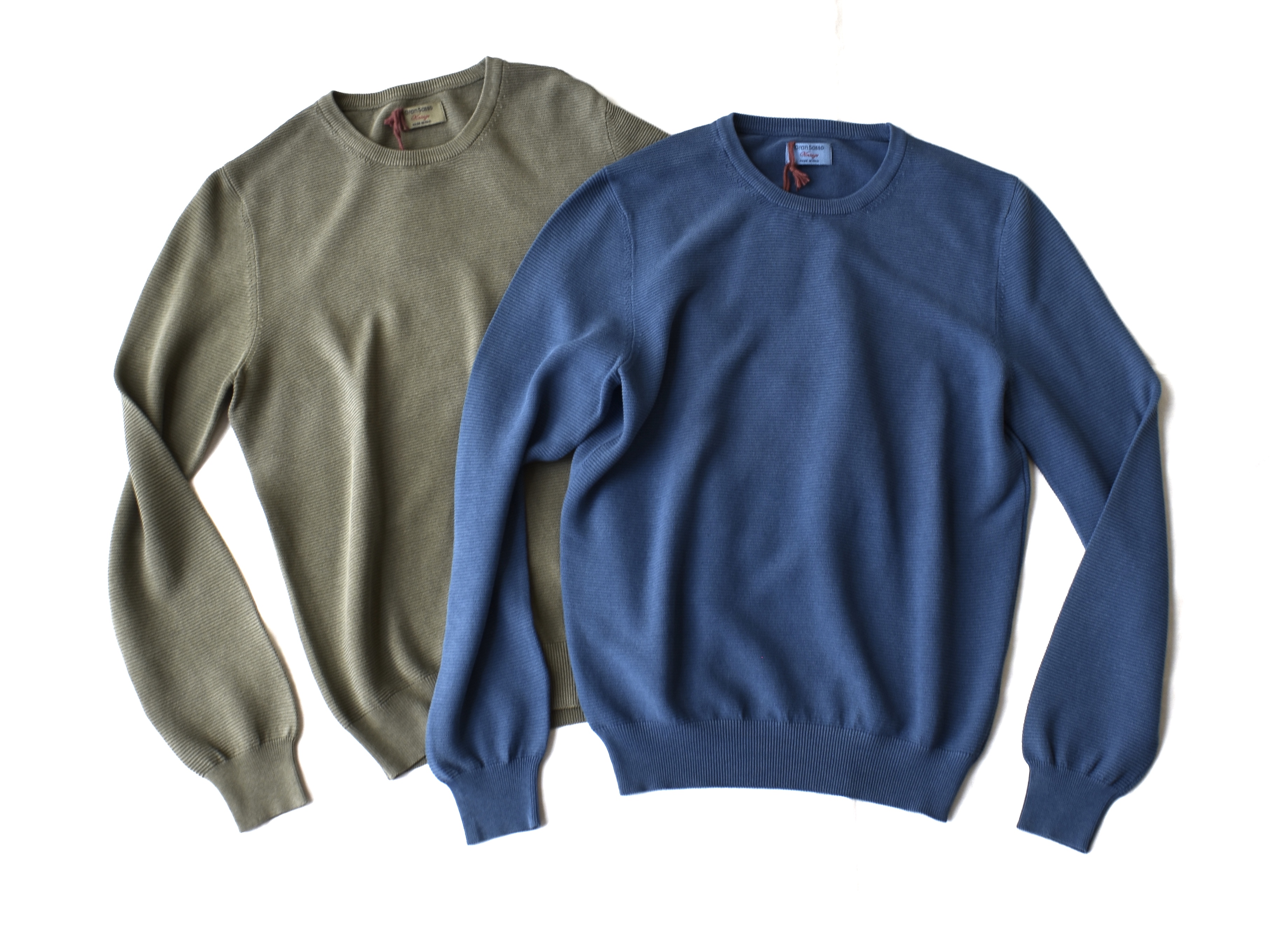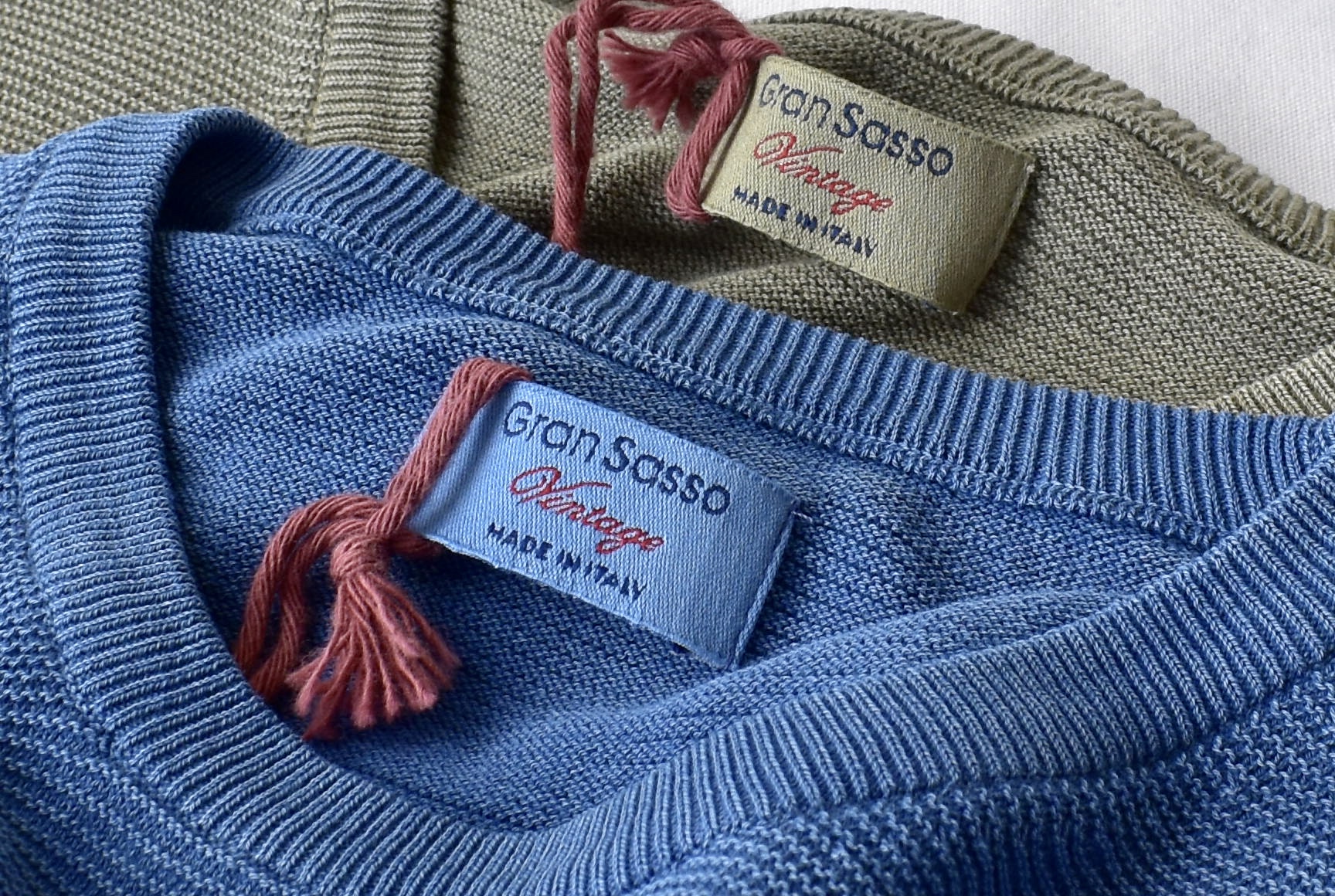 横方向へのリブ編みが珍しいGran Sassoのクルーネックニット。手を触れてみると、ザラリとした感触。リブ編みによって、ドライな質感が強調されており、夏にこそ着たい1枚です。