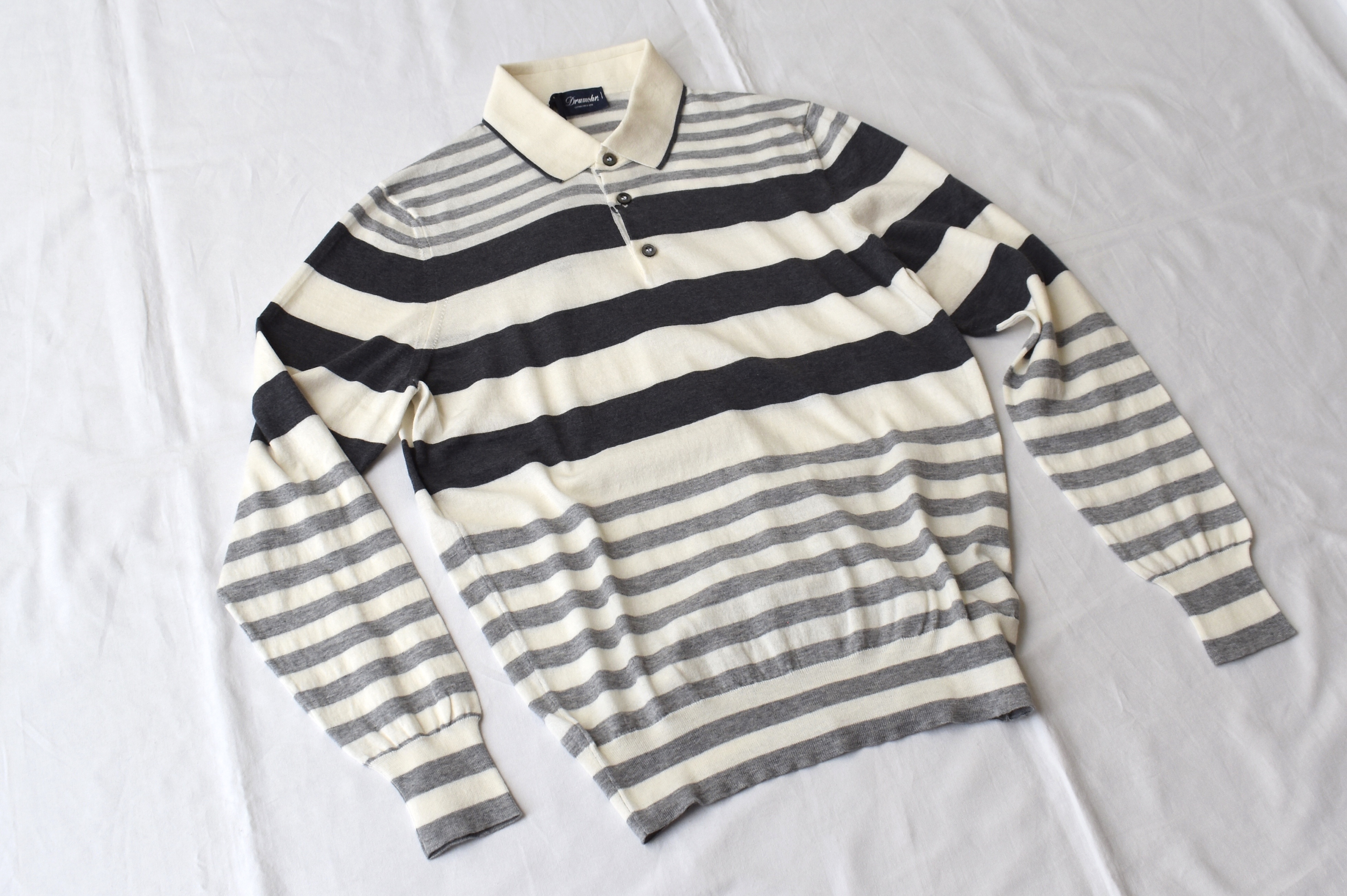 もう少しリッチ感を感じられるのは、Drumohrのボーダーポロセーター。コットンに15%カシミアが混紡され、薄手ながら、ソフトでしっとり感があります。いつも以上に、優しく身を包むはずです。シャワーを浴びた後にさっと着用したら、気持ち良いんでしょうね。オフホワイトに、チャコールの太ボーダー、ライトグレイの細ボーダーが組み合わされ、上品さもアピールしてくれますよ。