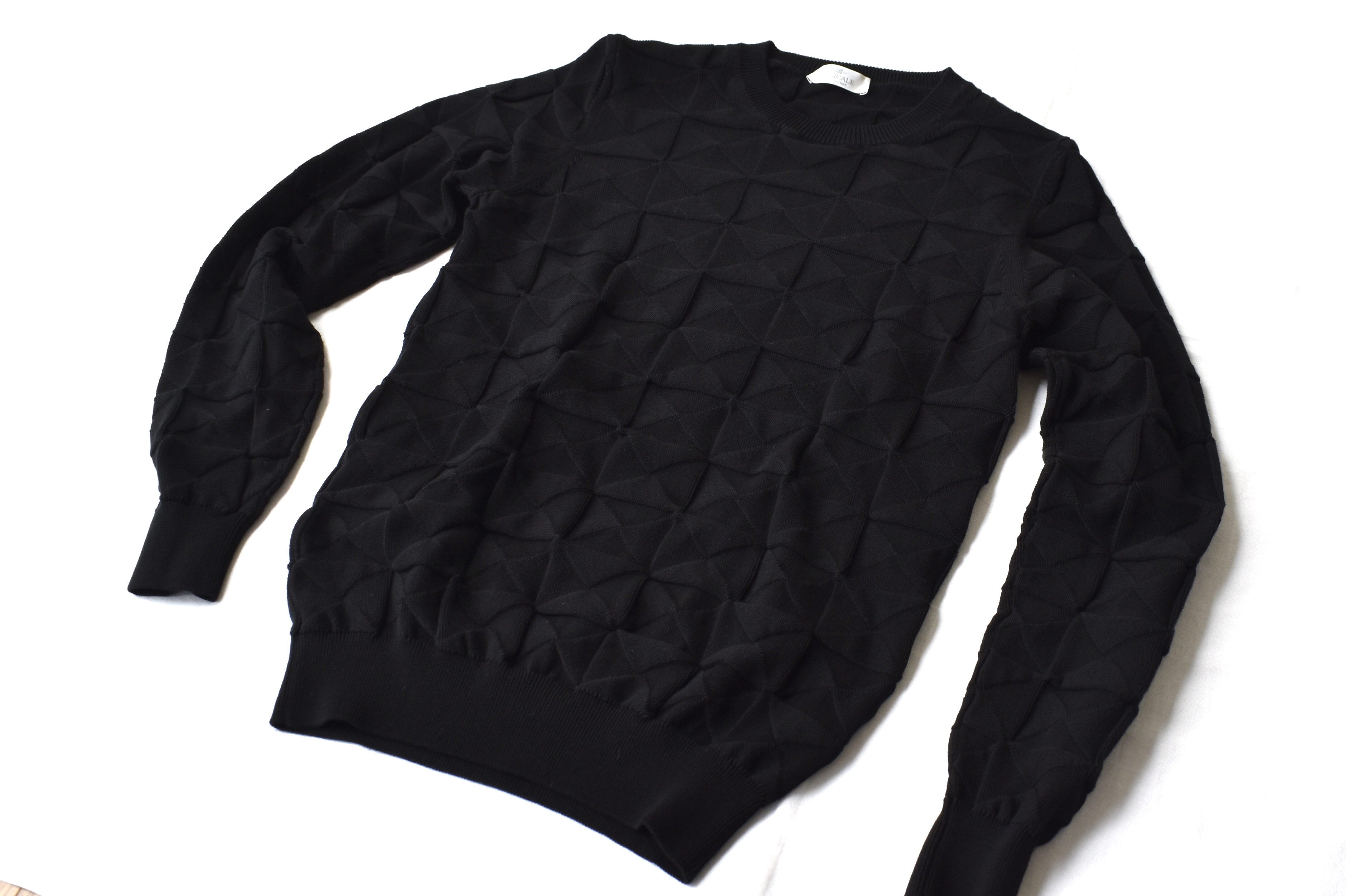 ちょっとした柄のニットもあります。編みで凹凸感を作ったのは、トライアングル柄のクルーネック。絶妙な奥行き感を味わえます。この手のコットンニットは、秋〜ウールのニットを本格的に着始めるまでの期間に、出番が増える存在。今のうちに買い足しておくと、後々便利かもしれません。写真を撮り損ねてしまいましたが、色違いのホワイトもありますよ。