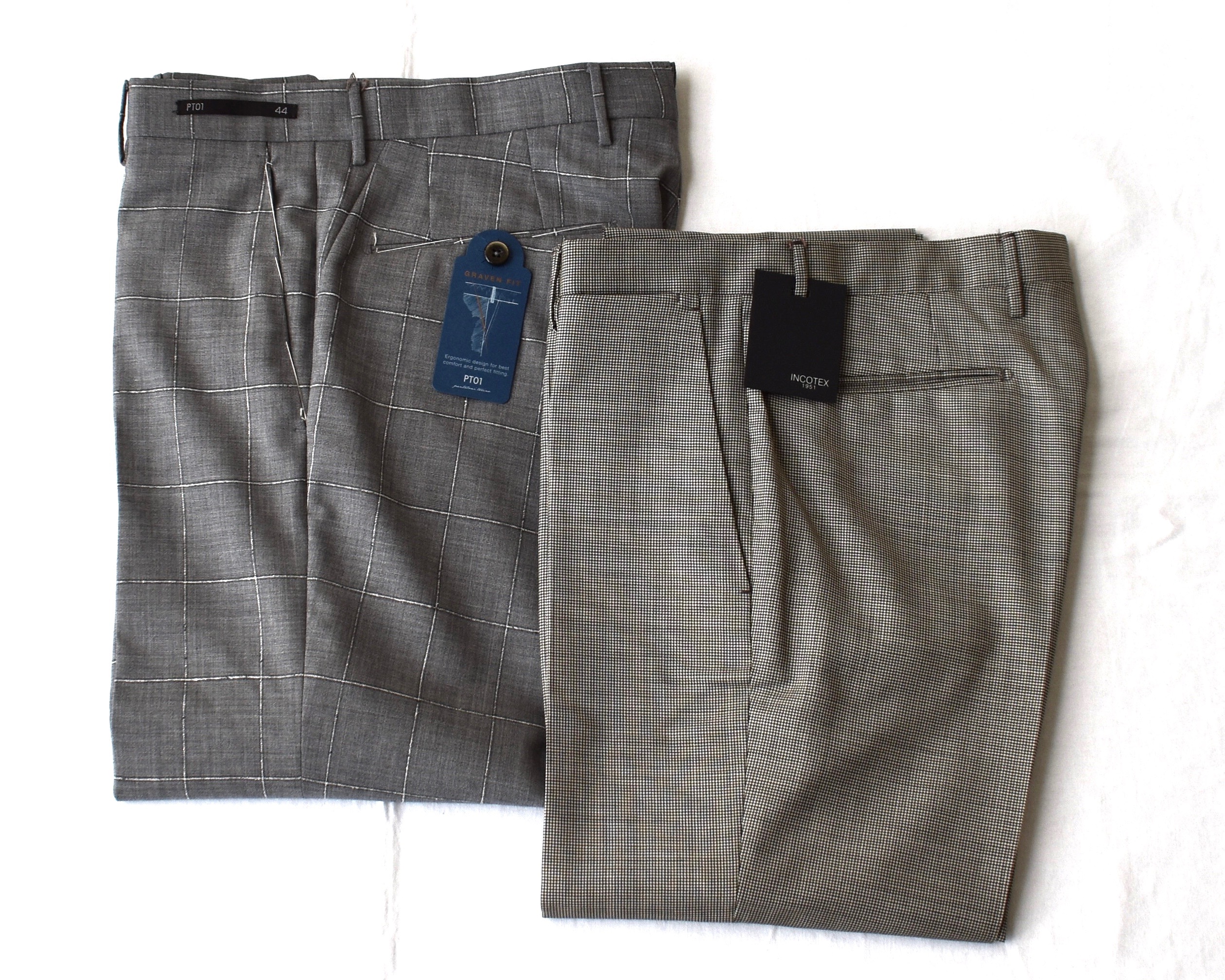 たまにサイズ縛りになります。こちらは、44サイズ。PT01のウィンドウペン柄ウールパンツと、INCOTEXのマイクロハウンドトゥース柄ウールパンツ(店頭のみ)。ビジネス用にストックするのも良いでしょう。