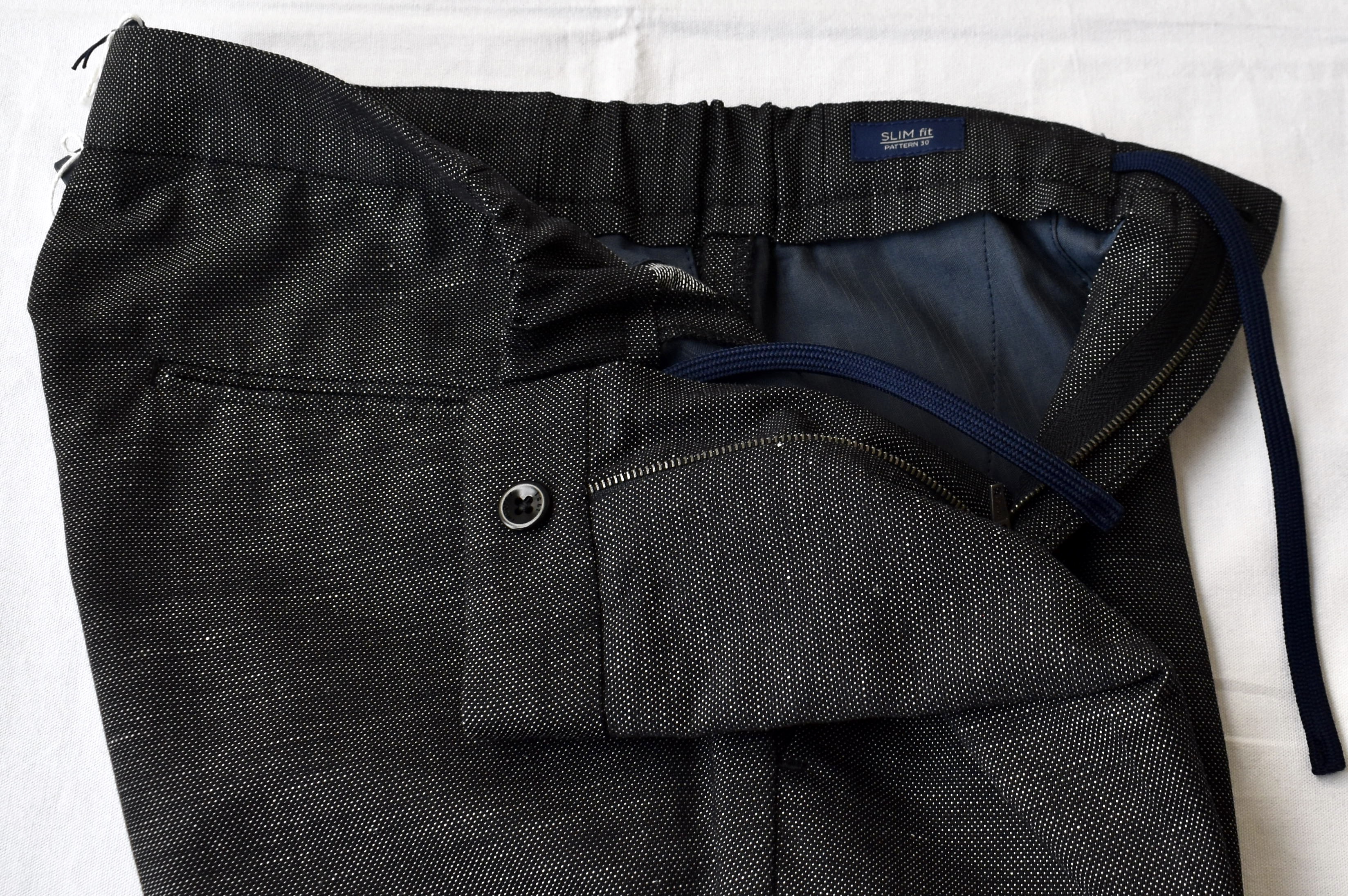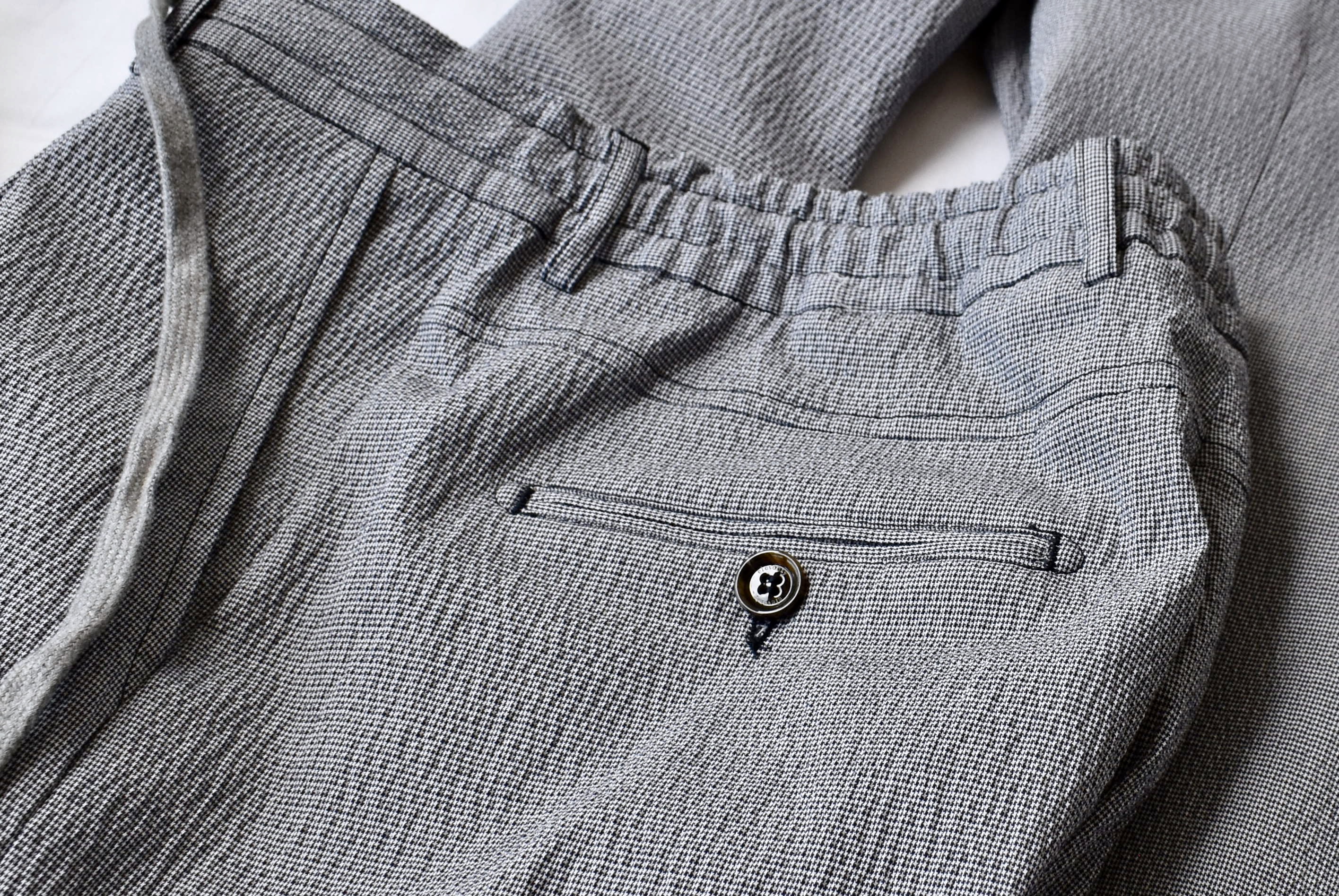 涼しそうな生地です。遠目ライトグレイに見えて、ホワイトとネイビーのマイクロチェック柄。やはり清涼感があります。パンツはドローコード付きで、今らしいカジュアルパンツ。一応ベルトループも付いています。来季のeleventyの展示会では、セットアップ提案が増えていたものの、個人的な好みではありますが、今季のものに勝るものはなかったので、セレクトしていません。今季思い入れのある商品は、48サイズがあと1点です。
