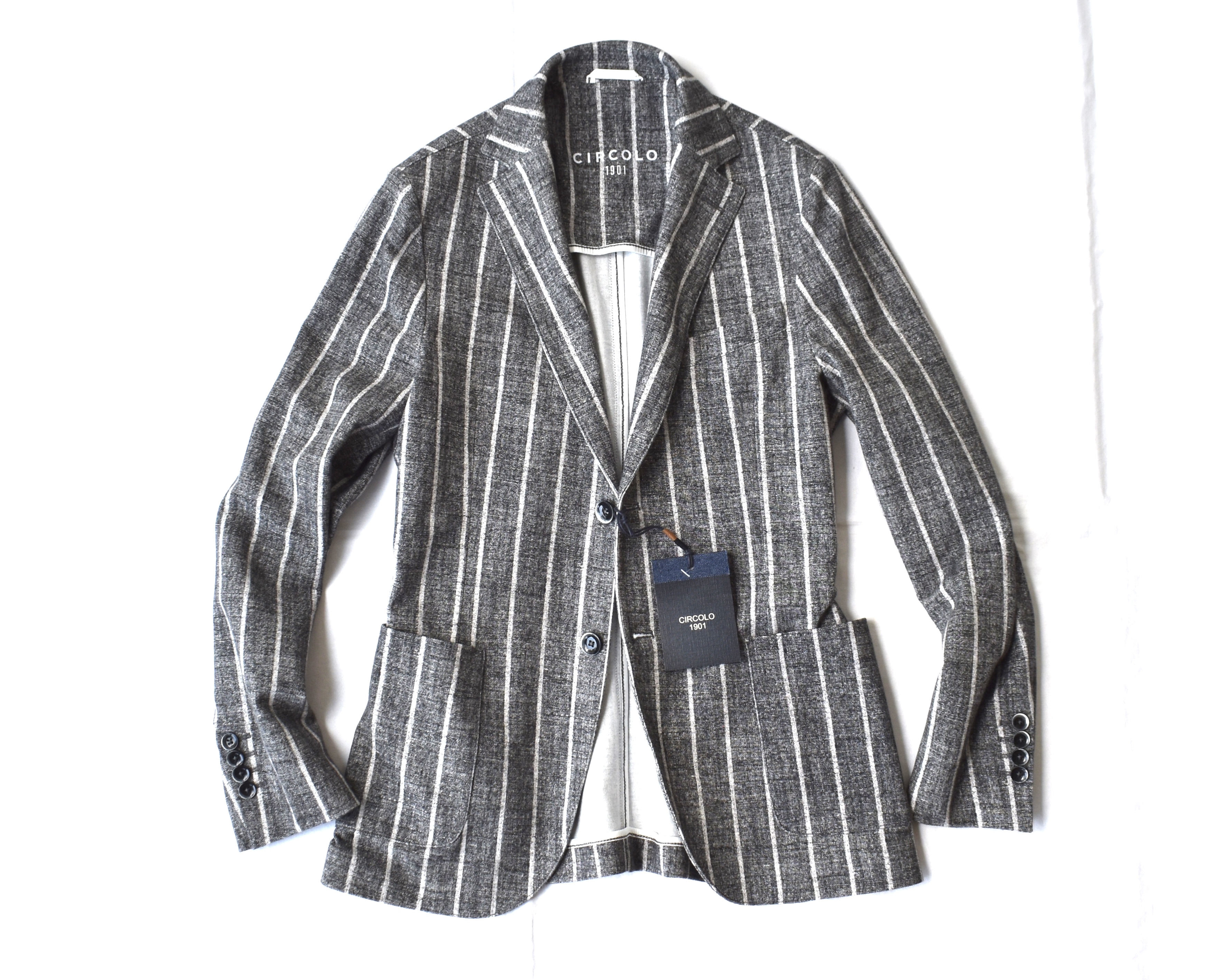 CIRCOLO 1901のストライプジャケット。今季のチルコロの中で、最も遊び心のある生地でした。50サイズなら、上下で揃えられます。