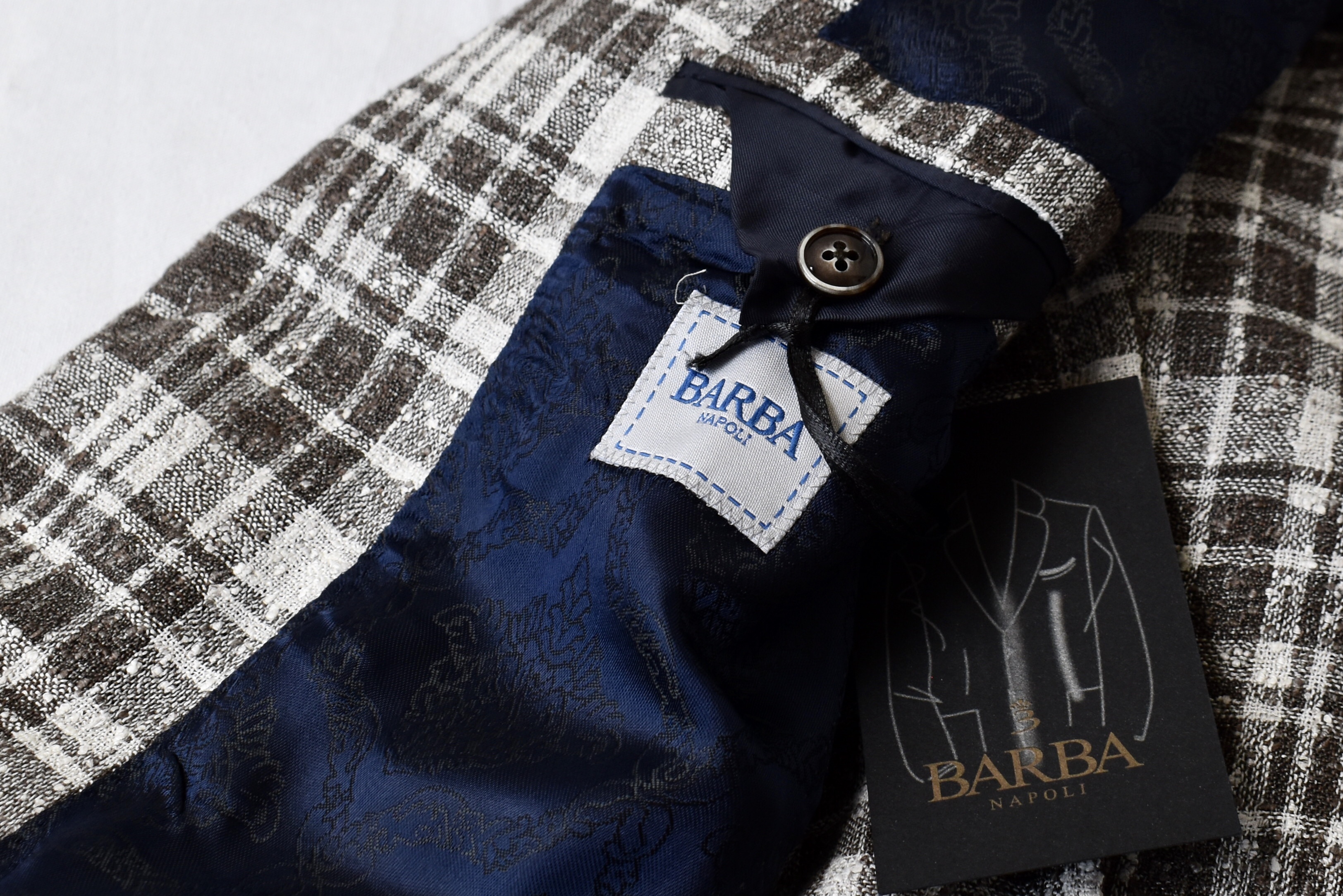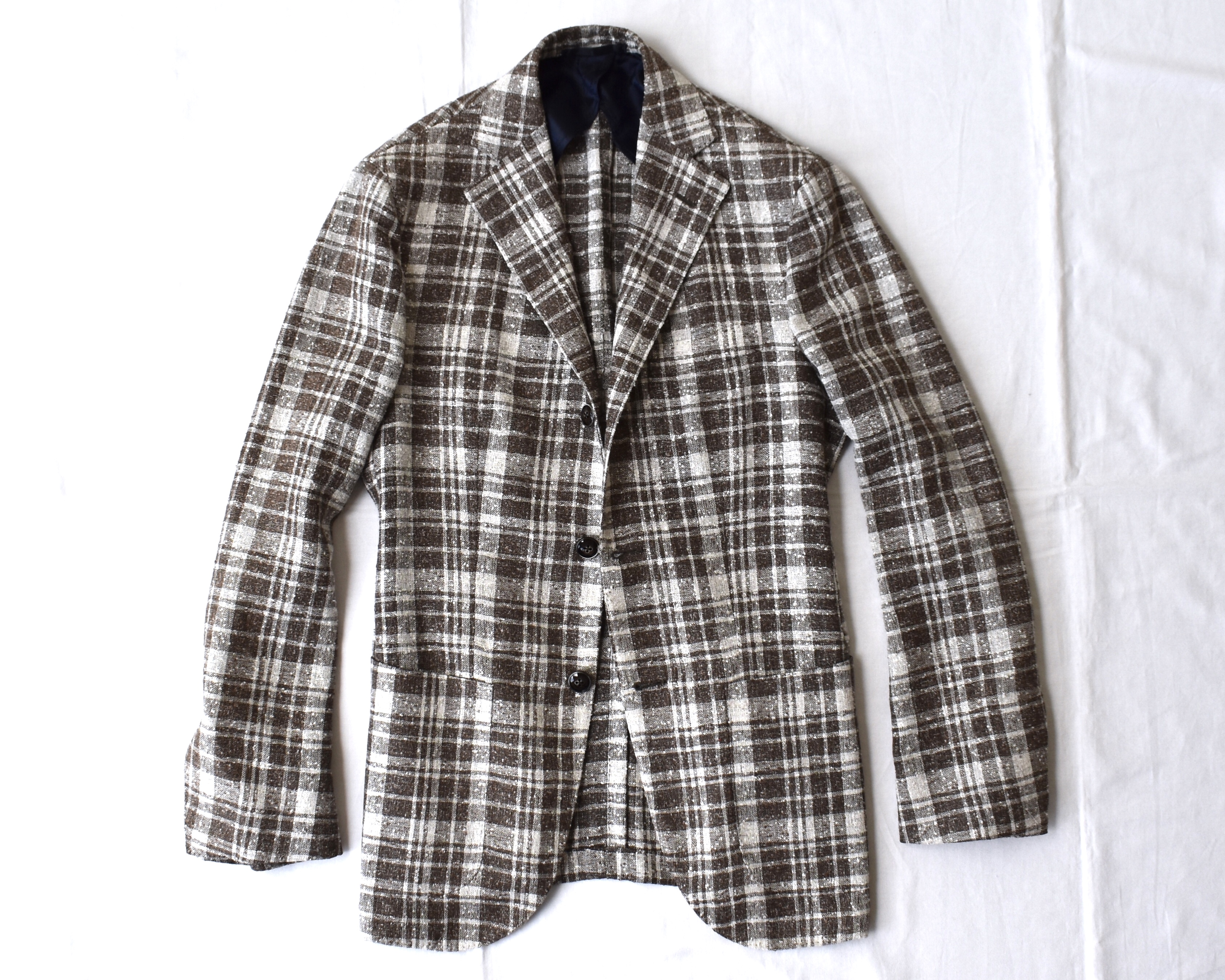 これは...!! なのは、BARBAのリネン系チェックジャケット。短すぎない着丈に、段返りの3つボタン、シェイプの効いた縦長のフォルム...身長のある方は、特にお似合いになることでしょう。