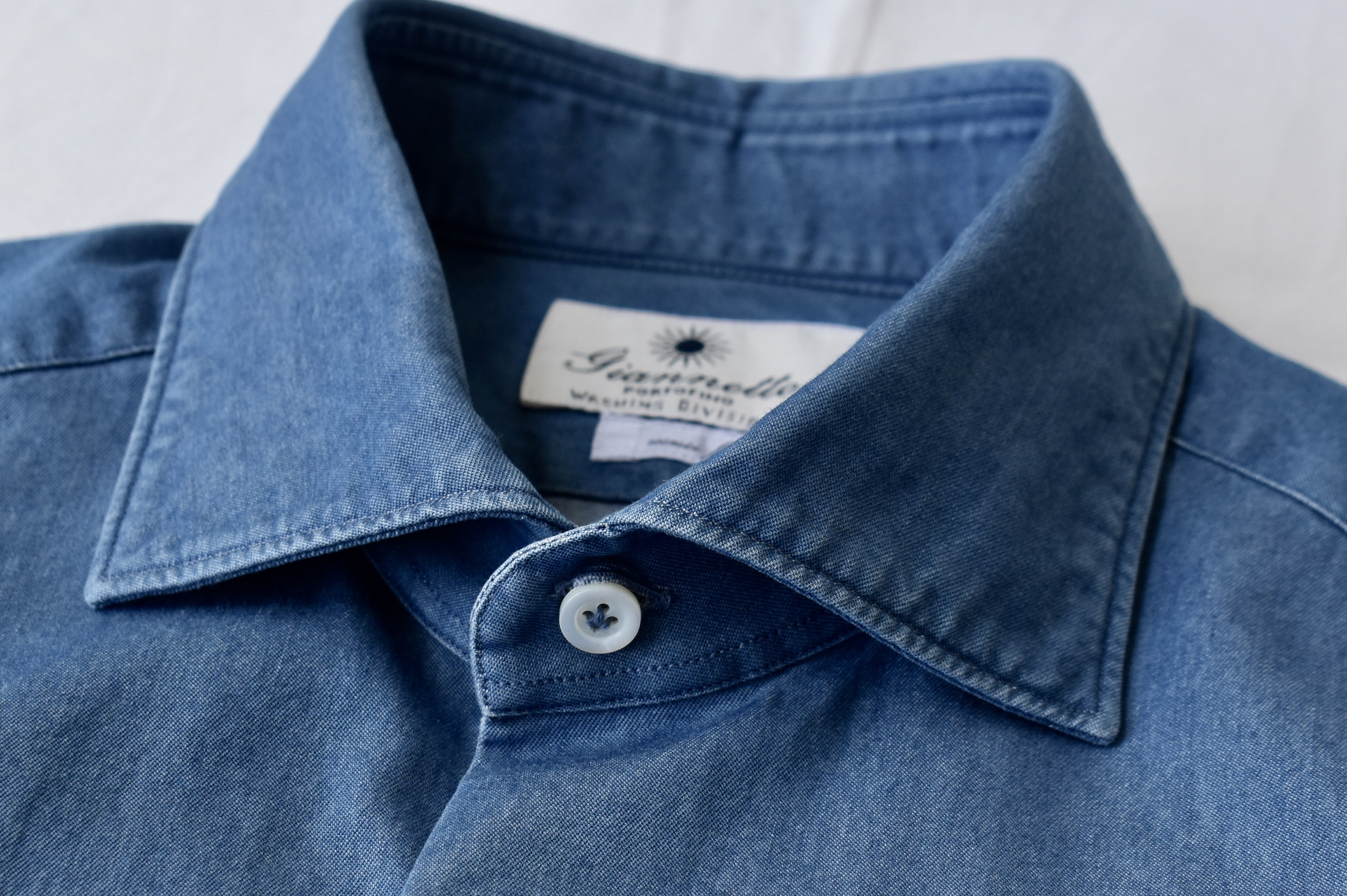 これが実物に近い色味になります。気持ち薄めのデニムブルーは、41サイズがあと1点。やや小さめですので、ネックサイズ40~41サイズの方、もしくは48サイズの方にフィットするはずです。