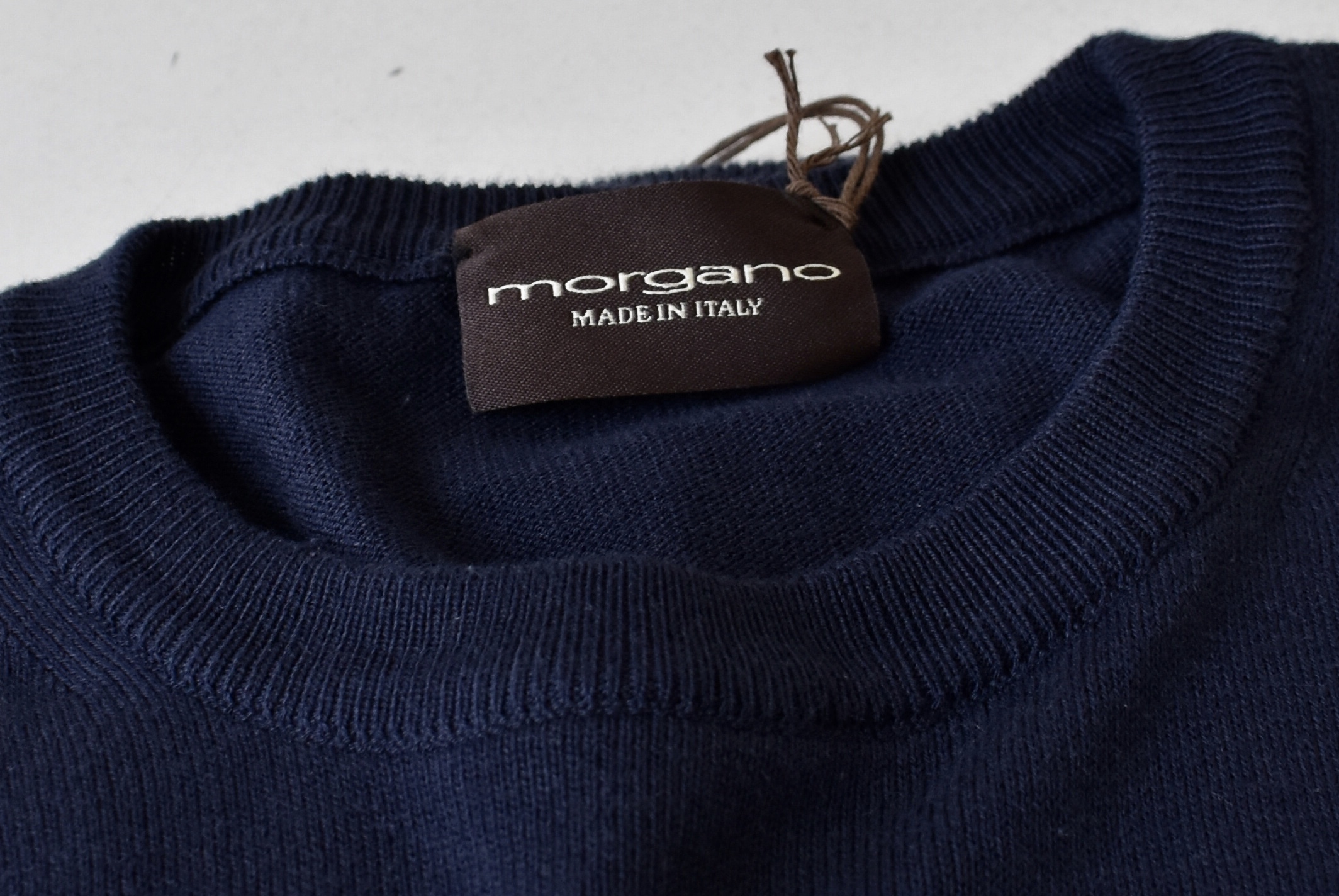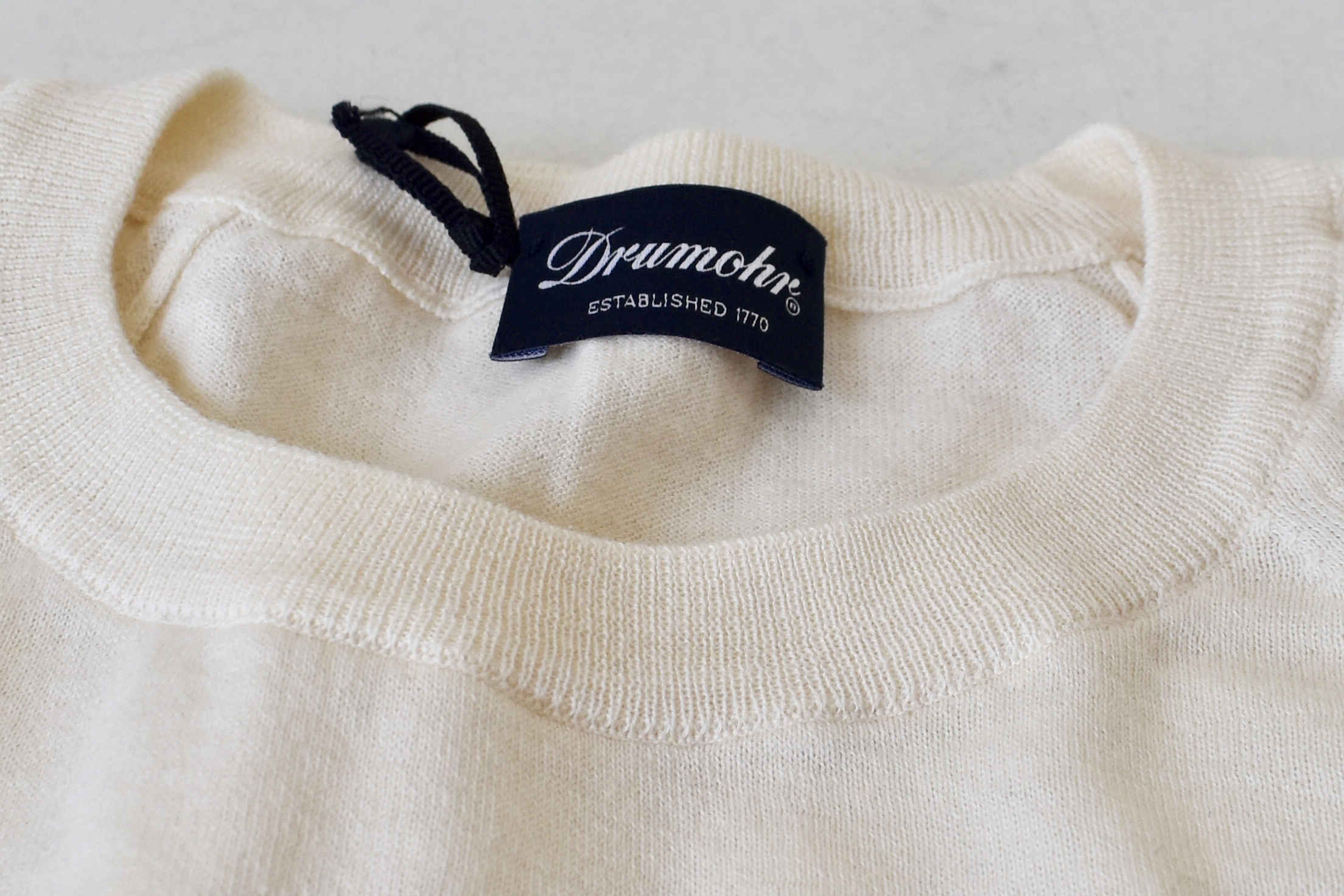服好きのワードローブの充実に...となると、見逃せないのが、シンプルなハイゲージニットのクルーネック。左のmorganoはネイビー、右のDrumohrはオフホワイト。両者とも、かなりの使い回しがききそうです。