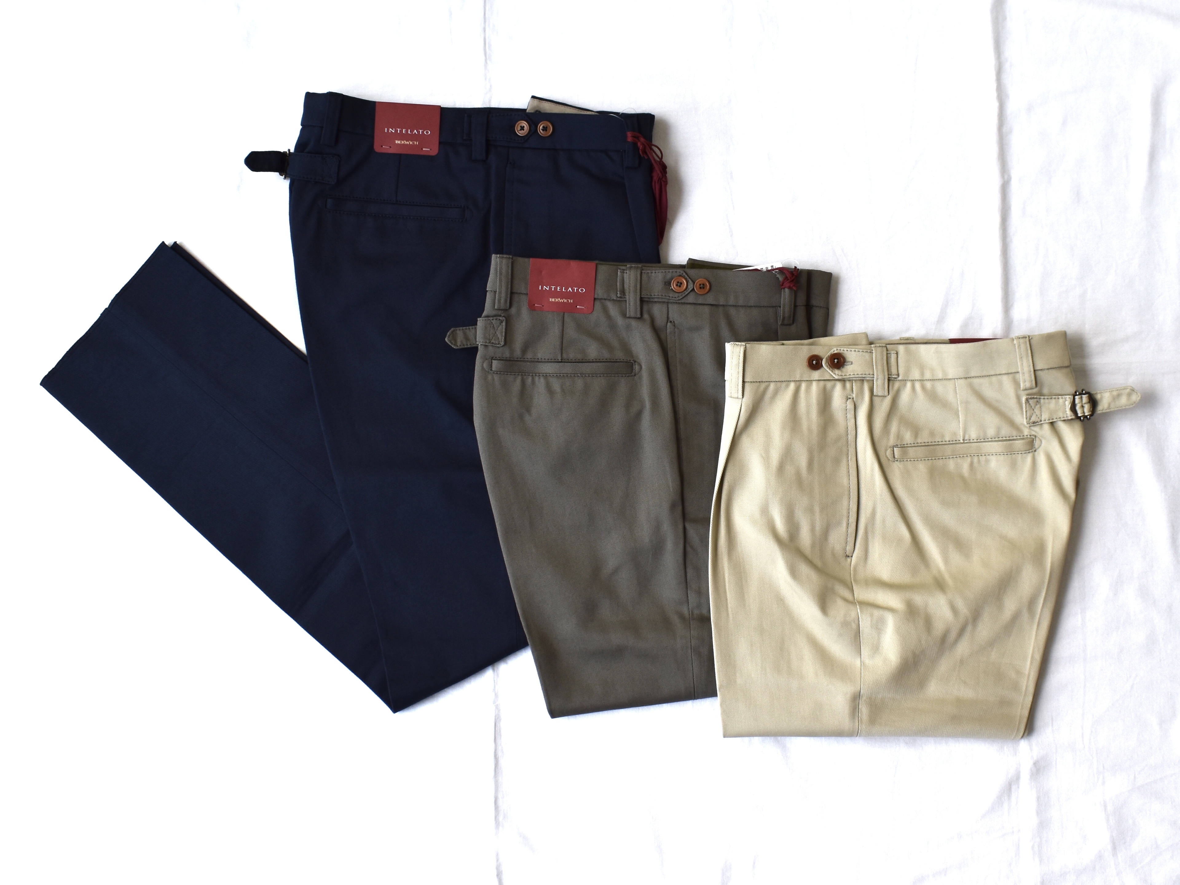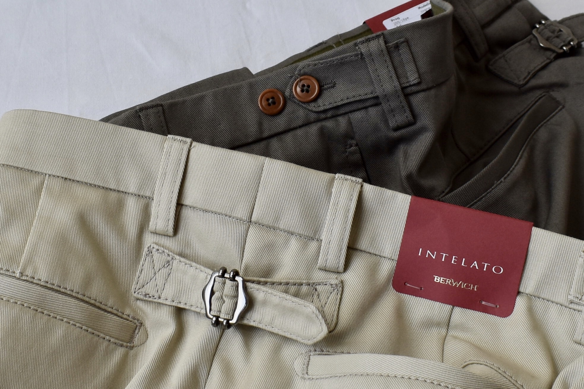 再びウール系に戻りますが、両者ともに42サイズ。そして、リネン混。涼感を追求できるウールパンツは、左がINCOTEXのドローコード付き。右がPT01のシャークスキン。