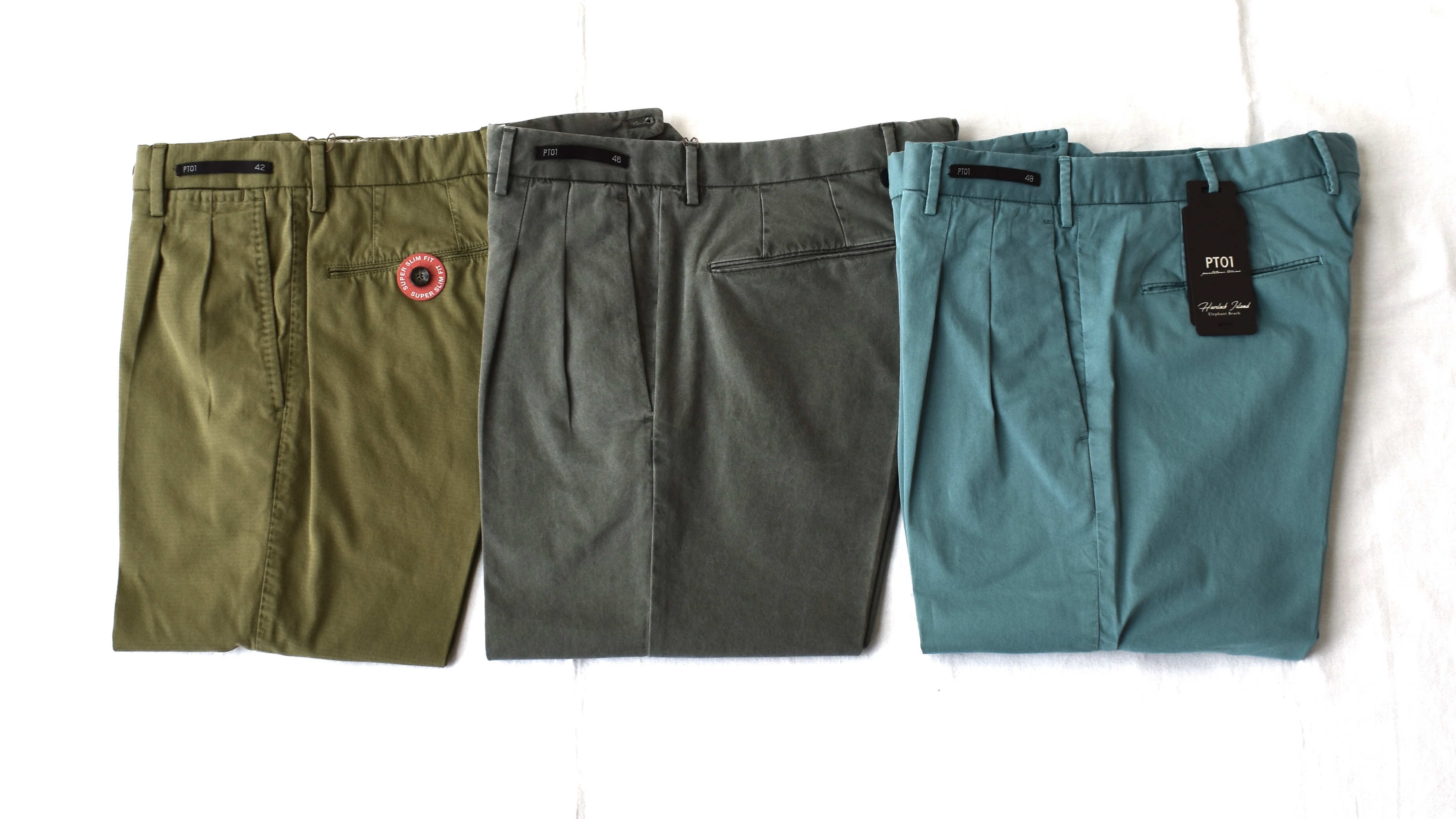 こちらはグリーン縛り。全てPT01のコットンパンツです。左から、抹茶色のジャカードパンツ、ガーメントダイのフェードグリーン、ライトコットンのシーグリーンのパンツ。サイズは、左から42、46、48がそれぞれ1点ずつ。均一SALEに入っています。