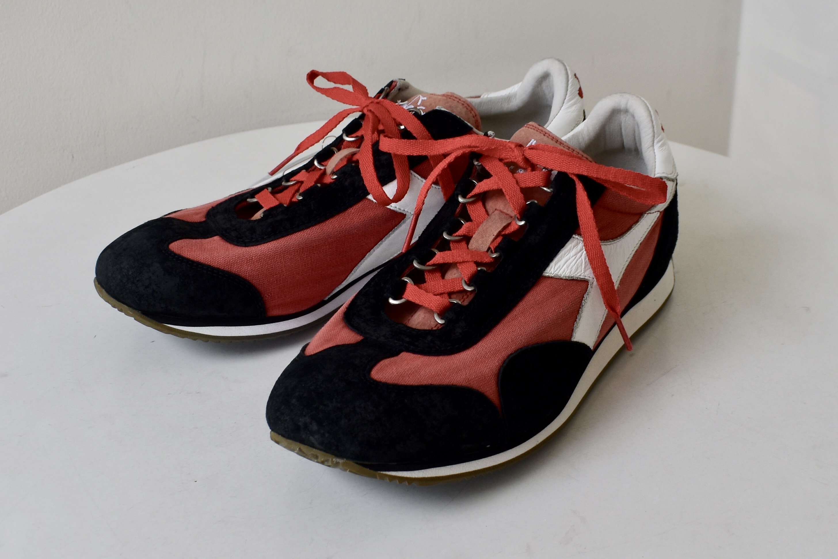 diadora HERITAGEのスニーカーは、フェラーリレッド。ワードローブに限らず、シューズボックスの充実も狙いたいところです。