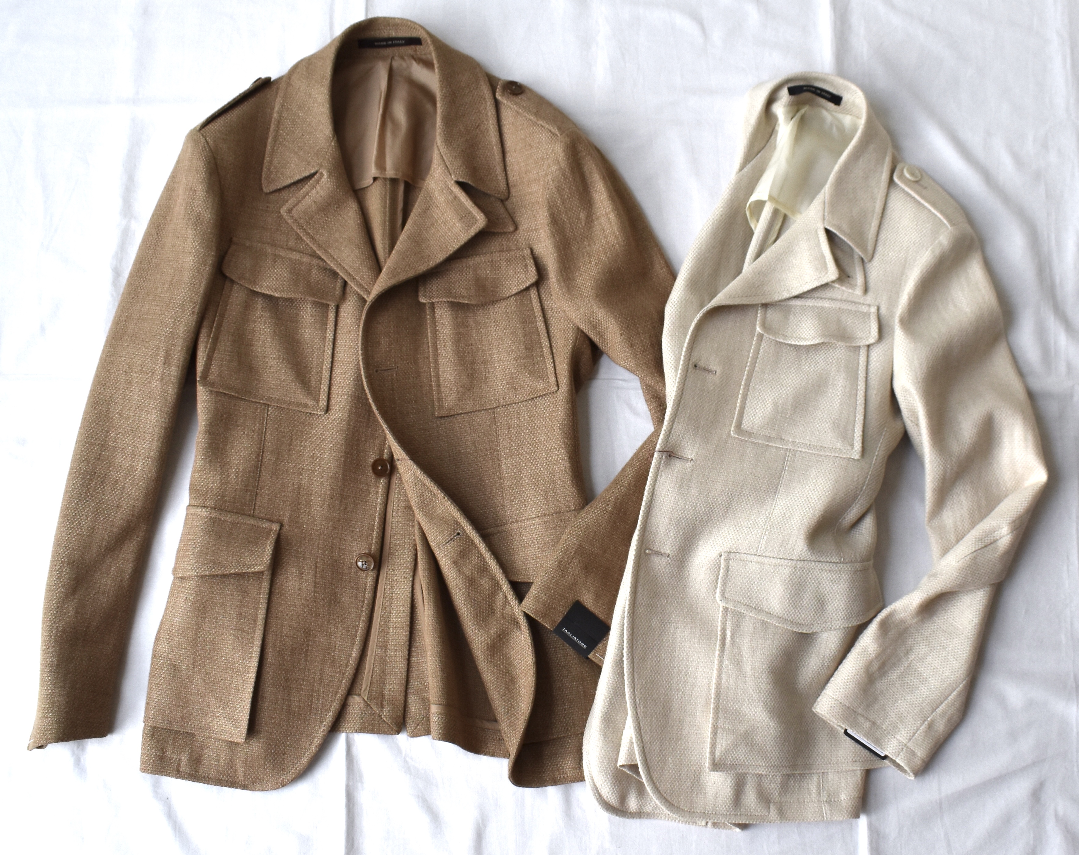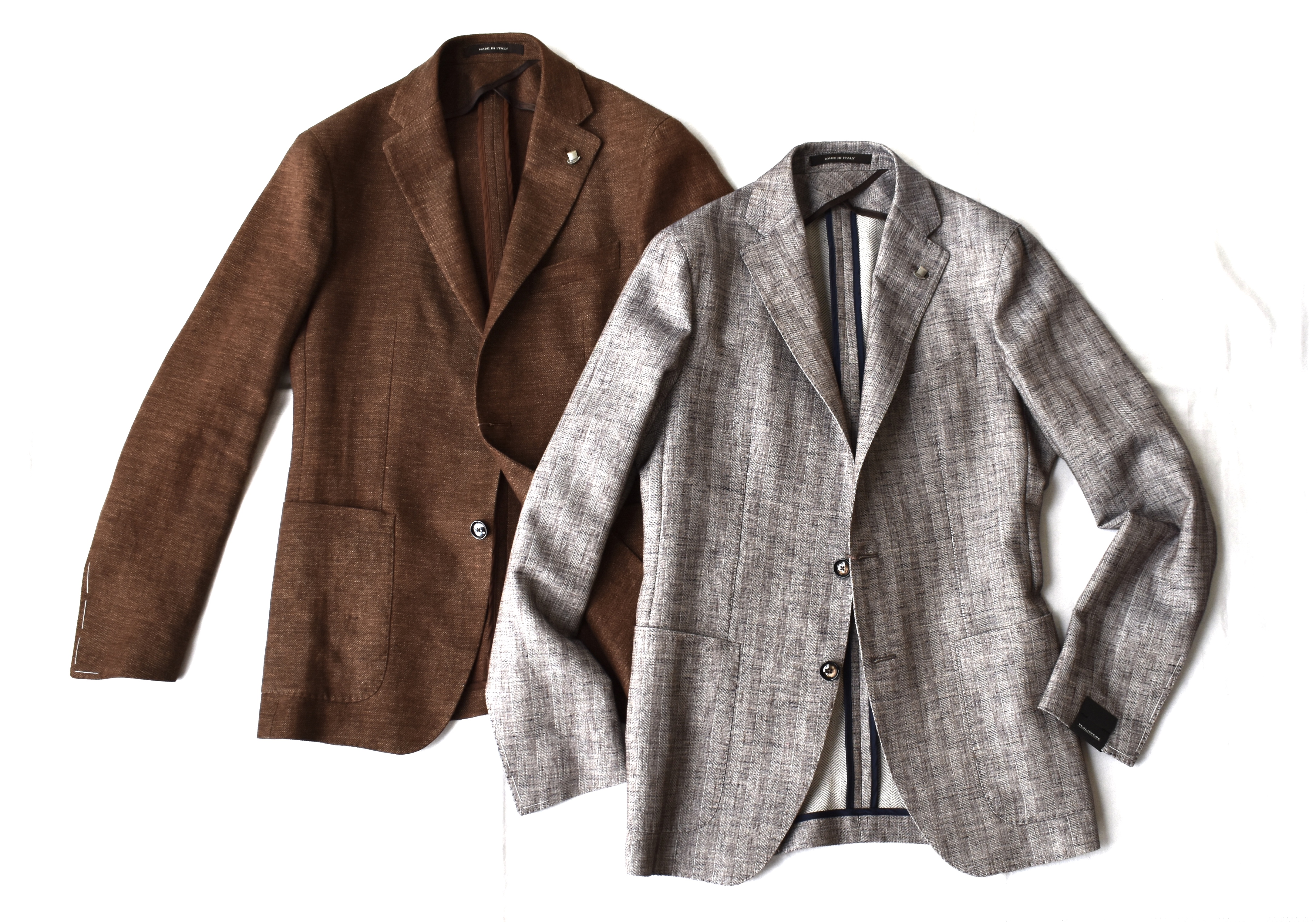 ブラウンのリネンツイルデラヴェジャケット(左)に、やや変わった色感のヘリンボーン柄ジャケット(右)。どちらも46サイズです。