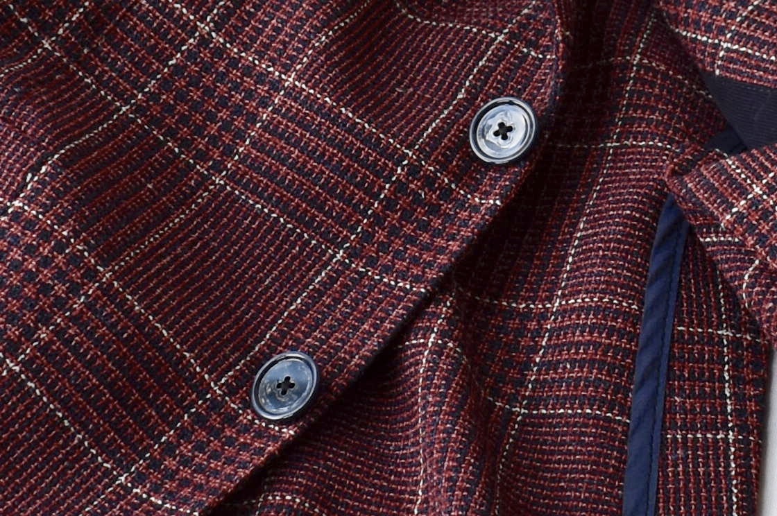 レッド(ボルドー)とネイビーを組み合わせたグレンチェックに、ホワイトのオーバーペンが走るジャケット。なかなかお目にかかれない雰囲気であること、秋の序盤もそのまま使えそうな表情を持つこと、これらが魅力となりそうです。