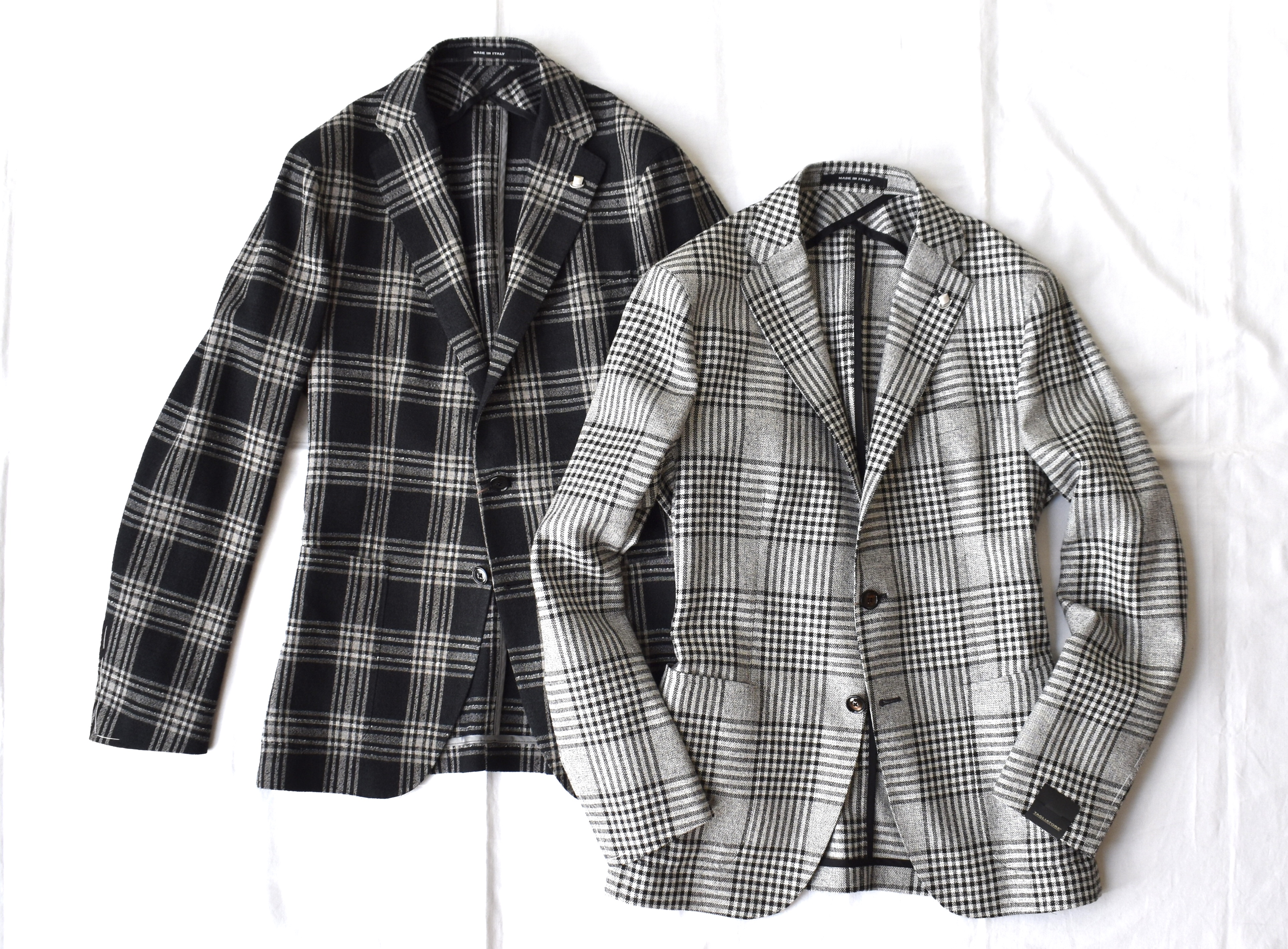 無彩色のチェック柄が続きます。ブラックベースグレンチェックジャケット(左)に、グレイとブラックの大柄グレンチェックジャケット(右)。ブラック・グレイのチェック柄ジャケットは、よりアーバンな印象。ワードローブにもう1着...と、そんな気持ちになる存在でしょうか。