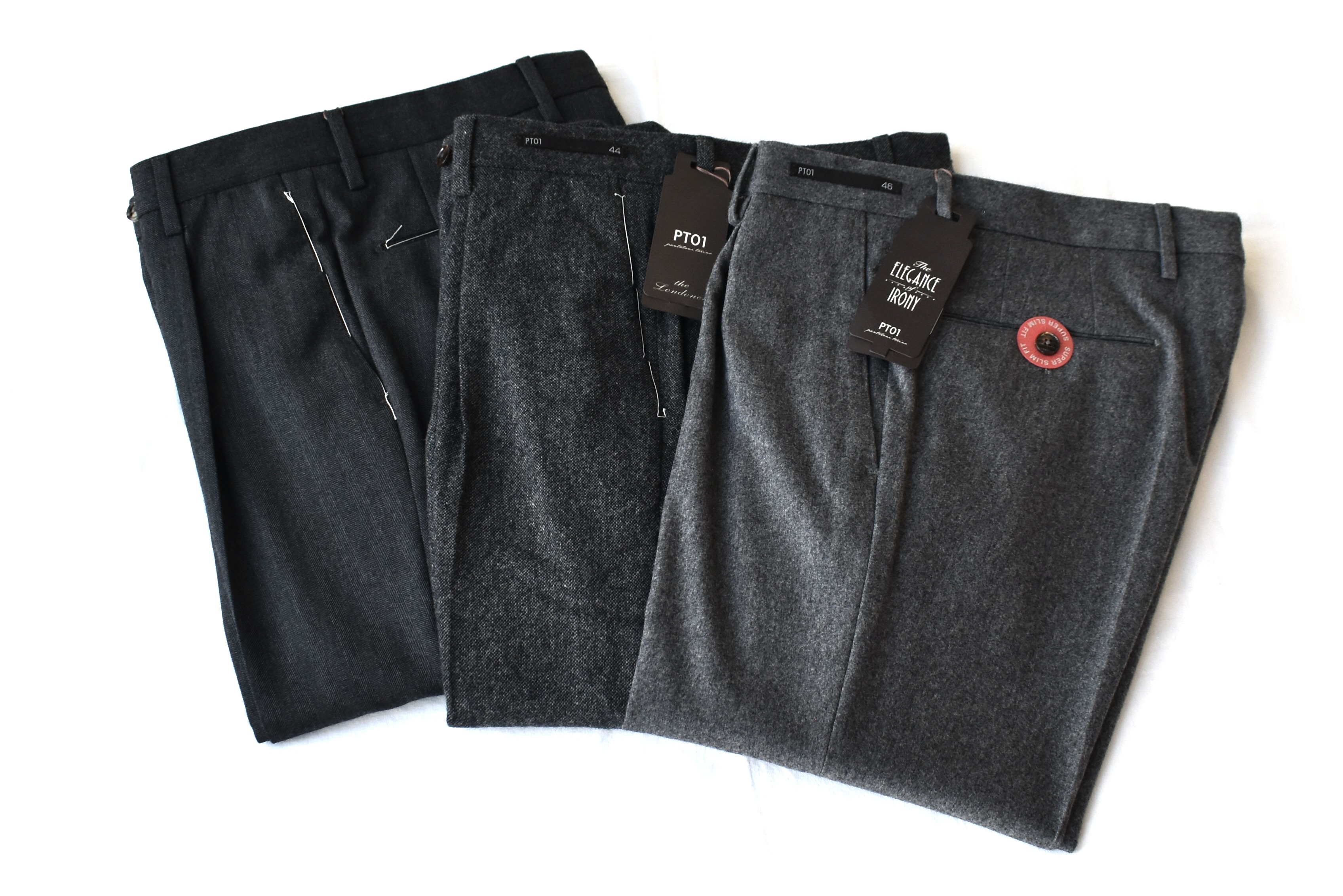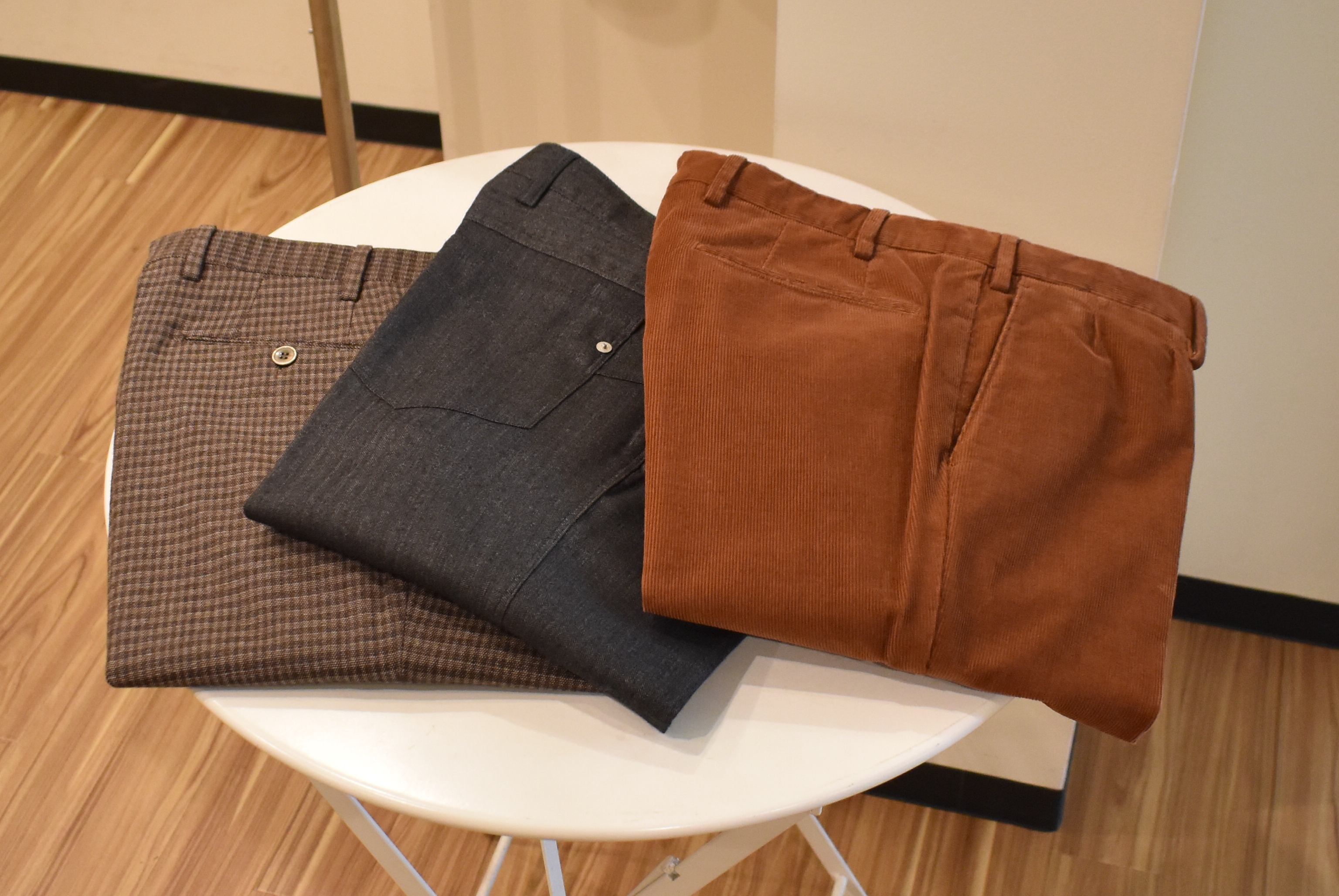 サイズに偏りこそありますが、定番的なグレイのスラックスも、左から毛羽の少ないヘリンボーン柄、それとは対照的に、起毛感のあるホームスパン、ミディアムグレイのフランネルと提案できる幅があります。