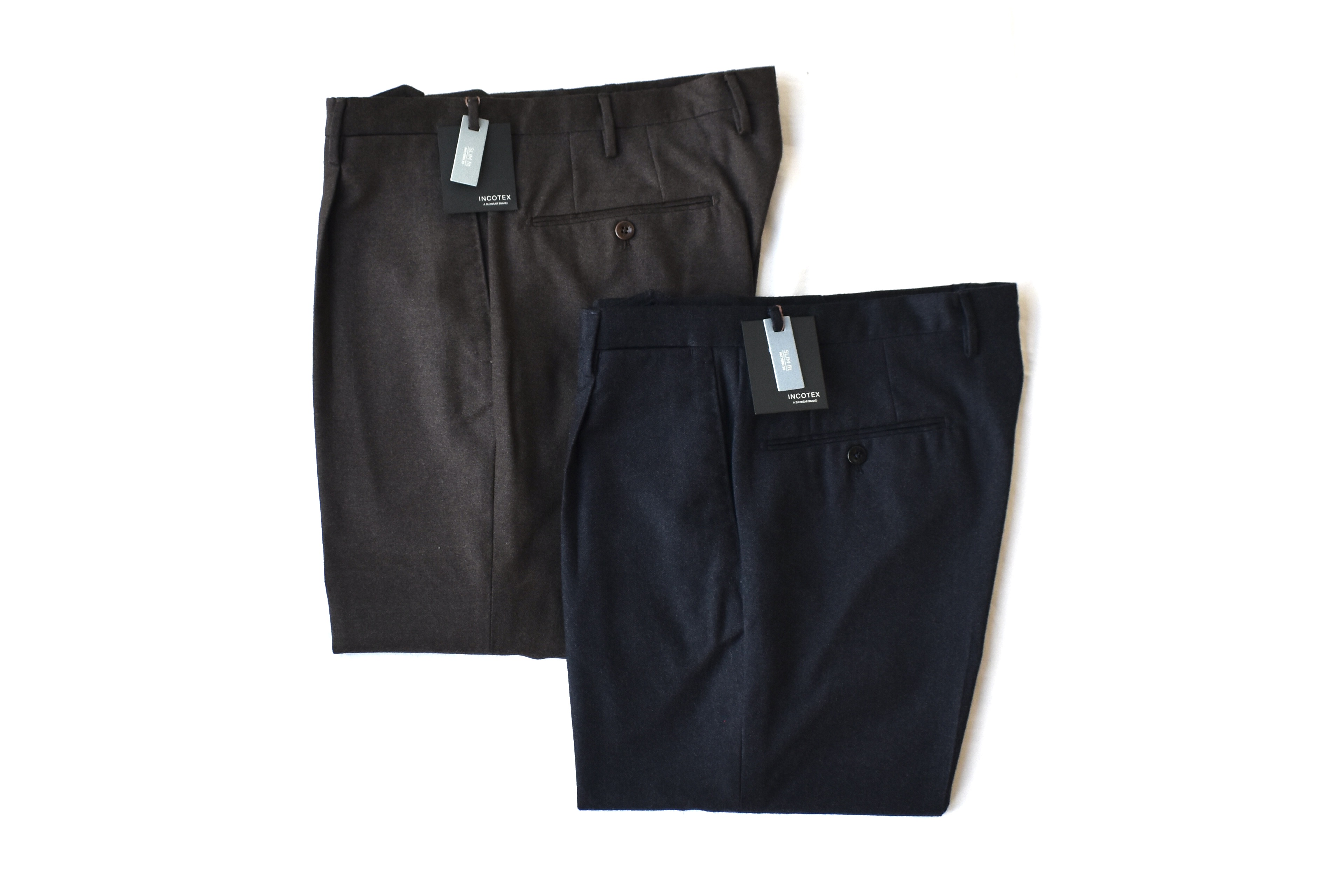折角のイベントです。持っていない、もしくは普段は選ばないものを、この機を活かし、選んでみるのも良いでしょう。グレイが揃った方には、バリエーションとして、ネイビー(ダークブルー)、またはブラウン辺りを狙ってみては如何でしょうか。INCOTEXのパンツです。