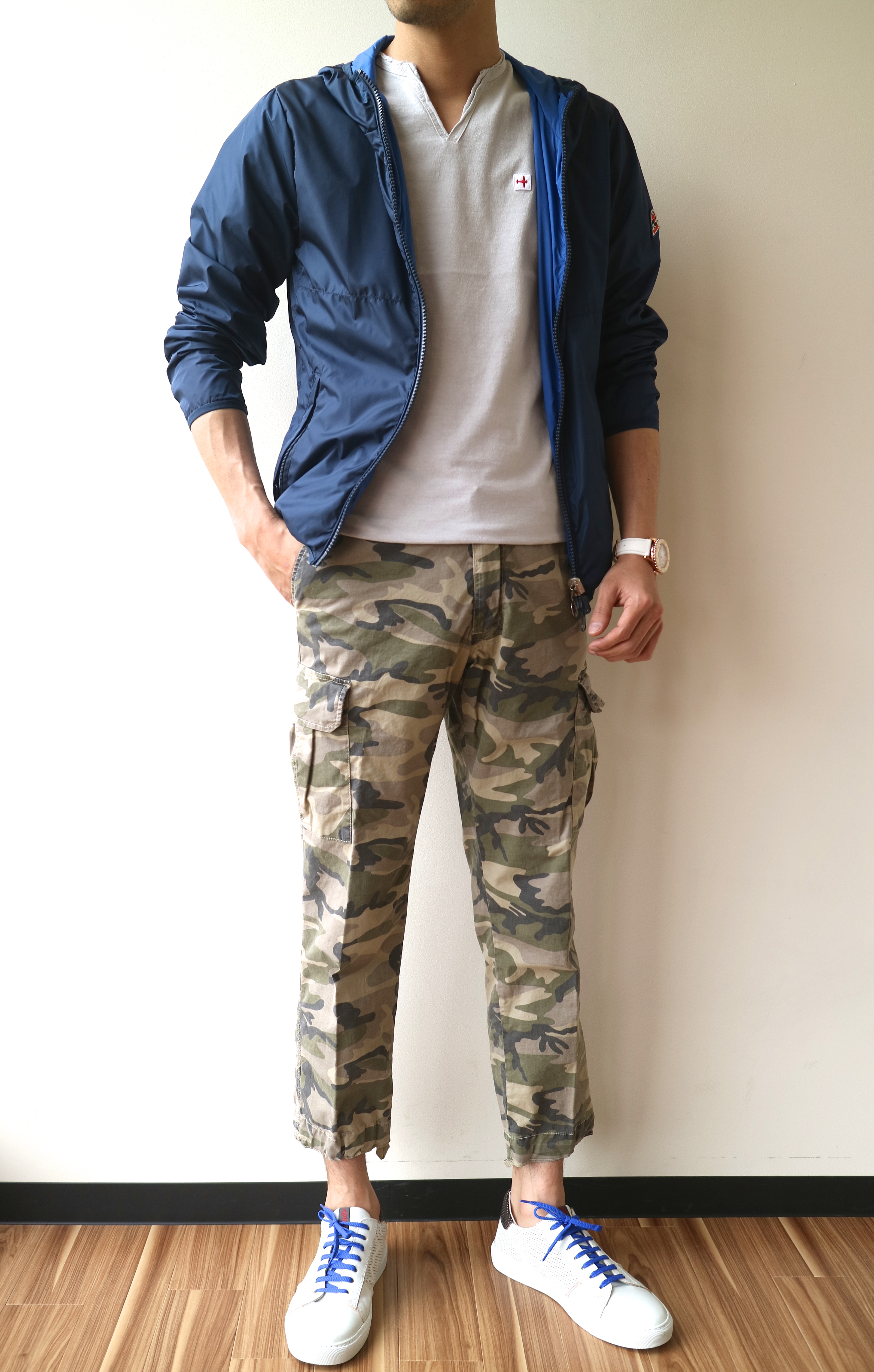 ワークテイストという共通項から、J.W.BRINEのカーゴパンツを着用。やはりこの2つのブランドは好相性のようです。幅広いオケージョンにハマるであろうinvictaのブルゾンを羽織り、靴はWally Walkerのレザースニーカーを合わせています。