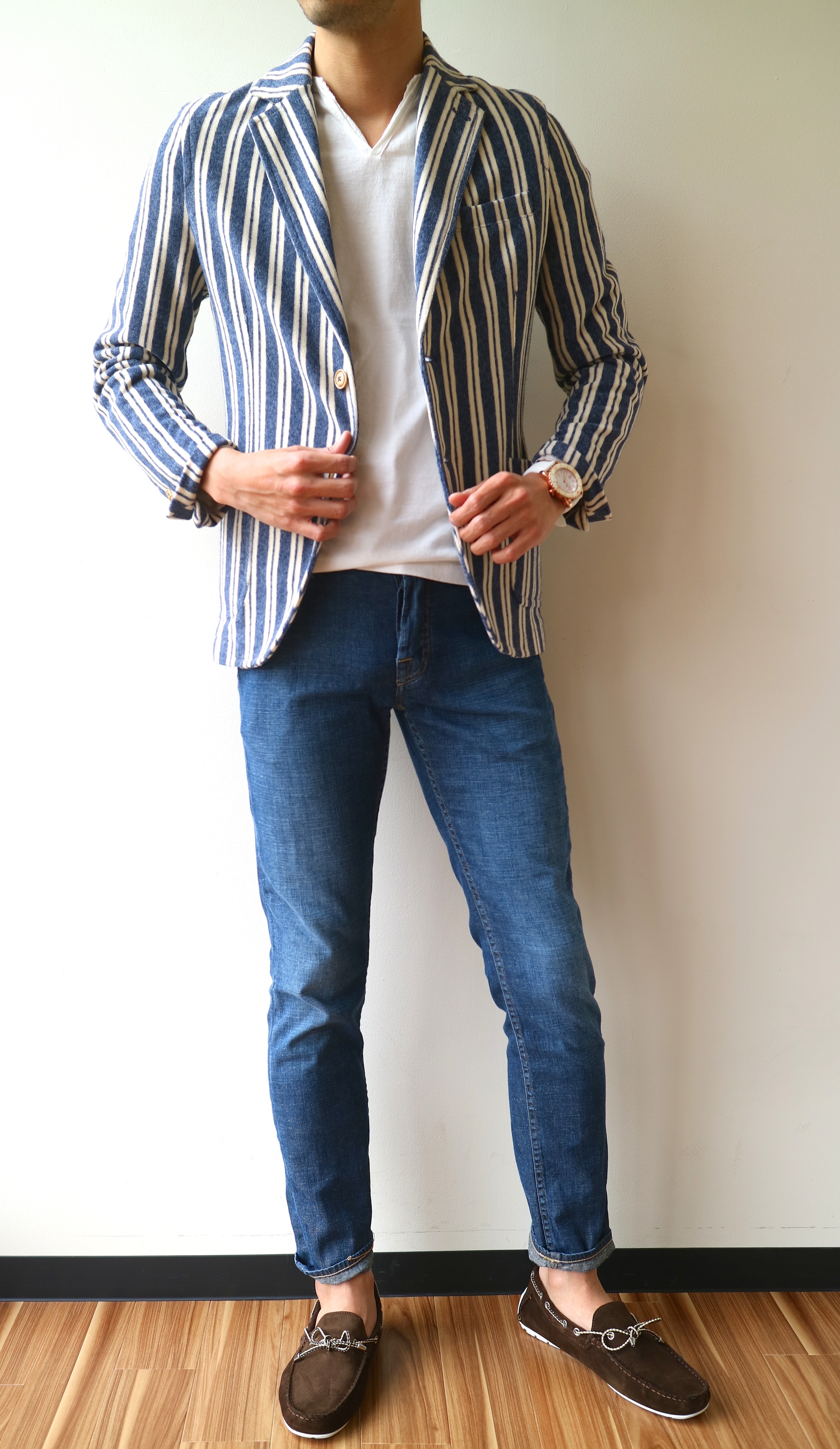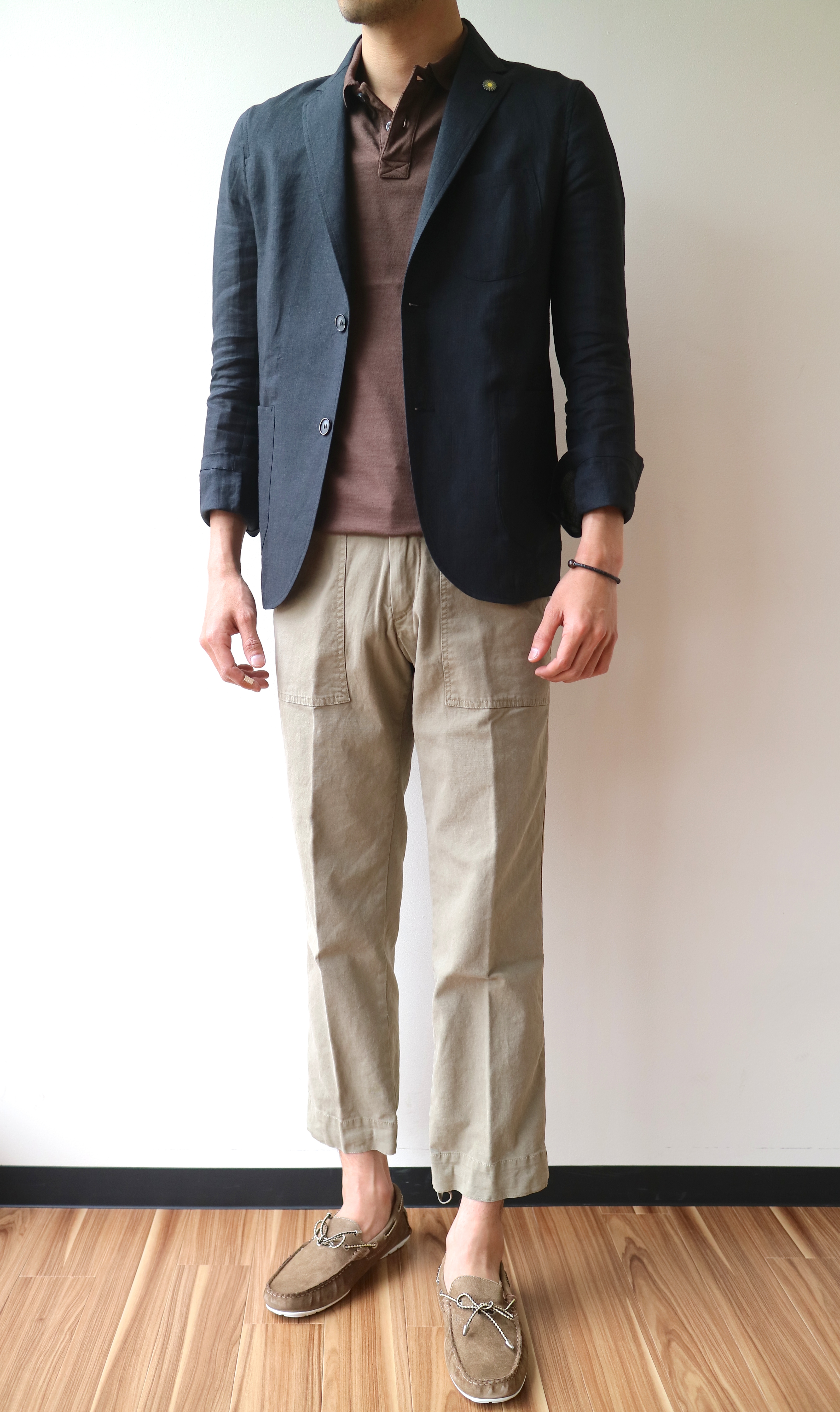 やはりJ.W.BRINEのベイカーパンツを選択してしまいました。独特のシワ感が魅力になりそうなGiannettoのリネンシャツジャケットに、ONLY ONEのドライビングシューズ。左手にはM.Cohenのパール×ビーズブレスレットを合わせています。
