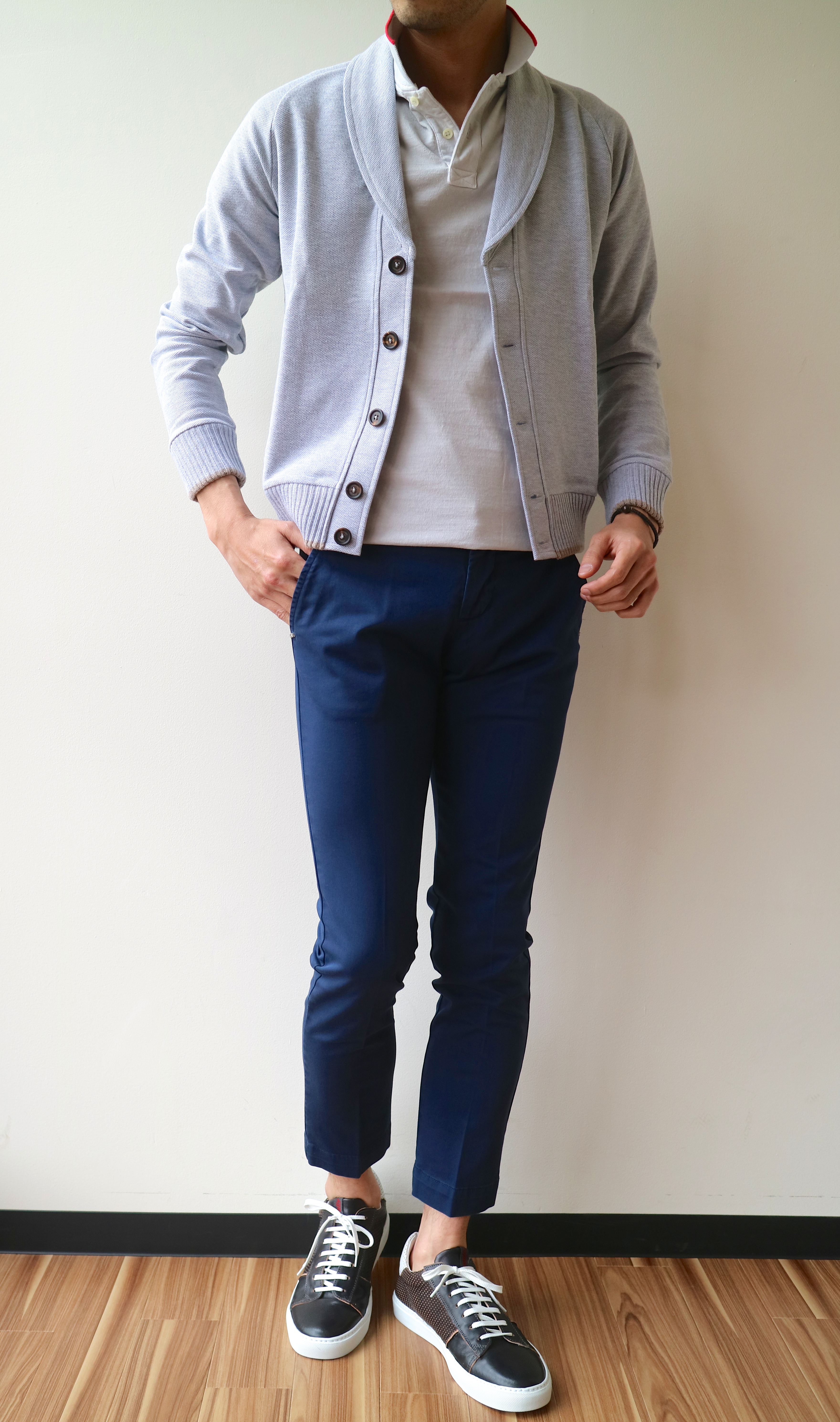 もちろん、entre amisの細身テイパードパンツや、eleventy(羽織っているのは、鹿の子ブルゾン)のようなアーバンかつ上品めなコーディネートにも、巧く溶け込みます。その他、靴はWally Walkerのレザースニーカーです。