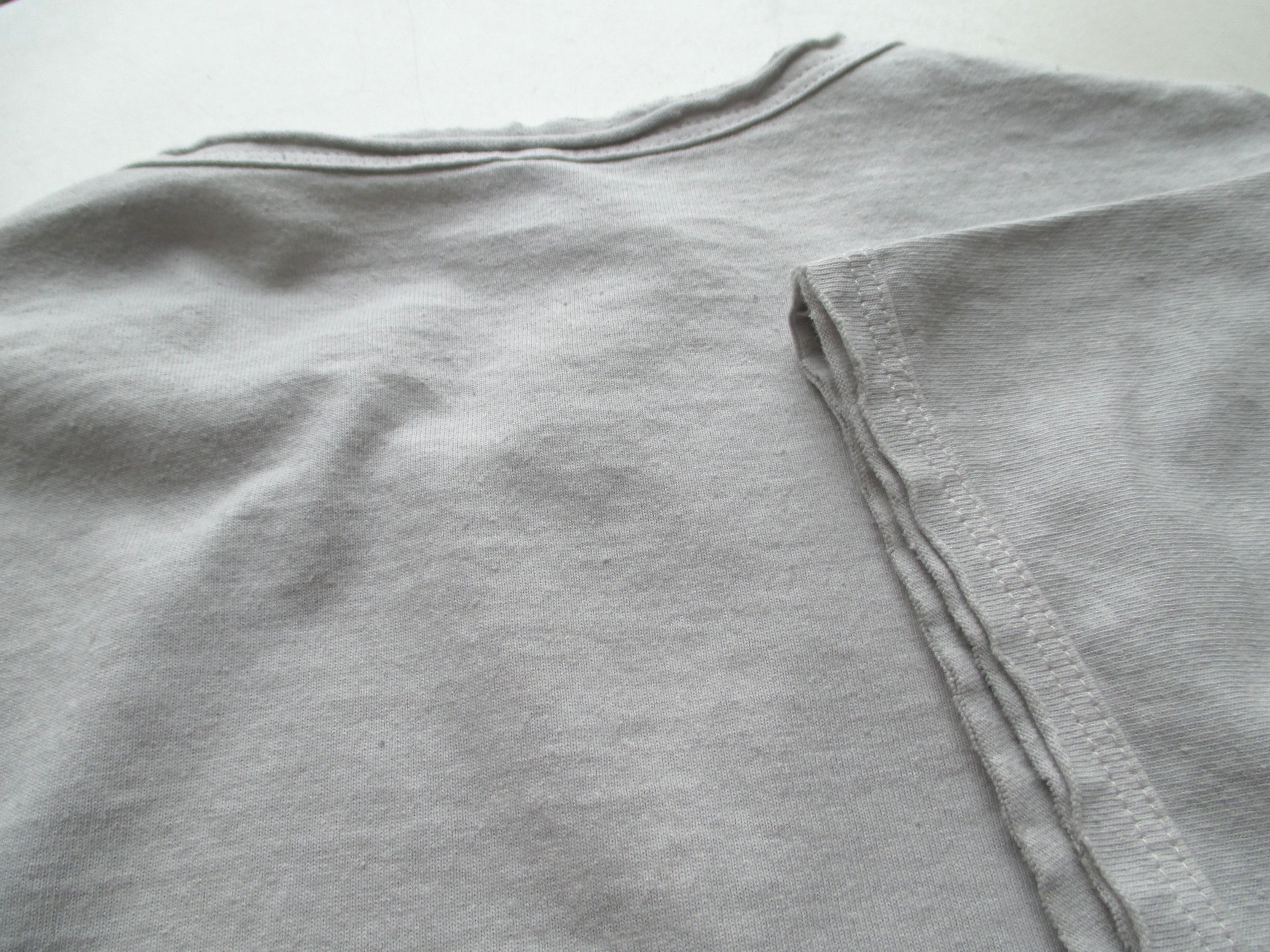 ヘンリーネックの釦を廃してしまうという発想もユニークですが、襟元や裾口のデザインにも注目です。切りっぱなし風で、自然なロールがかかった生地端に、デニムの裾口のようなヴィンテージ加工。生地自体も、控え目ながら随所に毛羽立ちがあり、やはりヴィンテージ的な作り込みは秀逸です。