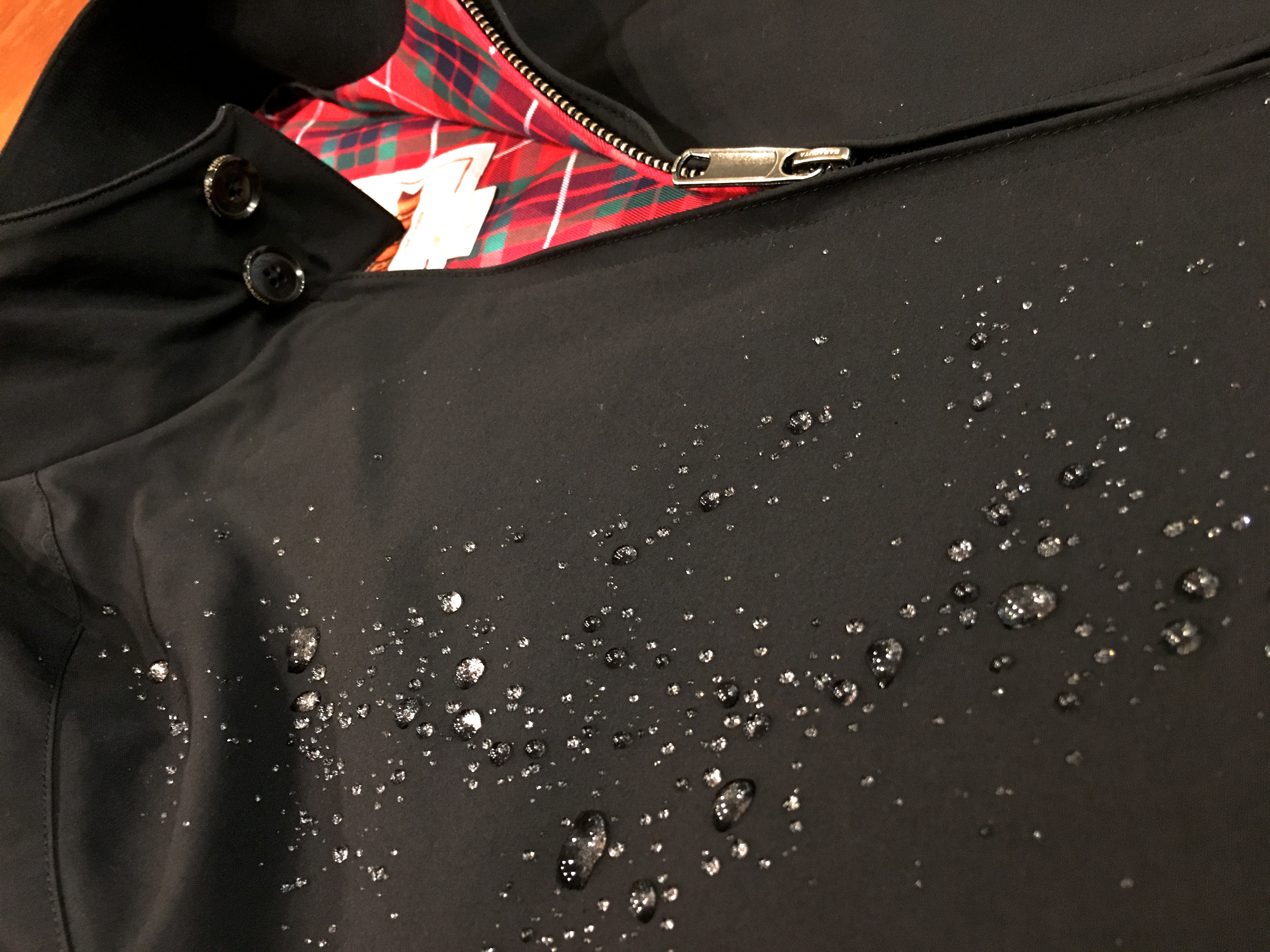 生地は高密度コットン50%ポリエステル50%の撥水性の高い生地になっています。上の写真は私物のバラクータに水をかけた写真ですが、しっかりと弾いてくれ、レインウェアとしても活躍します。