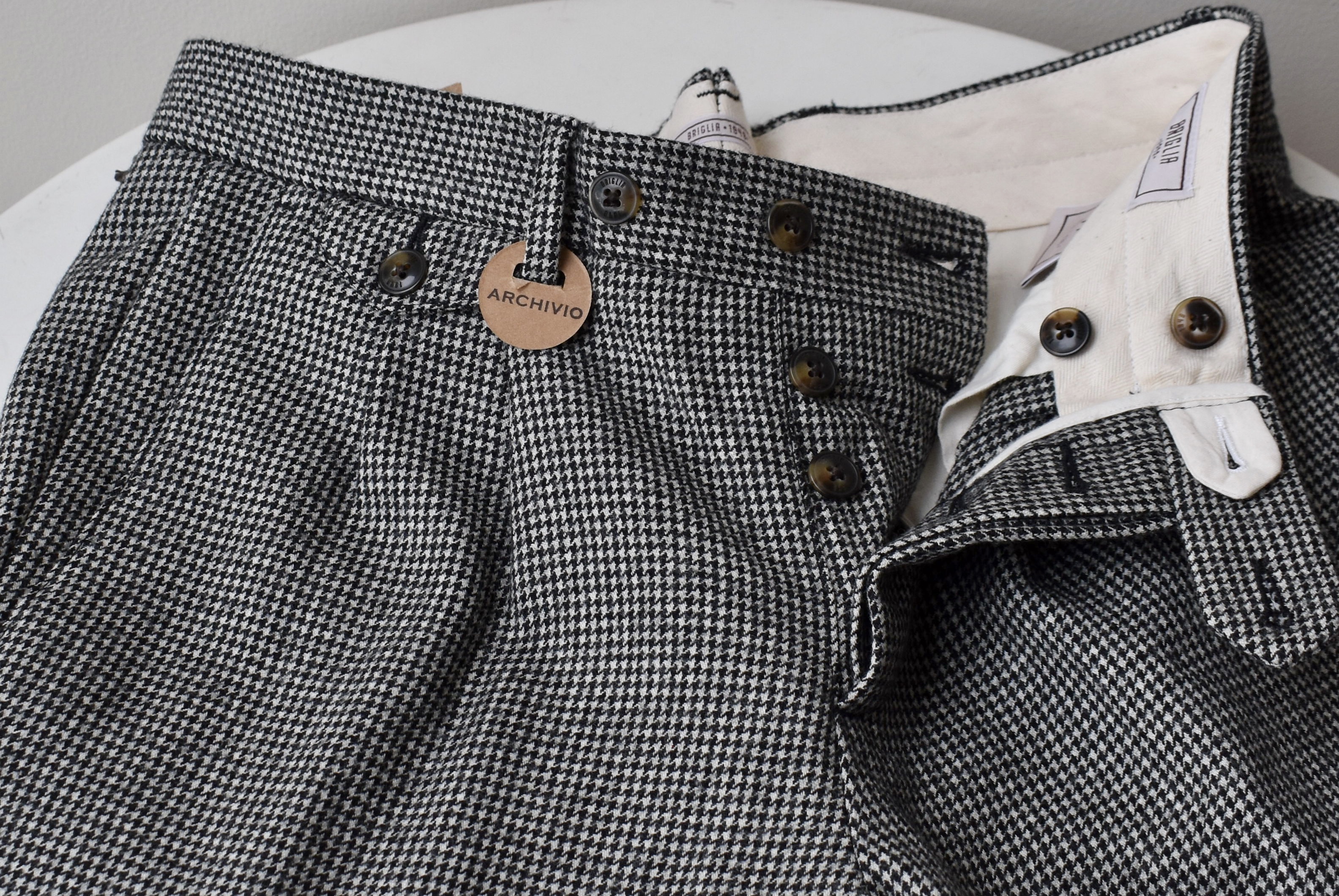 コレも、いつもと違うタグが付いています。「Archivio/アルキビオ」。アーカイブのことです。幾重に生地をストックしているパンツ専業ファクトリーだからこそ、の生地。クラシックな匂いは十分でしょうか。