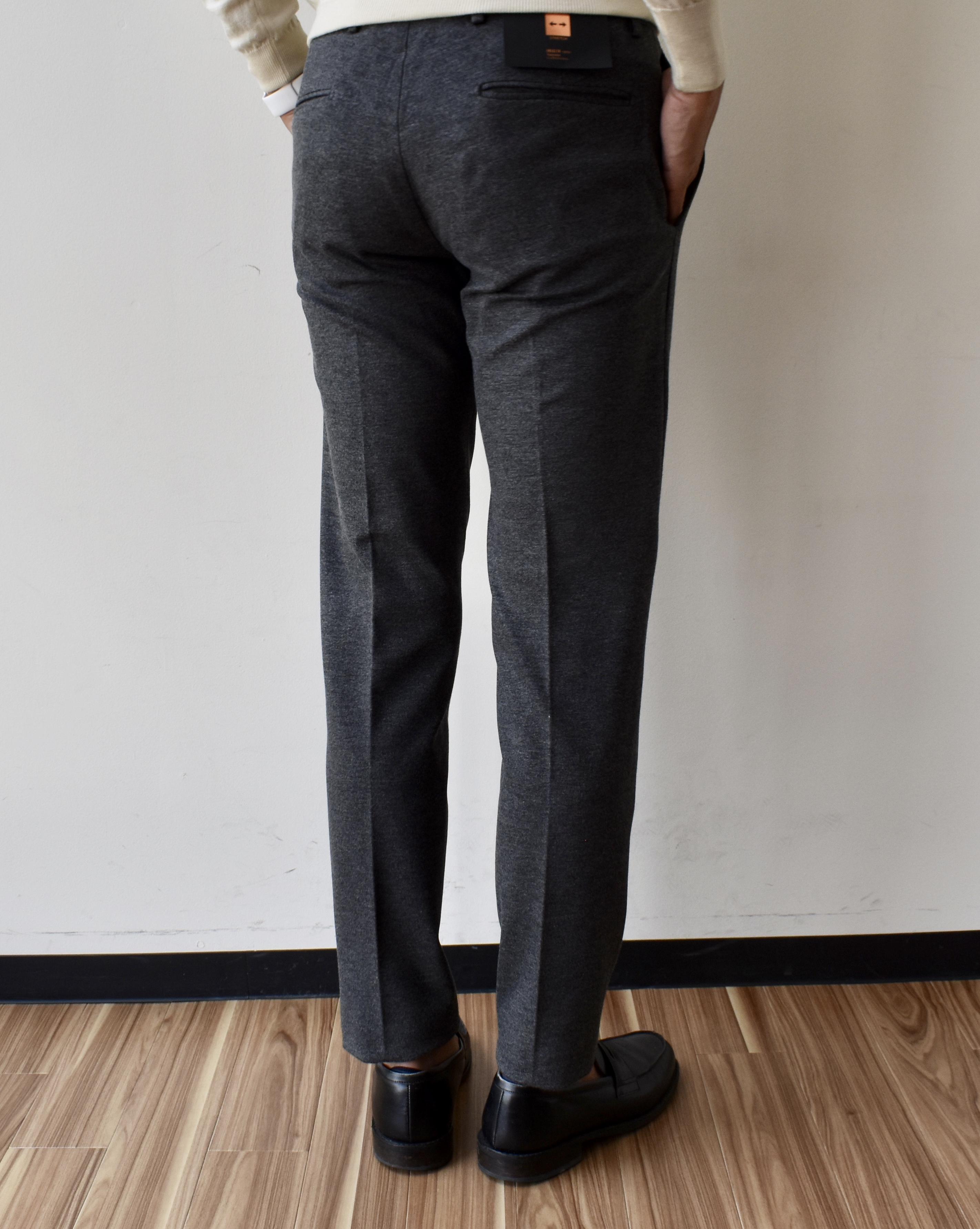 ミディアムグレイのスラックス。フランネルパンツのような表情を覗かせておりますが、