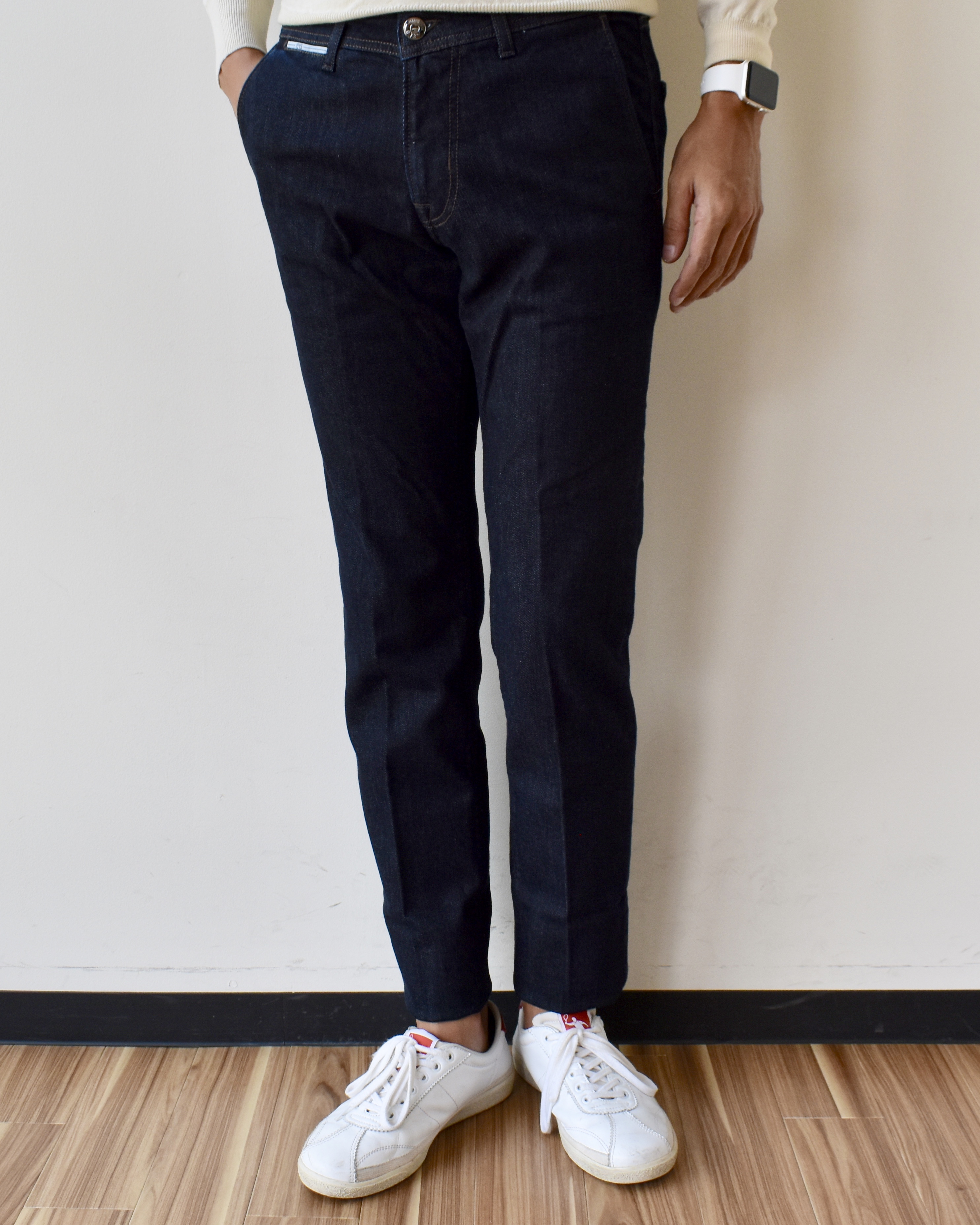 どこのデニムかと言えば、パンツの【BRIGLIA 1949/ブリリア】。パンツ主体のブランドですが、シンプルで尚且つグッド プライスなデニムを見つけてしまった為、ついついです。最も気に入った点は、横ポケットのスラントポケットであること。手を入れた姿がエレガントに見えるこのポケットは、かねがね店頭で好評を得ています。