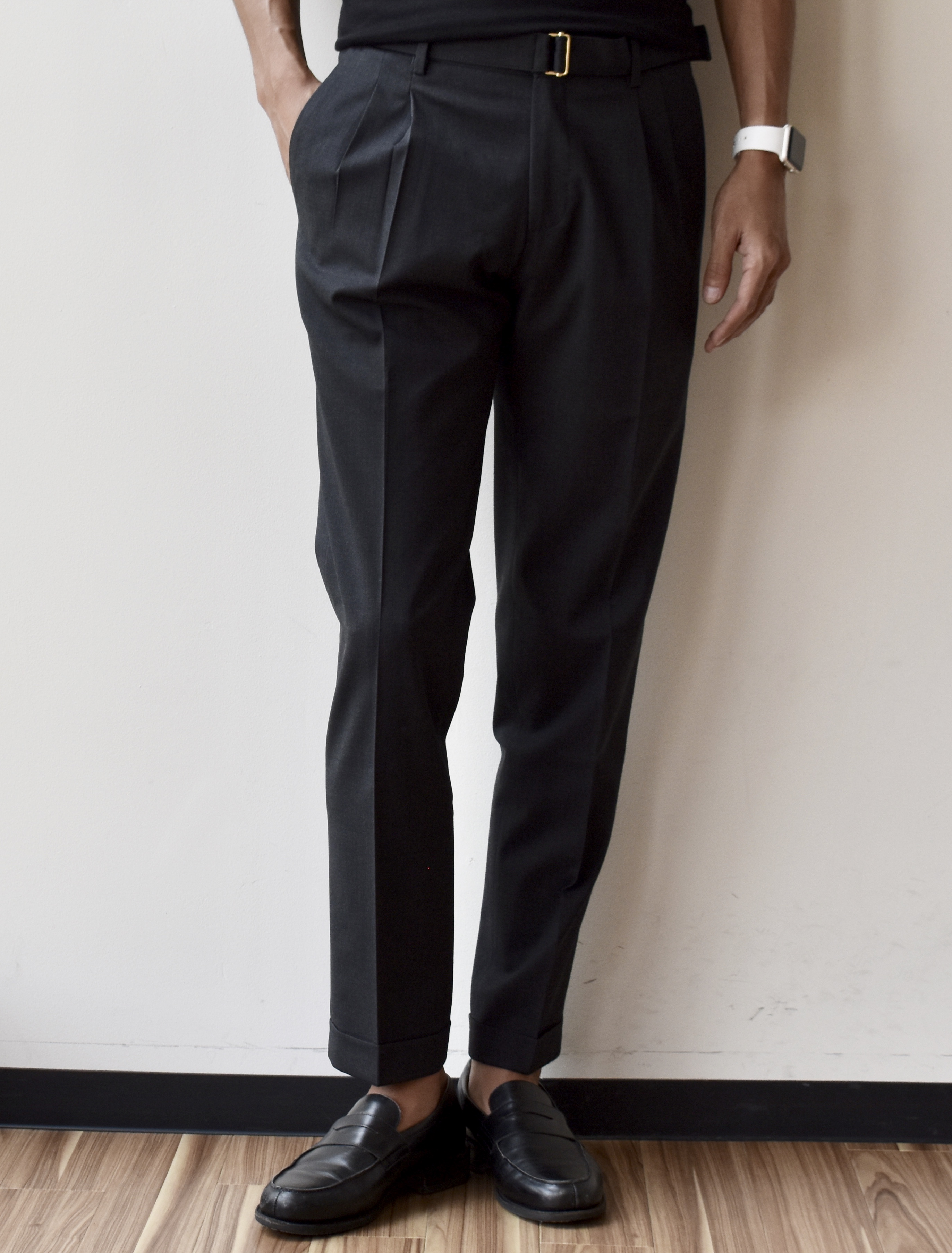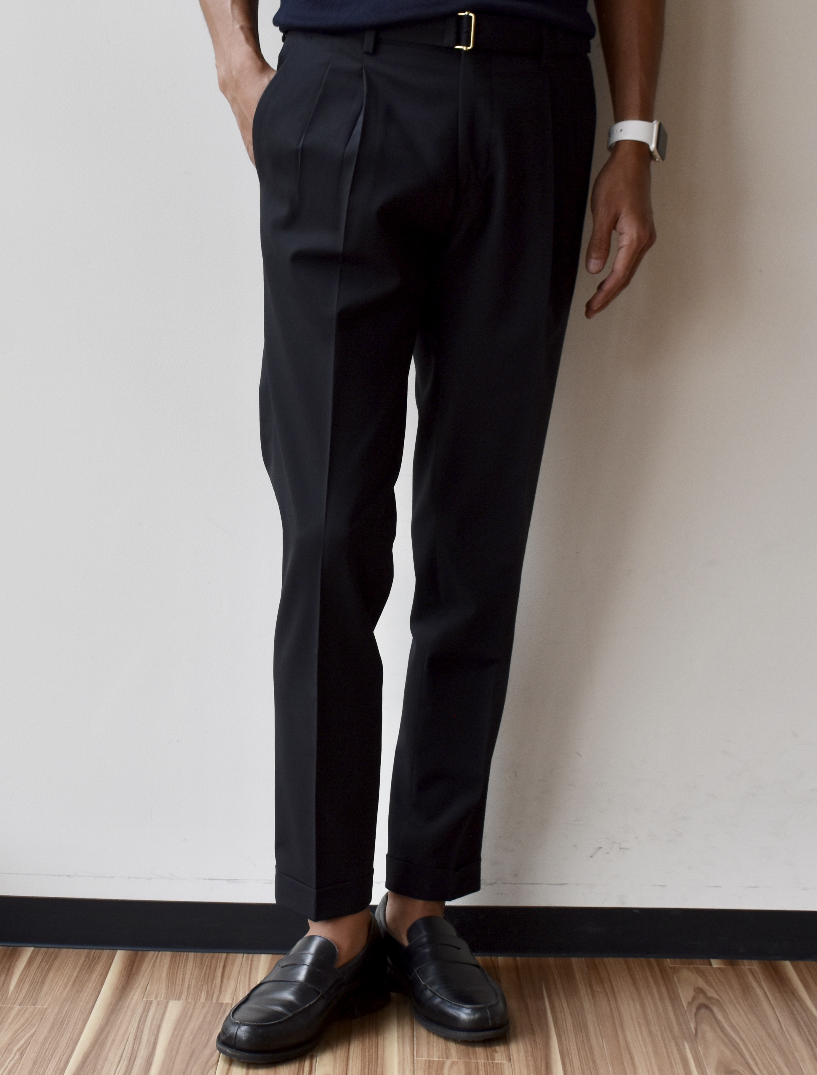 ツープリーツで現在(いま)っぽさをアピールしつつ、適度に細身のシルエット。ベーシックな1本だけに、細すぎない点が気に入っております。