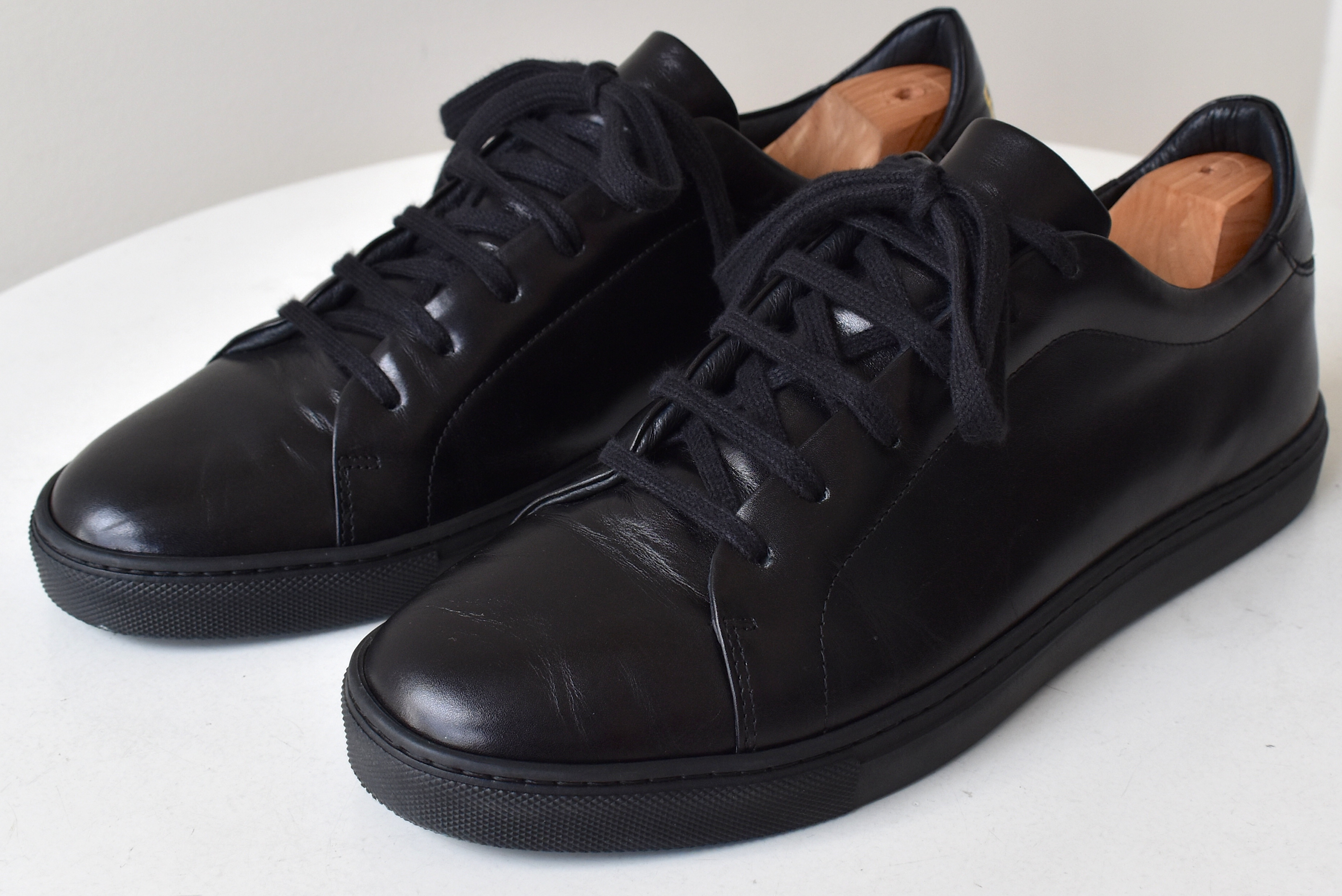 購入したのは、「SM51」。やや厚みのあるカーフレザーを用いた、シンプルなレザースニーカー。第一印象は、「良くも悪くも普通〜」でしたが、足を通してみて印象は大きく覆ります。少々大袈裟ですが、びっくりするくらい履き心地が良いのです。具体的にどう良いのかは、以前の記事を参照していただくとして、これを黒の革靴ライクに使おう!、そう思い、購入を決めたのです。